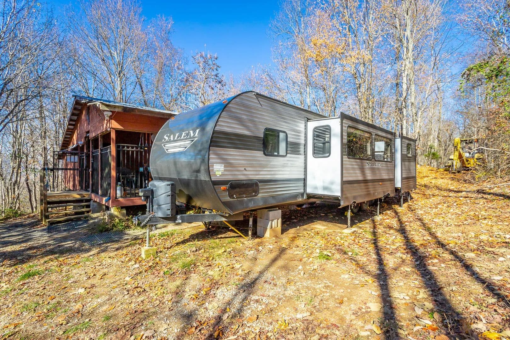 Camp on site inside the newer 2019 33ft Travel Trailer with deck to cabin.