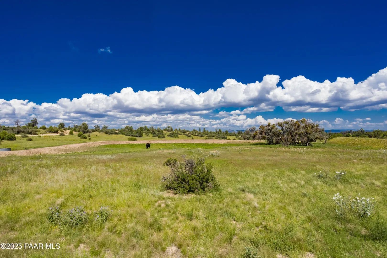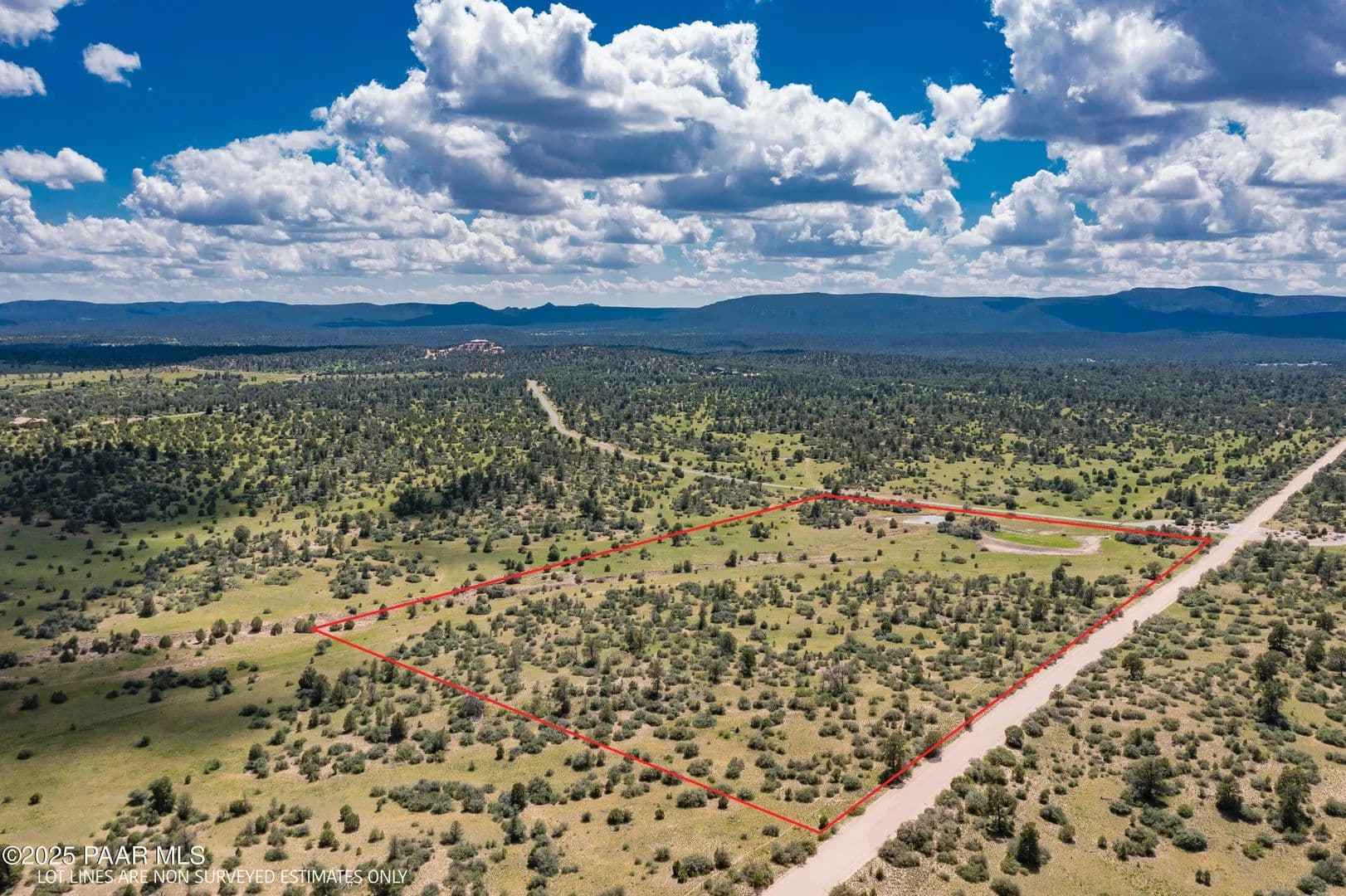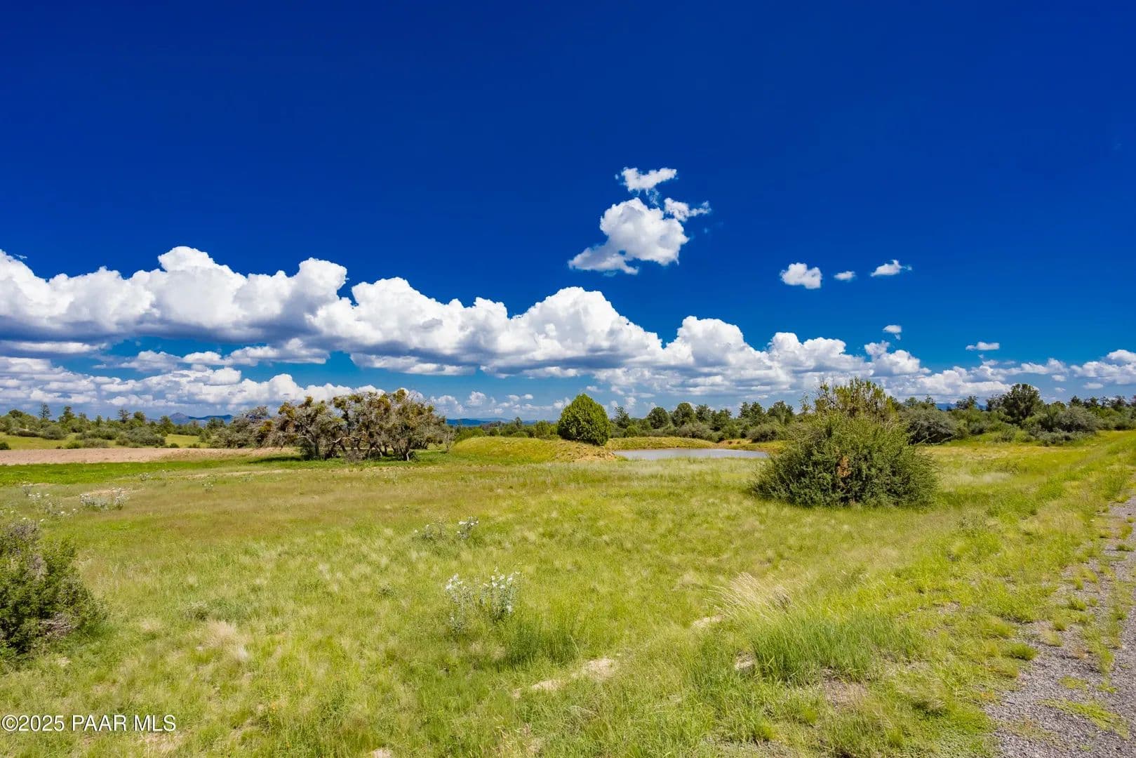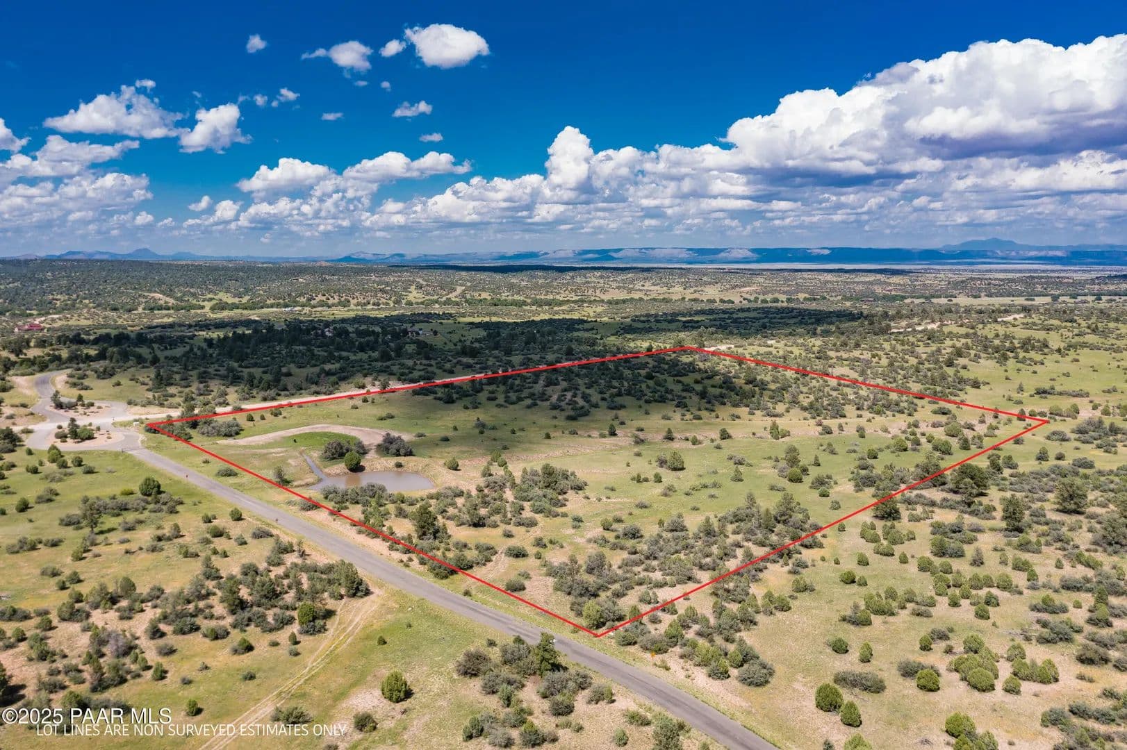 Spectacular 37-acre parcel in the gated Las Vegas Ranch Estates, offering paved roads, underground utilities, and access to Prescott National Forest within 1/4 mile--ideal for trail riding, hiking, or ATVs. The property features south and east slopes, an open meadow, scattered Pinion Pines, multiple elevated building sites, and outstanding views of Granite Mountain and the San Francisco Peaks. A seasonal pond attracts abundant wildlife. A private well is already installed and tested at approx. 60 GPM (per driller's log). Underground APS power and fiber-optic cable are available at the property line. This rural community of custom homes is located approx. 40 minutes from Prescott for convenient shopping, dining, and services. Parcel may be subdivided into up to three lots; topography best supports two. Or enjoy the full 37 acres for your own private mini-ranch. A beautiful setting with exceptional potential!