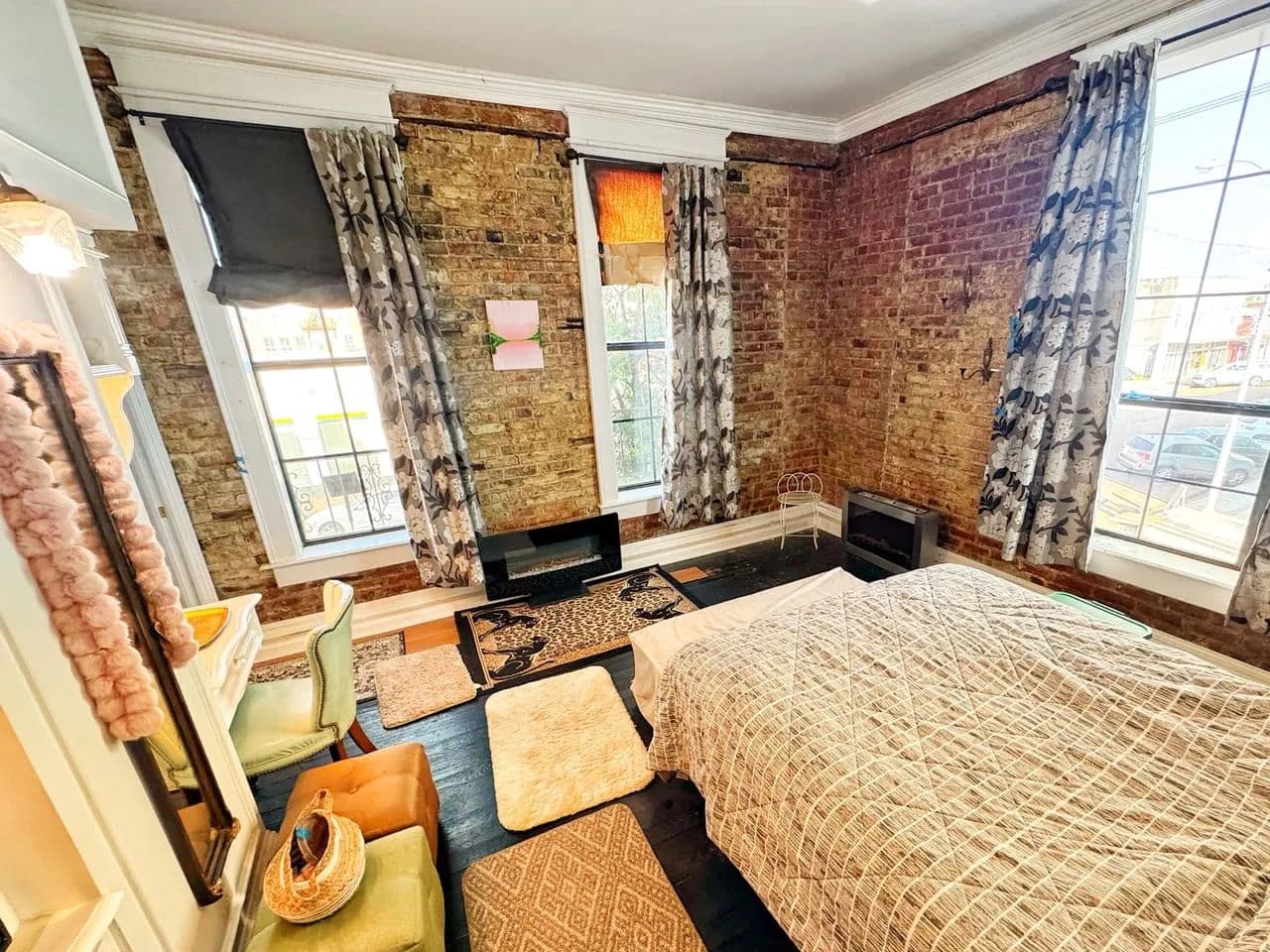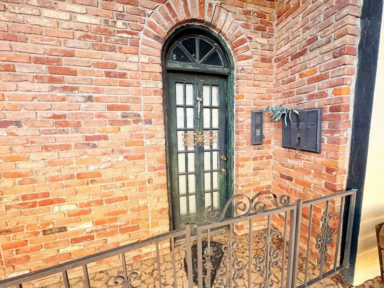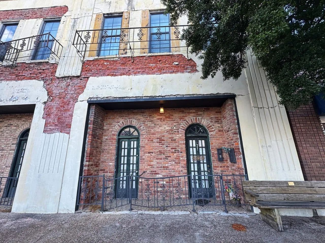 Brick exterior, wrought iron balconies and gates, arched French doors, transom windows, and interior exposed brick