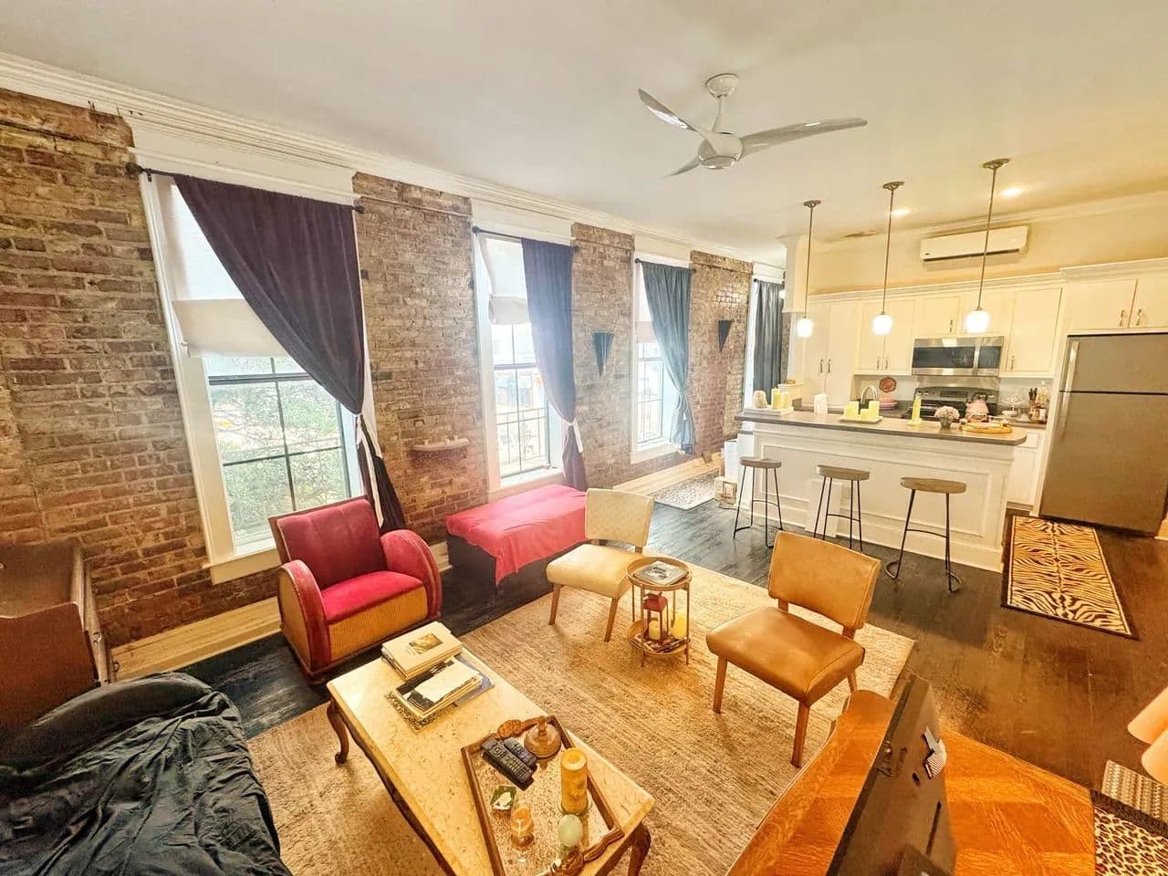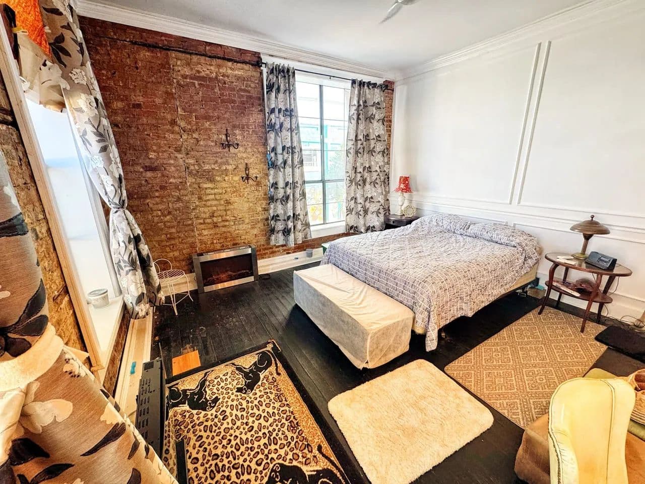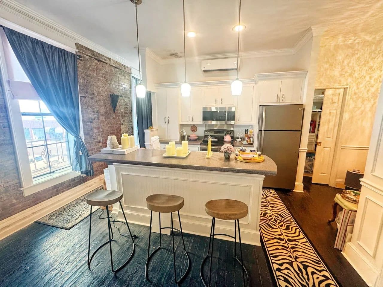Tall ceilings, exposed brick, crown molding, large windows, and generously furnished!