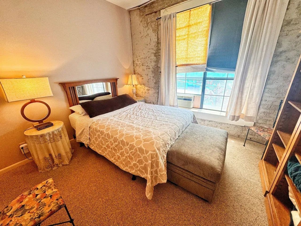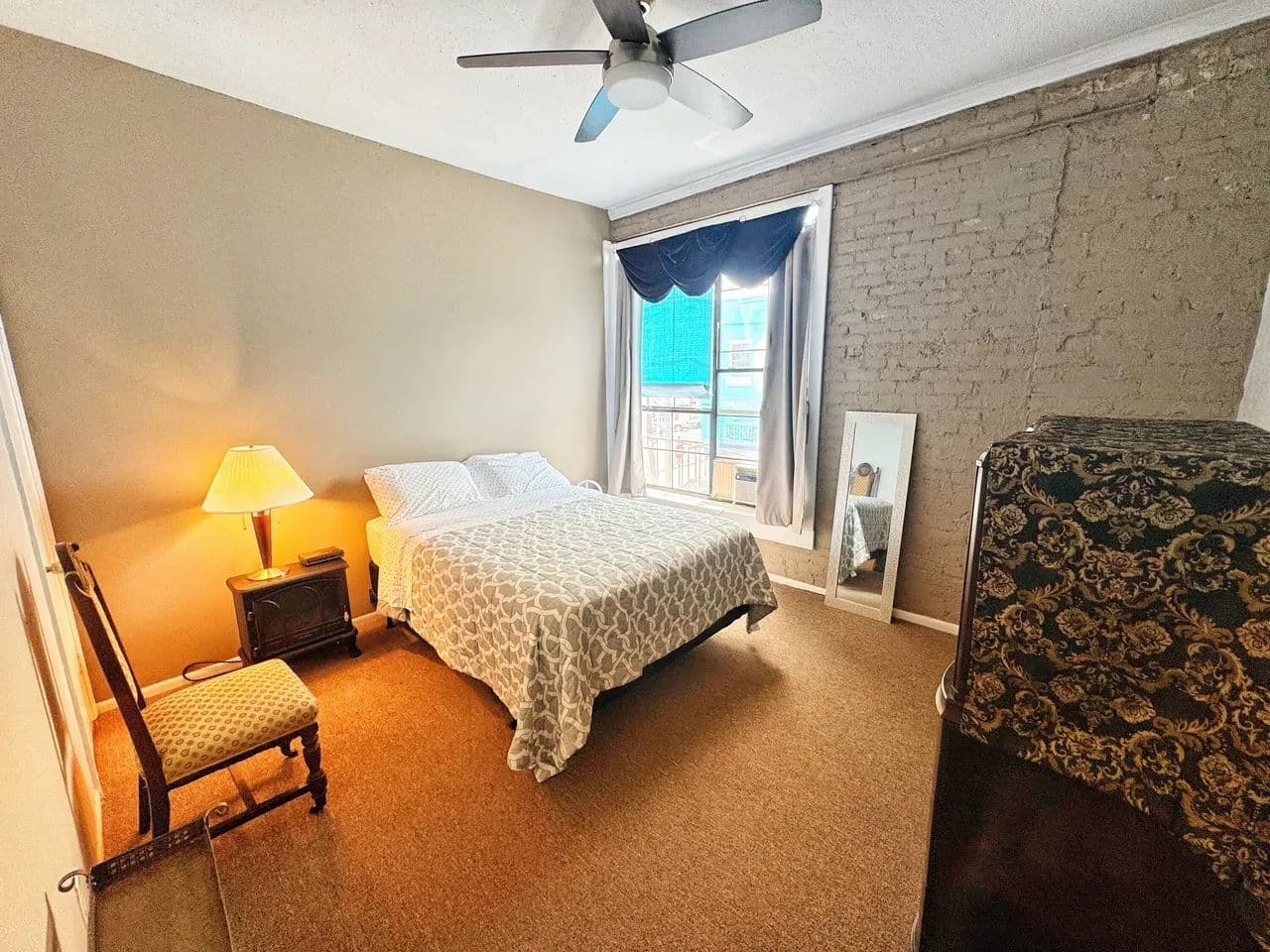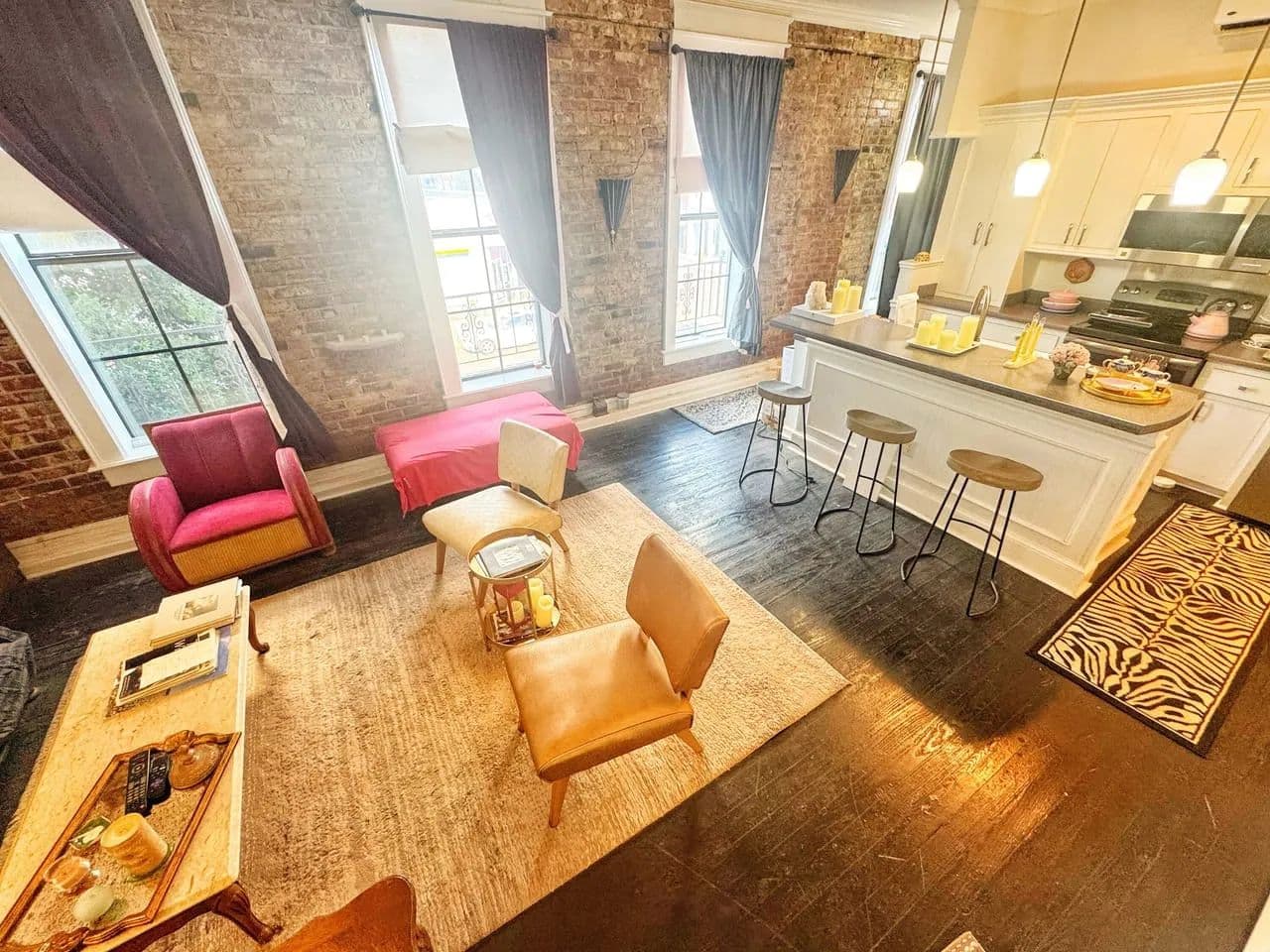 Tall ceilings, exposed brick, crown molding, large windows, and generously furnished!