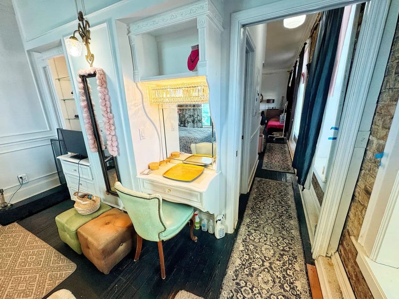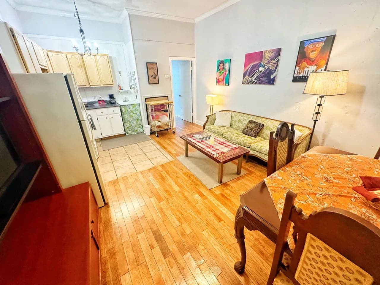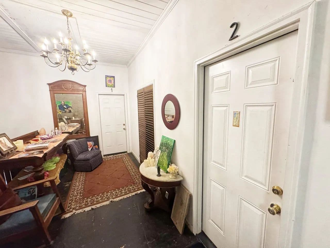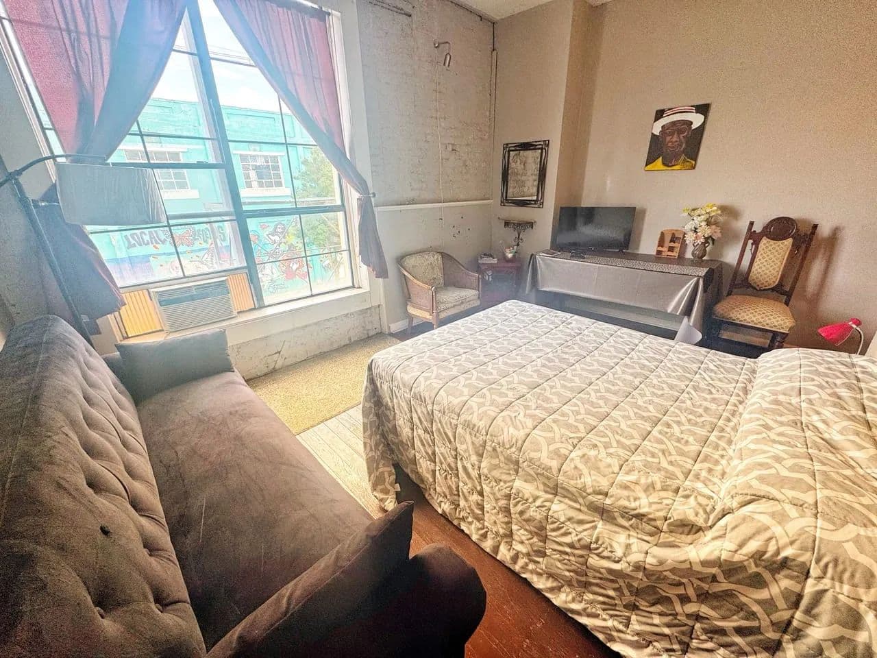 Upstairs are four unique one-bedroom apartments that come generously furnished, each with its own personality and charm. The premier corner suite features six oversized windows overlooking Delta Avenue, filling the space with natural light and the unmistakable sound of live blues drifting up from the street below. Original hardwood floors, exposed brick, antique lighting, and tall ceilings make this unit a true retreat above the music. The remaining apartments offer kitchens, living spaces, and full baths—ideal for long-term tenants, short-term guests, or an owner-occupied setup.