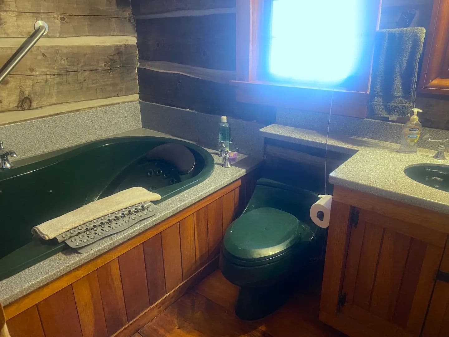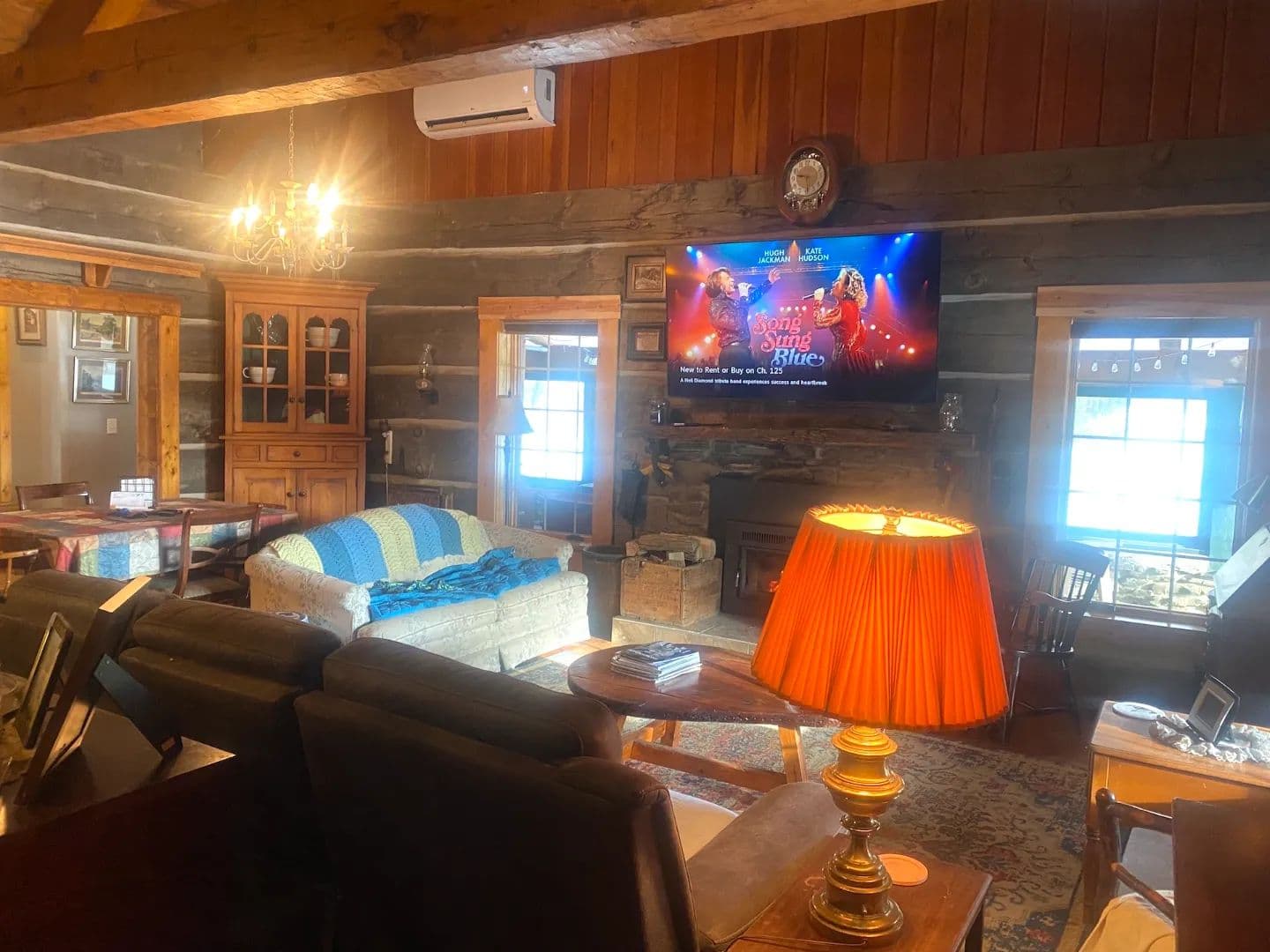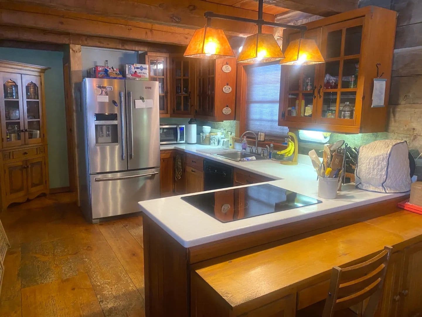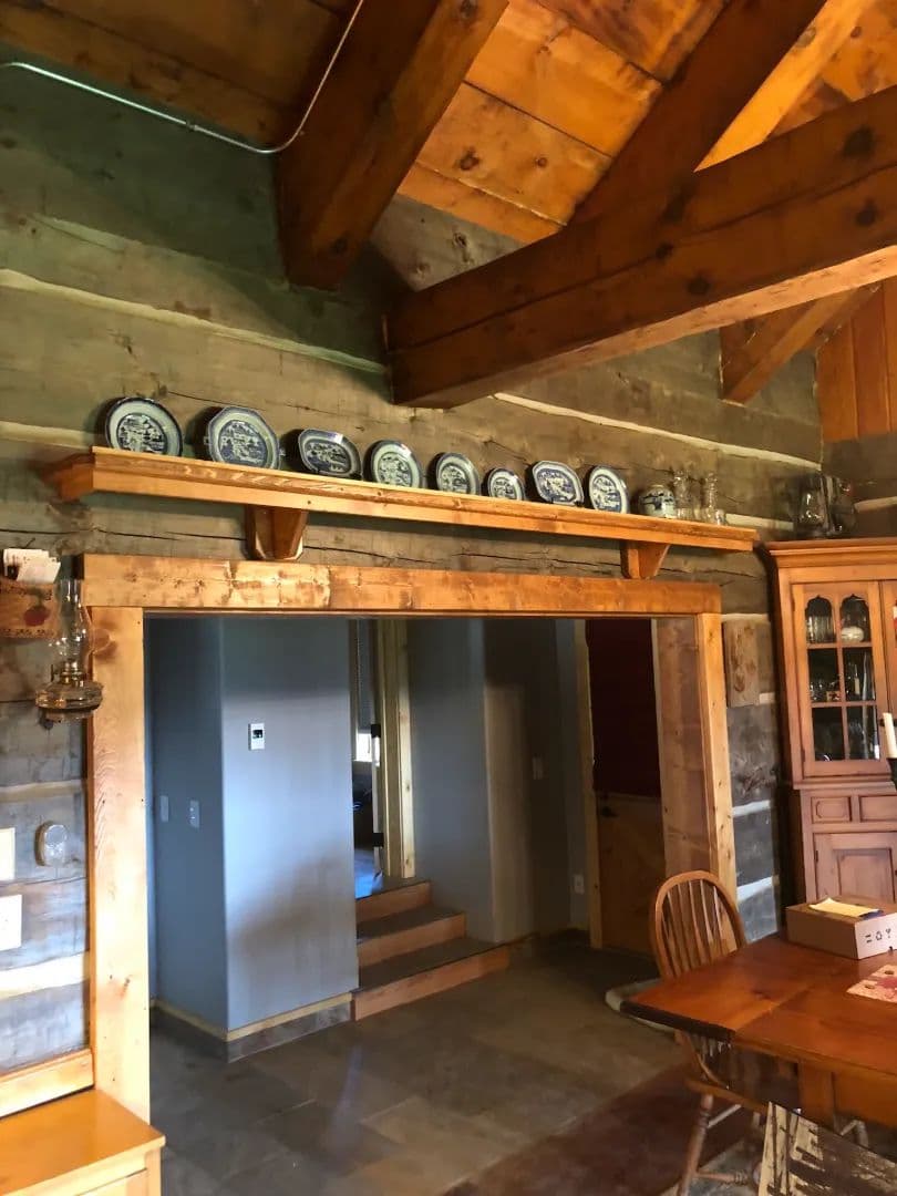 A covered walkway with electric in-floor heat welcomes you to the entryway of this remarkable home. Inside, you’ll find astonishing log walls that are 20-plus inches wide, rustic beams throughout, and wide natural wood floors that add warmth and character. The living room features a stunning man-made creek stone fireplace creating the perfect cozy gathering space.
