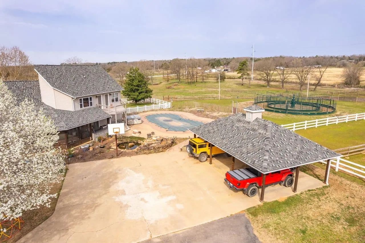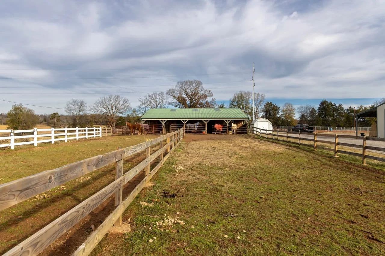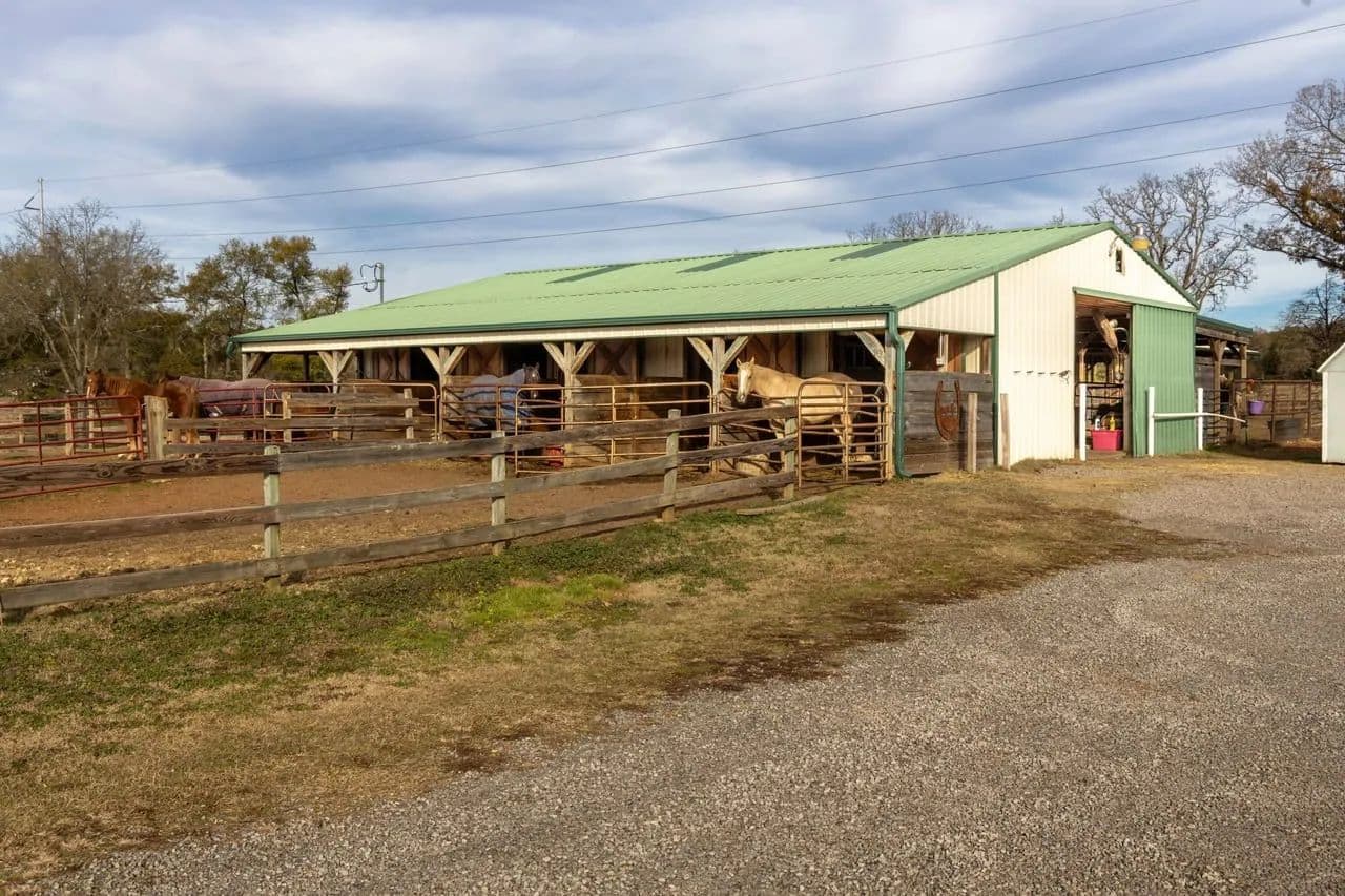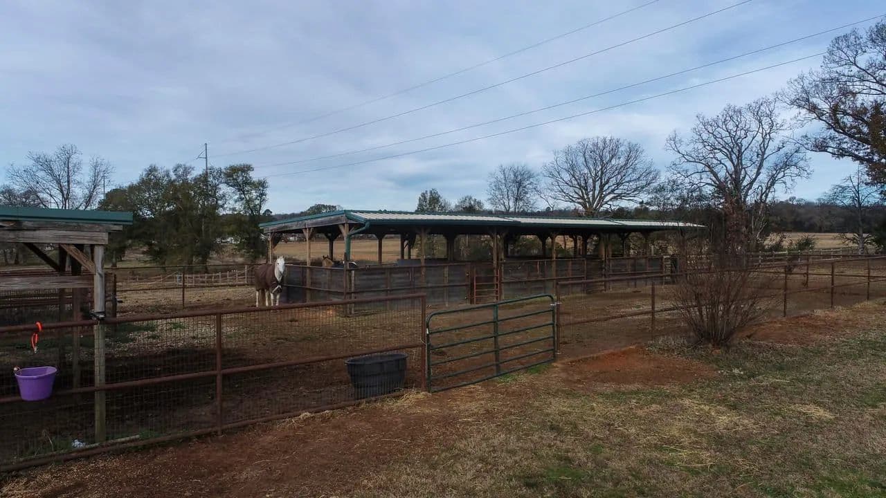 The estate also features a large metal workshop, complete with three expansive lean-tos, offering ample space for projects, storage, or business endeavors. The entire property is fenced and sectioned for horses and livestock, ensuring safety and convenience.