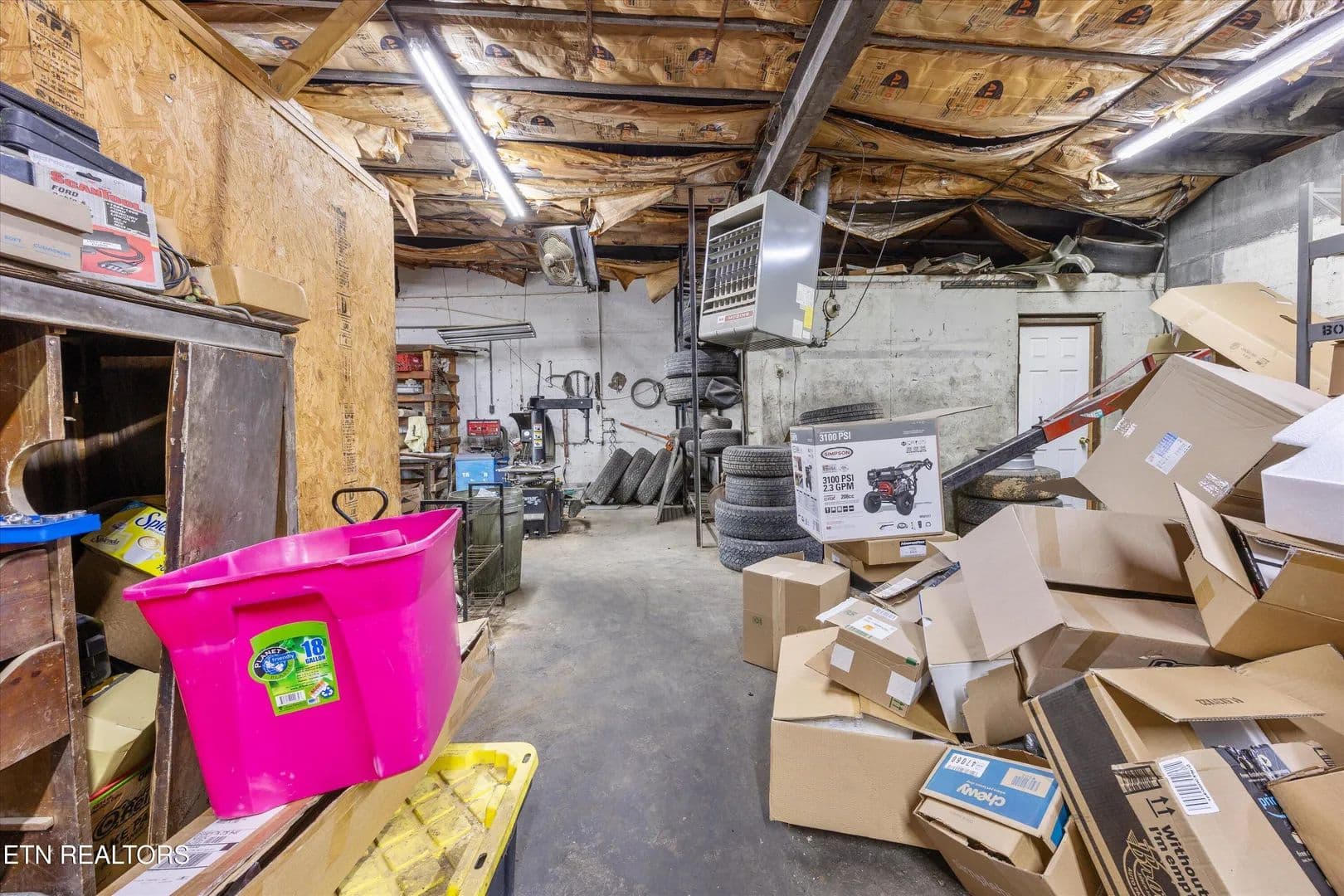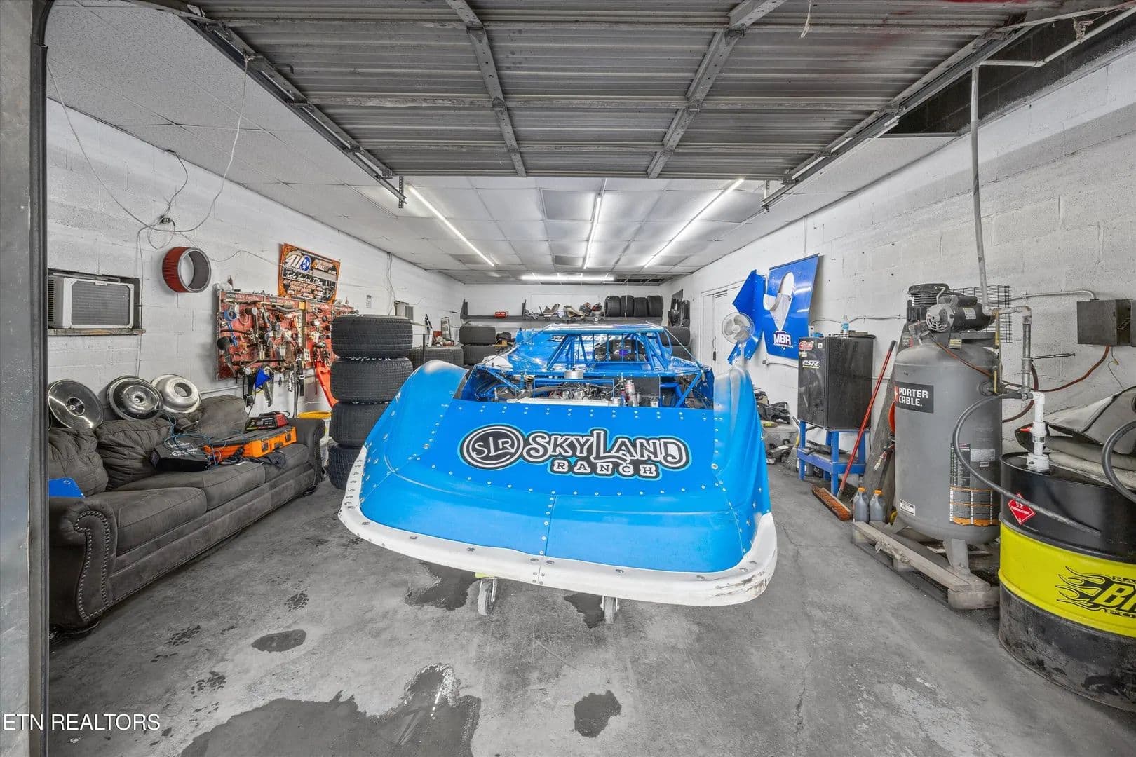 -A studio apartment (currently rented) with a large garage/workshop space below.