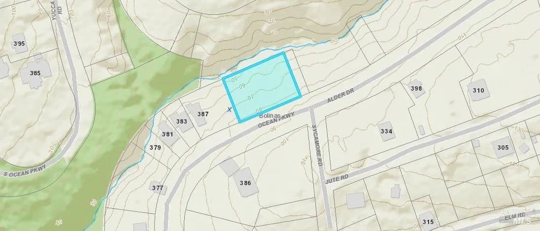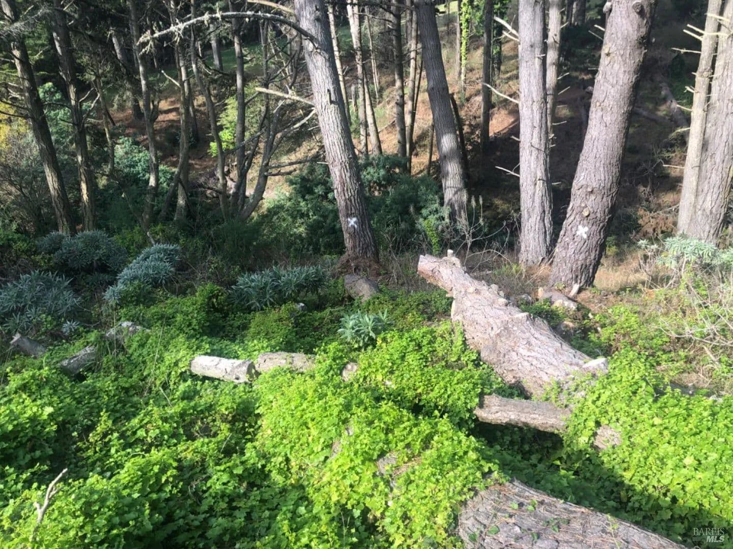 On a paved road. Please know the lot being sold as unbuildable due to a permanent Water Moratorium (BCPUD 1971). Zoning most likely disallows overnight camping or off-grid haitation. Contact Marin County planning, building, and environmental health for more details. In the Coastal Zone The numeric 387 is for GPS location purposes. Own 14,000 sq ft of precious Bolinas land.
