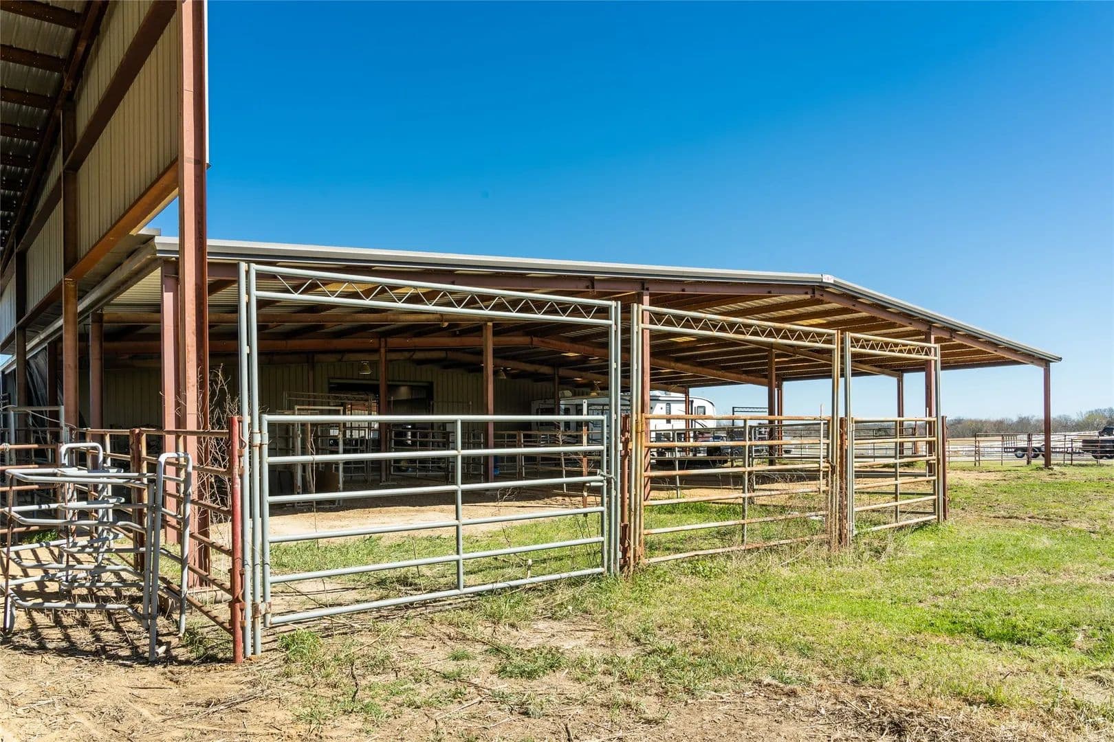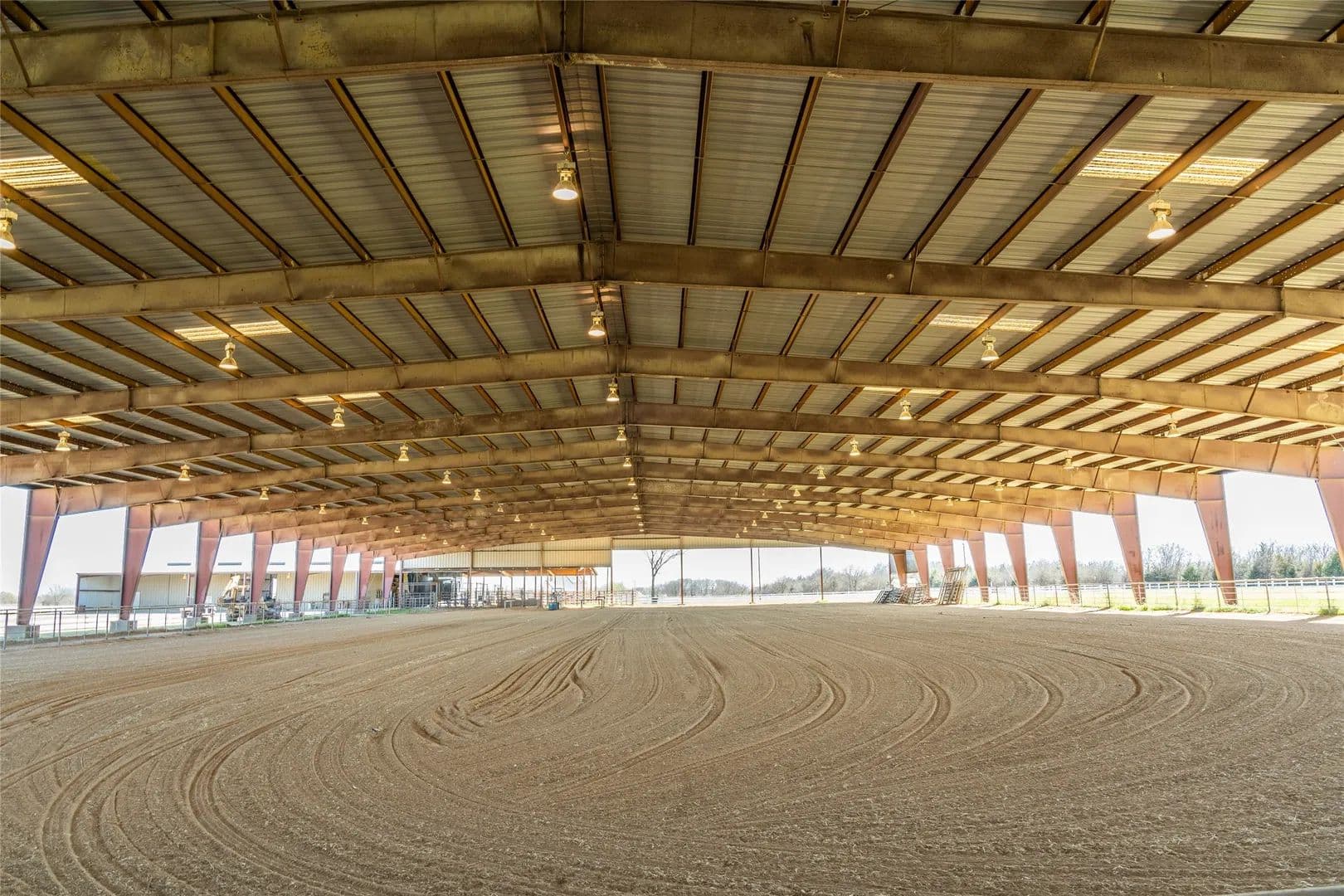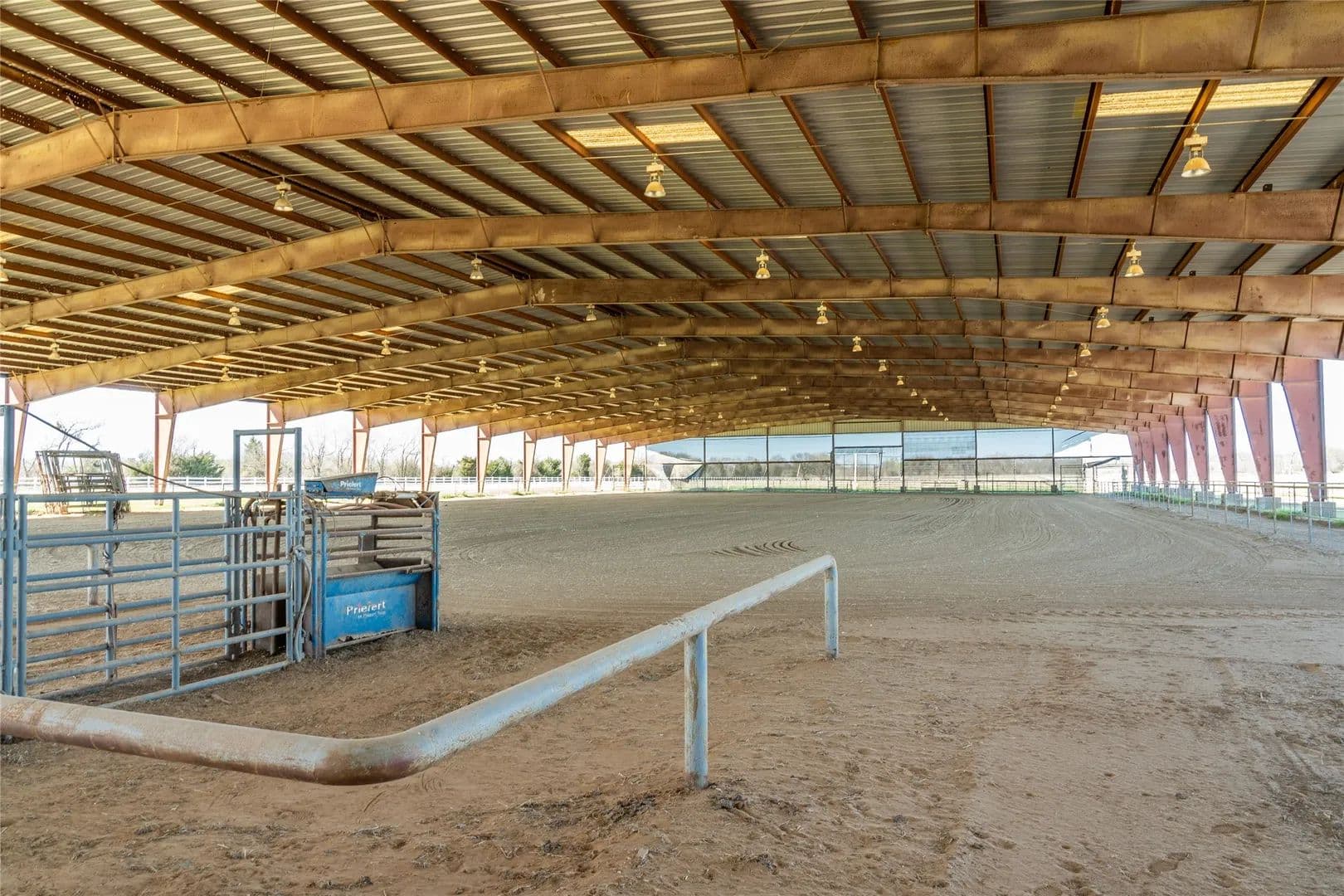 Equestrian enthusiasts will appreciate the impressive 175' x 340' lighted covered sand arena, equipped with a Priefert Roping Air Chute, Roping Boxes, Alley, working pens & large pond. There's also a spacious 8,000 SF covered concrete corral, RV hookup, ideal for various livestock activities & ample room for parking and turning around equipment.