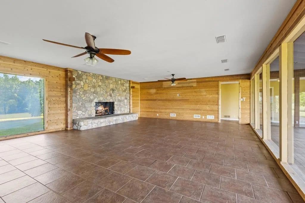 The home includes a two-car garage and a study with a large corner fireplace as you enter. A large mudroom or laundry area with a full bathroom off the farm entrance provides plenty of space to kick off muddy boots after a day outdoors. The kitchen is next to a beautiful dining room with another fireplace and a wall of bay windows overlooking the farm.