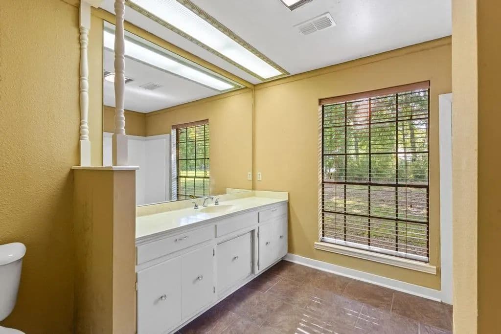 The property has rolling hills that lead back to a large 3832 sqft 1960s ranch-style home set high on a hill, offering panoramic views of the lake and the land.