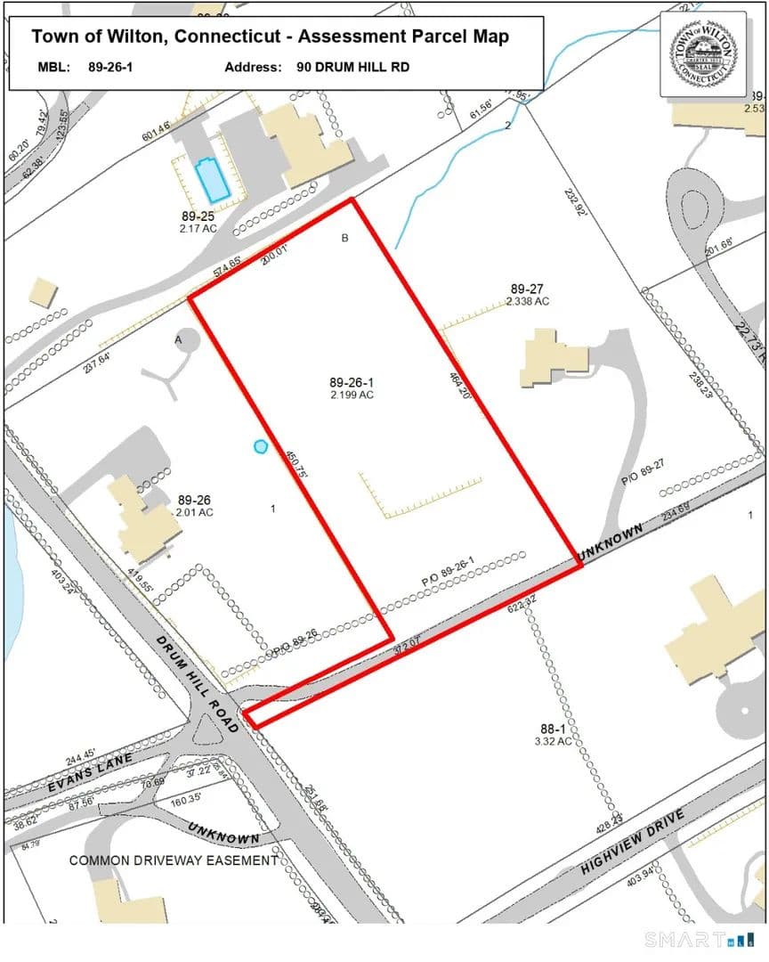 Rare opportunity to build your custom estate on level 2.2-acre parcel on private Drum Hill Road lane. Surrounded by multi-million dollar properties in the highly-rated Wilton school district. Create your ideal home design on this centrally located buildable lot with quick access to top-rated schools: Middlebrook School, 0.6 mi, Cider Mill School, 0.9 mi, Wilton High School, 1.2 mi. Minutes to Wilton Center featuring Village Market, shops, and restaurants. Design your custom floor plan with space for a home office, gym, outdoor kitchen, or guest suite on this generous parcel. Property offers room for a pool, gardens, a sports court, or extensive outdoor living areas. Built in an established neighborhood with mature landscaping and stone walls characteristic of Wilton's historic charm. Nearby recreational access includes the Norwalk River Valley Trail, preserves with hiking trails, and Merwin Meadows Park. Route 7 provides direct access to Merritt Parkway and Metro-North stations with service to NYC. Construct your personalized residence in this sought-after Connecticut town known for two-acre zoning, preserved open space, and excellent schools.