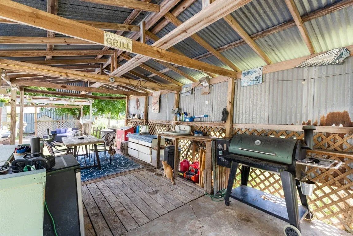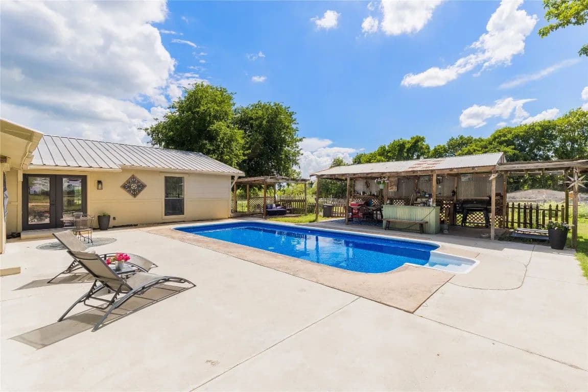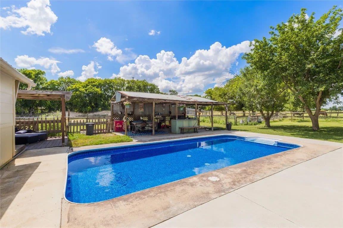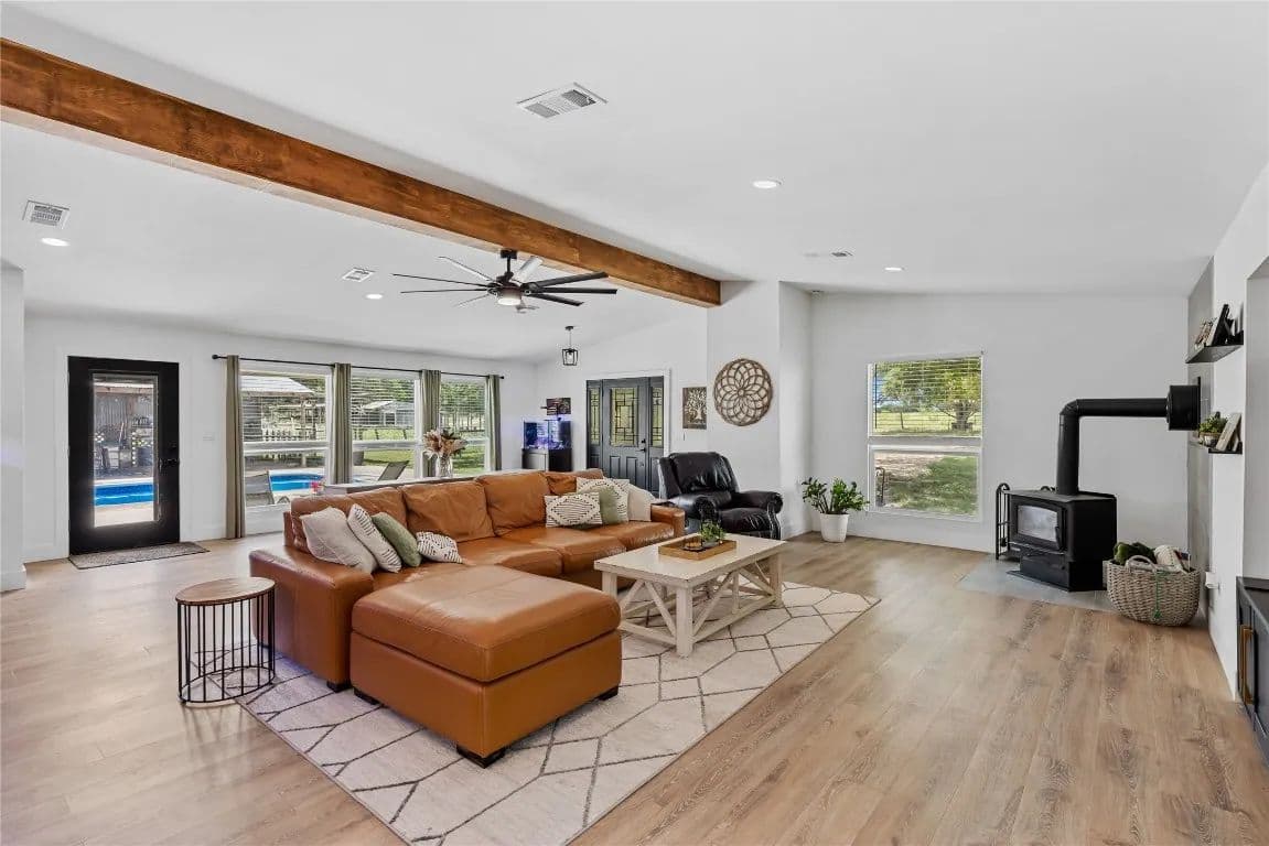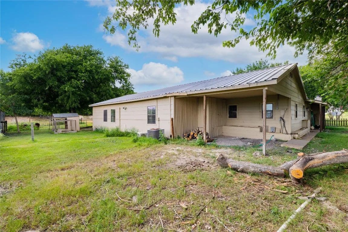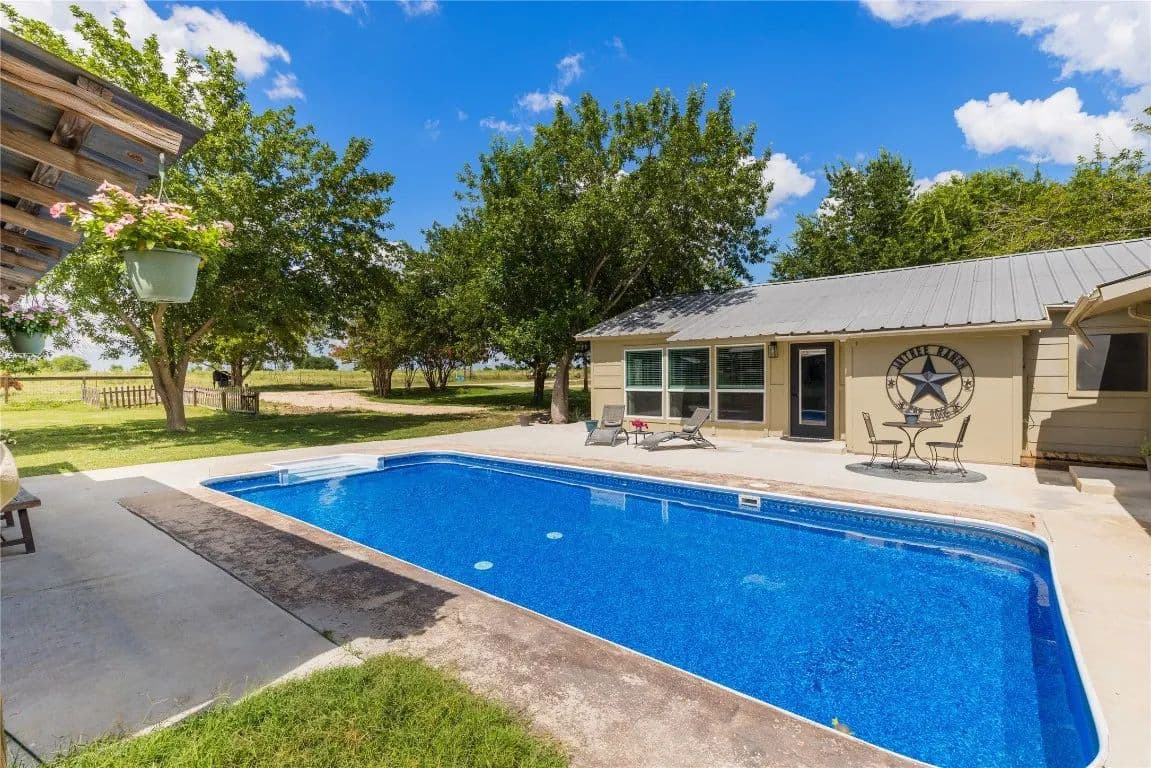 Nestled just outside the Taylor city limits and within the ETJ (no known restrictions), this beautifully updated Texas farmhouse sits in the direct path of rapid growth. Renovated in 2022, the home blends modern design with rustic charm—featuring quartz countertops, newer appliances, tall ceilings with wood beams, and a cozy wood-burning stove. The spa-like primary bathroom is truly a retreat. This single-story layout offers flexibility and space, with an oversized living area and a dedicated home office. Step outside to enjoy a 4-ft pool, covered patio, and grilling area—perfect for relaxing while overlooking trees and fenced pastures currently home to chickens and goats.