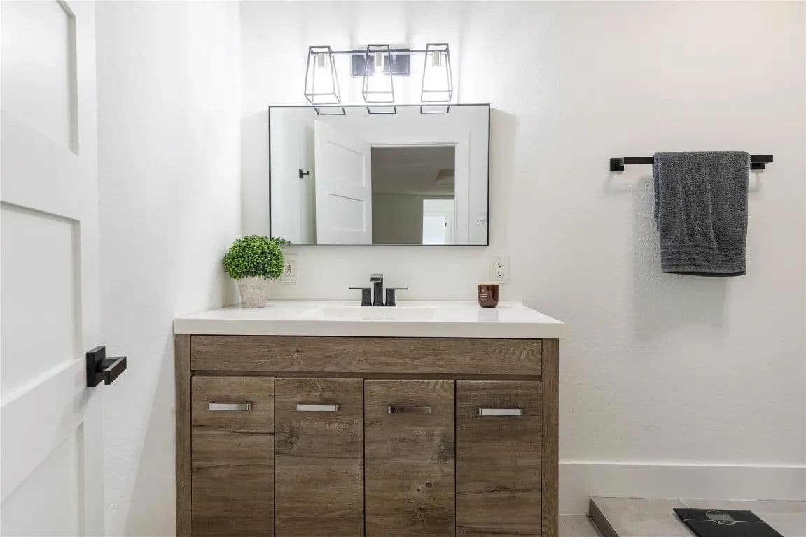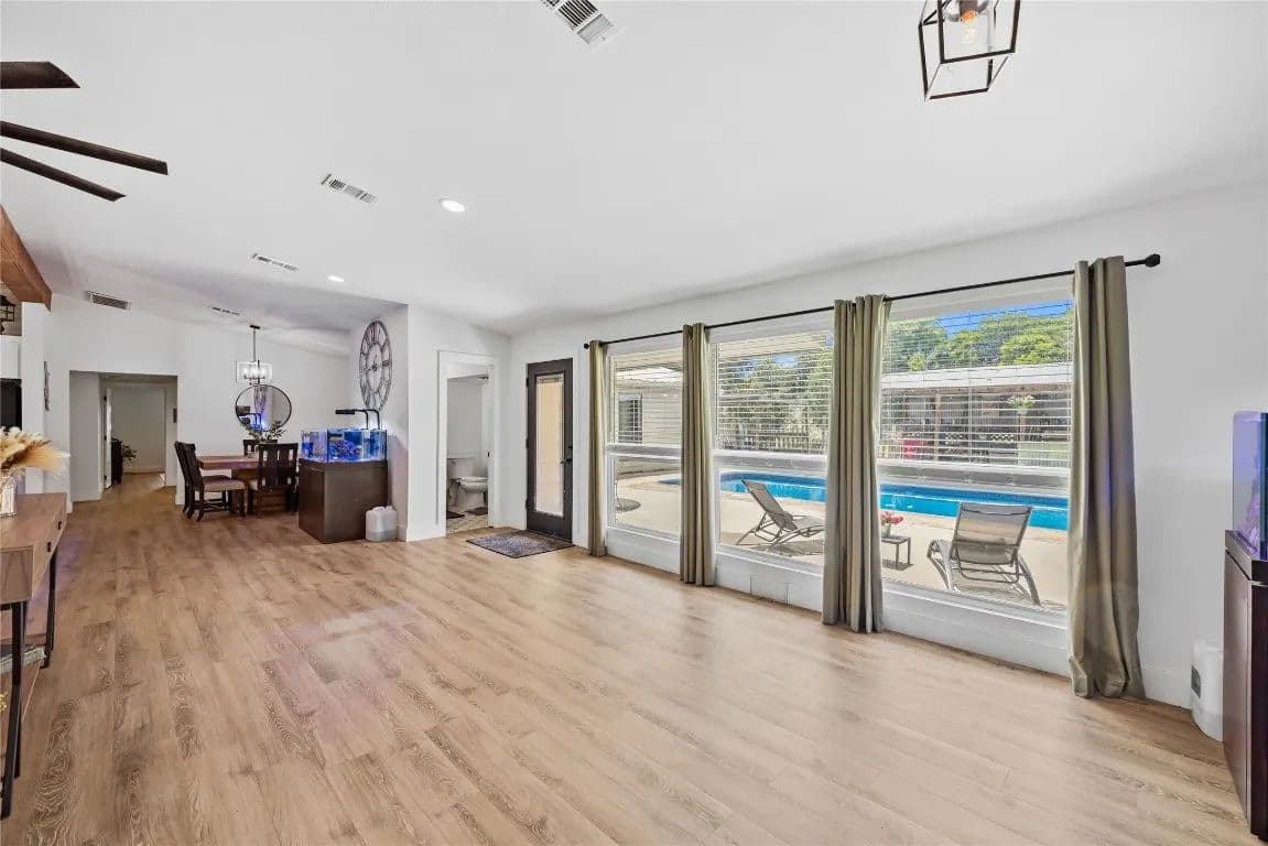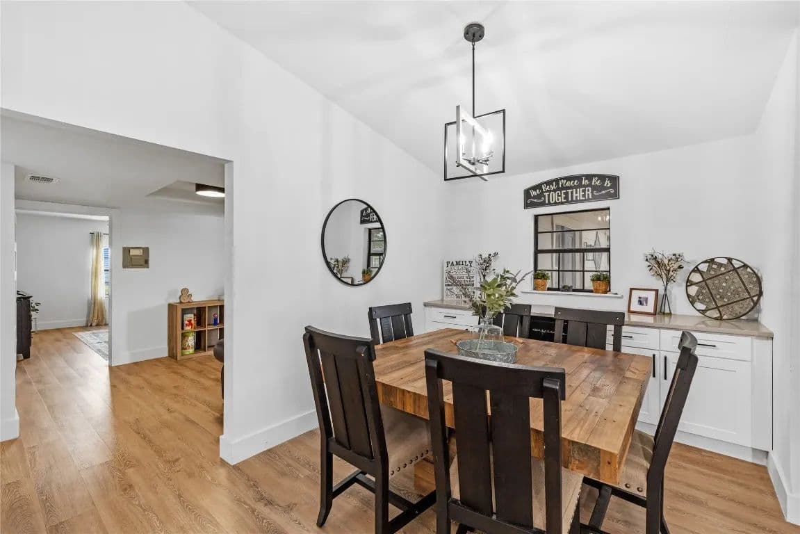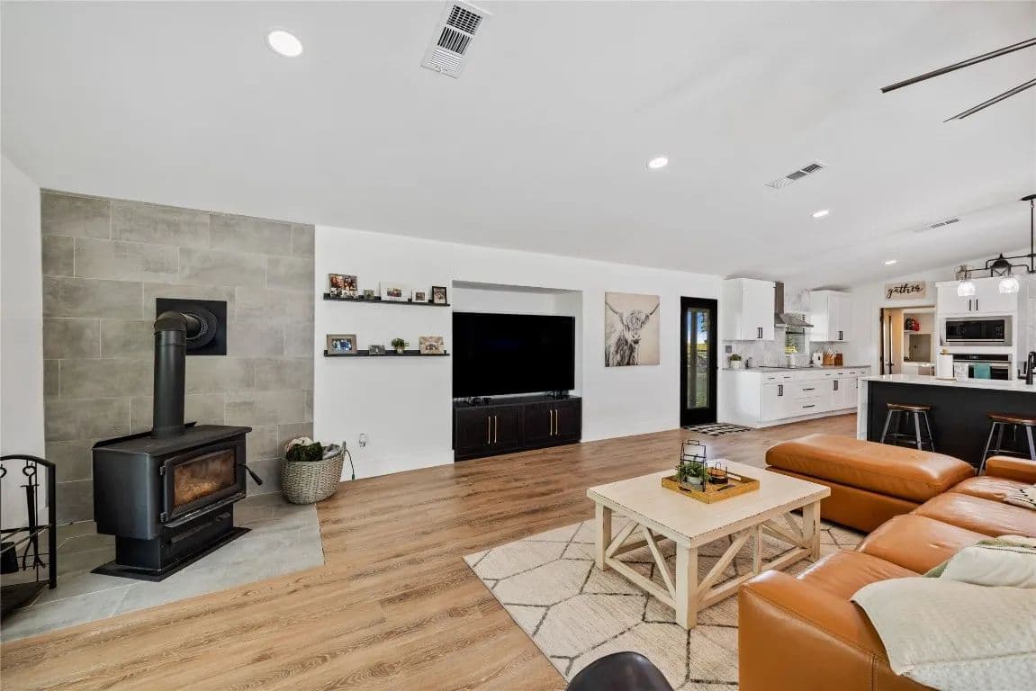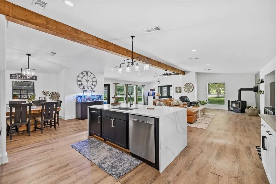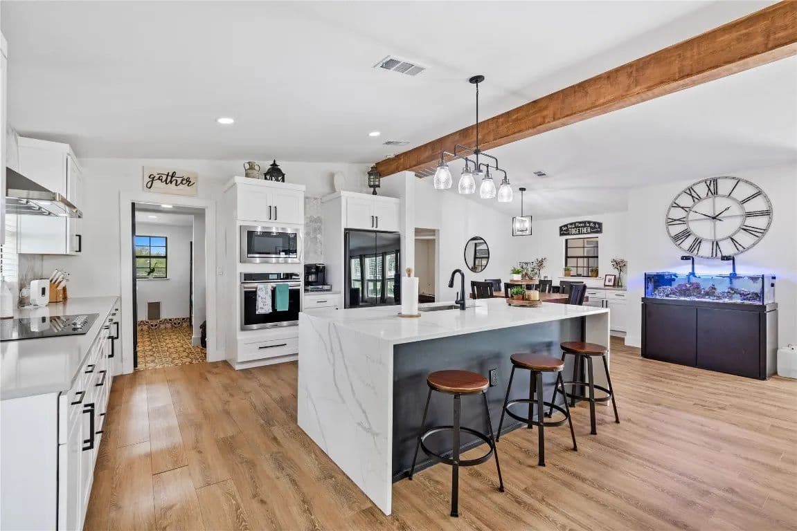 Nestled just outside the Taylor city limits and within the ETJ (no known restrictions), this beautifully updated Texas farmhouse sits in the direct path of rapid growth. Renovated in 2022, the home blends modern design with rustic charm—featuring quartz countertops, newer appliances, tall ceilings with wood beams, and a cozy wood-burning stove. The spa-like primary bathroom is truly a retreat. This single-story layout offers flexibility and space, with an oversized living area and a dedicated home office. Step outside to enjoy a 4-ft pool, covered patio, and grilling area—perfect for relaxing while overlooking trees and fenced pastures currently home to chickens and goats.