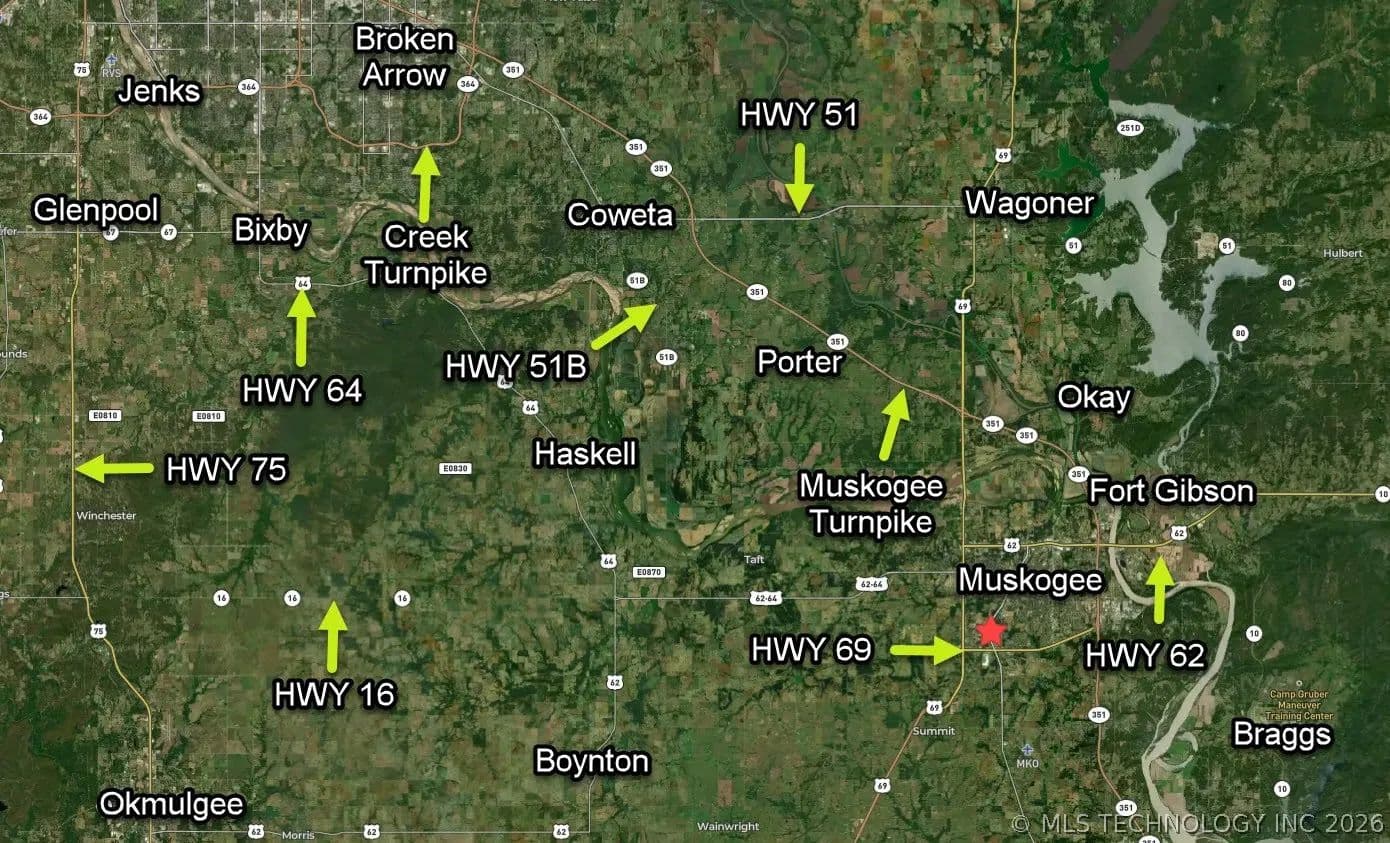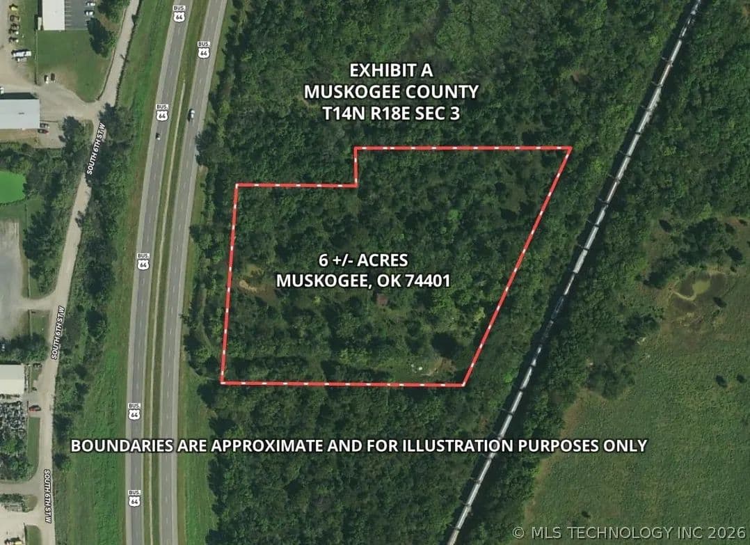 EXPLORE THIS MAGNIFICENTLY MULTI-FACETED 6.5 +/- ACRES IN MUSKOGEE—RIGHT OFF HIGHWAY 64! Situated just 2 miles south of downtown Muskogee, this heavily treed property offers both privacy and convenience, making it an ideal choice for a variety of uses, from a private retreat to a potential development site. Discover the perfect canvas to bring your dreams to life on this stunning 6.5 +/- acres of vacant land. With prime road frontage on Highway 64, accessibility is a breeze, especially with nearby highways including Highway 69 just 1.5 miles away and Highway 62 a mere 3.5 miles. Enjoy easy travel to neighboring towns, including Fort Gibson (10 miles), Wagoner (16 miles), Checotah (19 miles), and Coweta (20 miles), while being perfectly positioned for quick access to major routes like the Muskogee Turnpike (8.5 miles) and I-40 (20 miles). Whether you envision building your dream home, creating a recreational getaway, or pursuing investment opportunities, this enchanting piece of land is a rare find in a rapidly growing area. Don’t miss the chance to own land with unmatched potential! Schedule a showing today!