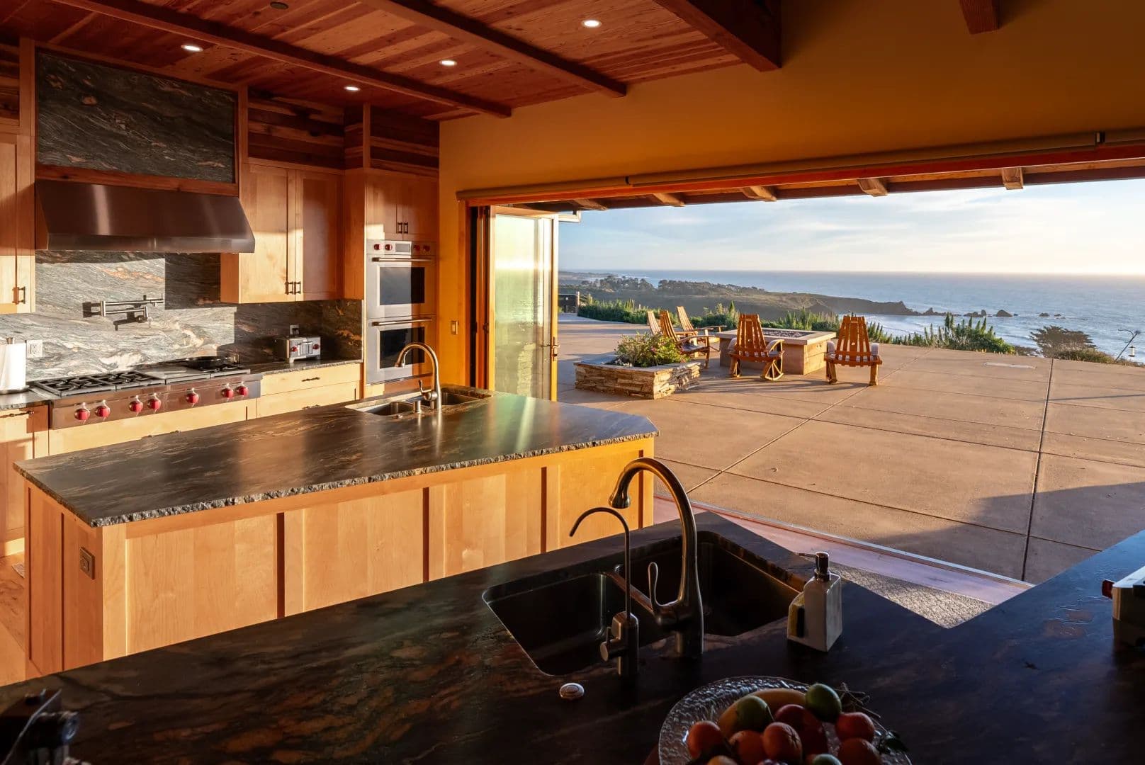 The residence is ripe with windows and contains five sets of custom, Loewen®, bi-fold doors that offer splendid, 180° views of the coastline, Carpoforo Beach and surrounding hillsides.