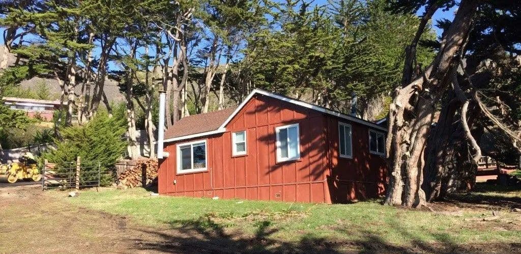 The cabin also features a private patio area with a large wood burning fireplace made of stone and view of the ocean.