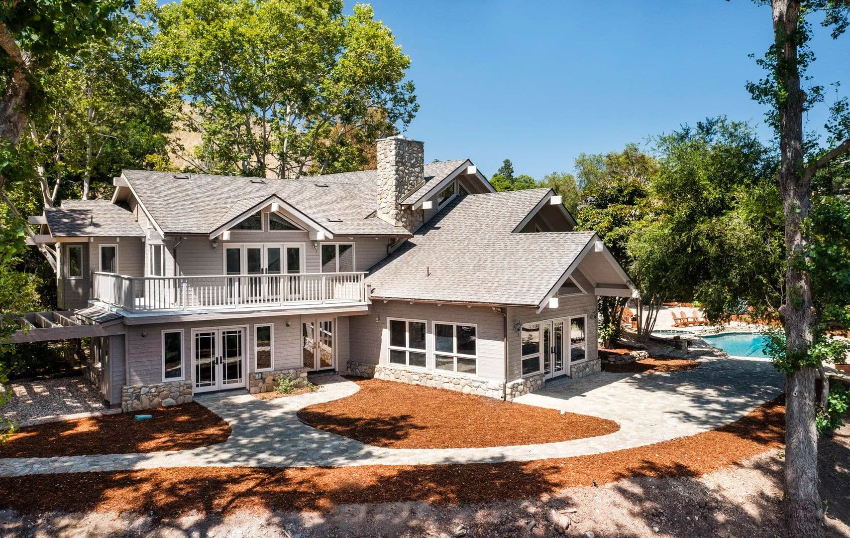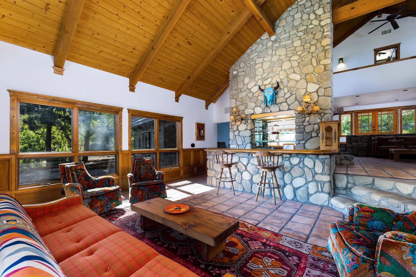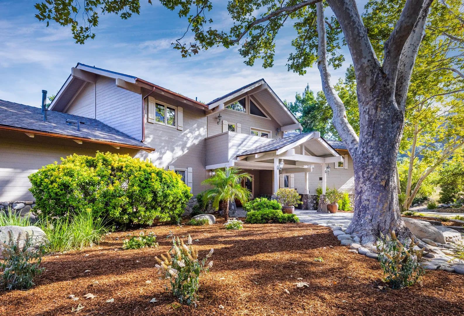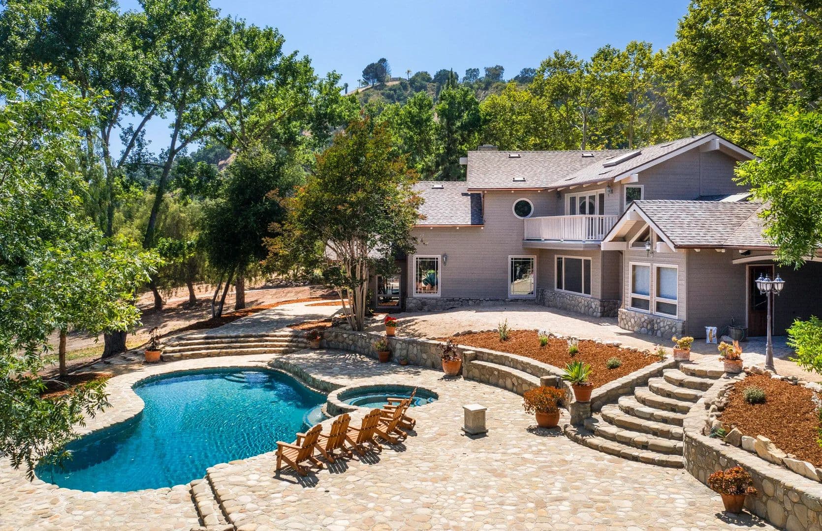 Incredible opportunity! Stunning Ojai gated estate on 13 acres with commanding views & unrivaled privacy. Designed by Mark Whitman, AIA, this 5BR 4.5BA postmodern ranch seamlessly blends nature and architecture. Enjoy the large gathering rooms, wet bar and 3 stone fireplaces. Prepare meals in the chef's kitchen or use the rustic stone bbq area after relaxing in the pool & spa.