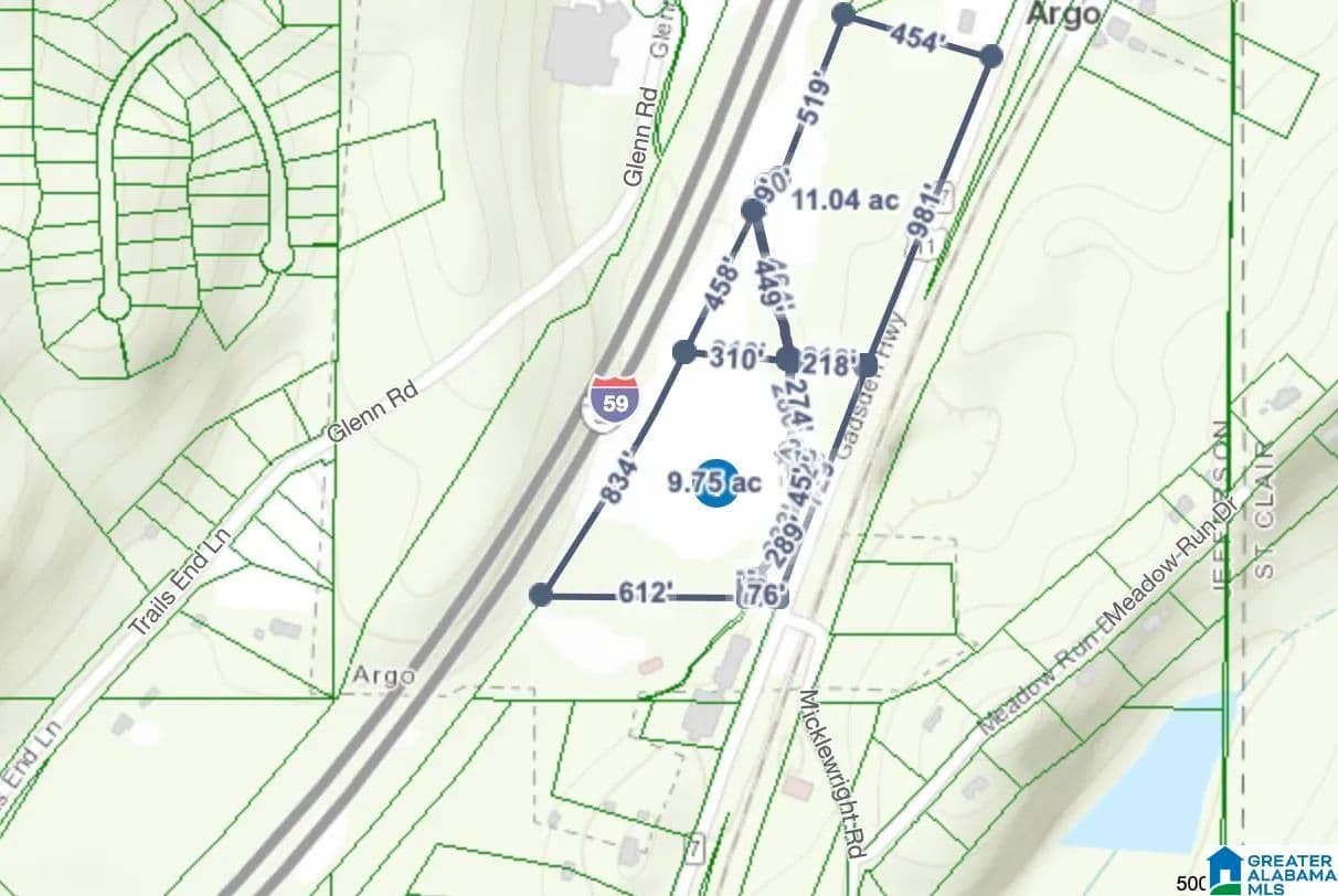 If location is everything...then this is what you are looking for....land with exposure to Interstate 59 just off the Argo Exit and with approximately 1800' of frontage on Gadsden Hwy (Hwy 11). This property consist of two parcels of land 10-00-34-2-000-011.004 and 10-00-34-2-000-011.003. The acreage is approximately 21 acres per tax records but, a survey will be needed to determine the exact acreage. There is a utility easement on this land and part of this property will show to be in a flood plain. A branch runs through a portion of this property. You will still have many options for the use of this land. Call soon and schedule a showing.