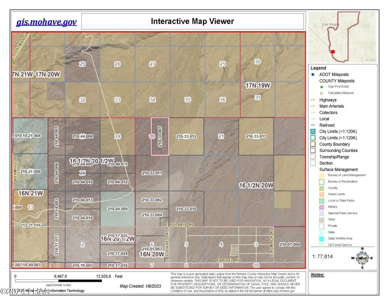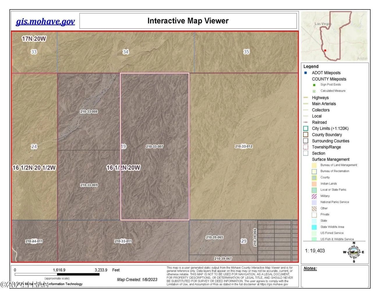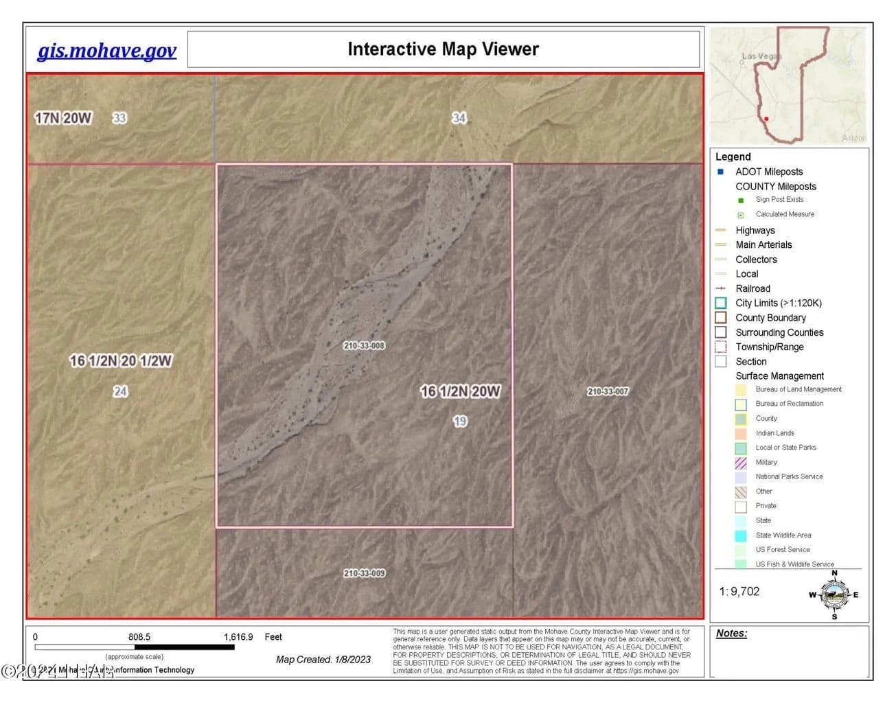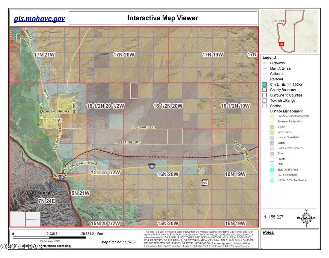 Wide open desert vistas in the Colorado River valley. 498 acres of undisturbed desert land surrounded by BLM land on 3 sides. Five miles to the Havasu National Wildlife Refuge to the west and the Black Mountains & Warm Springs Wilderness Area to the northeast. Two parcels in one listing totaling 497 acres located 2 miles north of Polaris Road and 10 miles from the Colorado River and Interstate 1- 40. This listing is 3/4 of Section 19 comprising the north half and the eastern half of Section 19. This property has not been subdivided or zoned and does not have legal road access, but is easily accessed by off-road vehicle. GIS views in photos. GPS Coordinates: parcel 210-33-007: SE Corner Lat. 34.792828 N Long. 14.386871 W SW Corner Lat 34.792828 N Long 114.395679 W NW Corner Lat. 34.808042 N Long. 114395722 W NE Corner Lat. 34.808052 N Long 114.386892 W GPS Coordinates: parcel 210-33-008: NE Corner Lat. 34.808046 N Long. 114.395725 W NW Corner Lat. 34.808042 N Long. 114.403788 W SW Corner Lat. 34.800054 N Long. 114.403790 W SE Corner Lat. 34.800065 N Long. 1114.395695 W