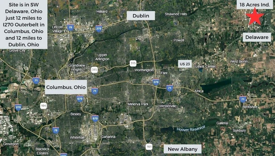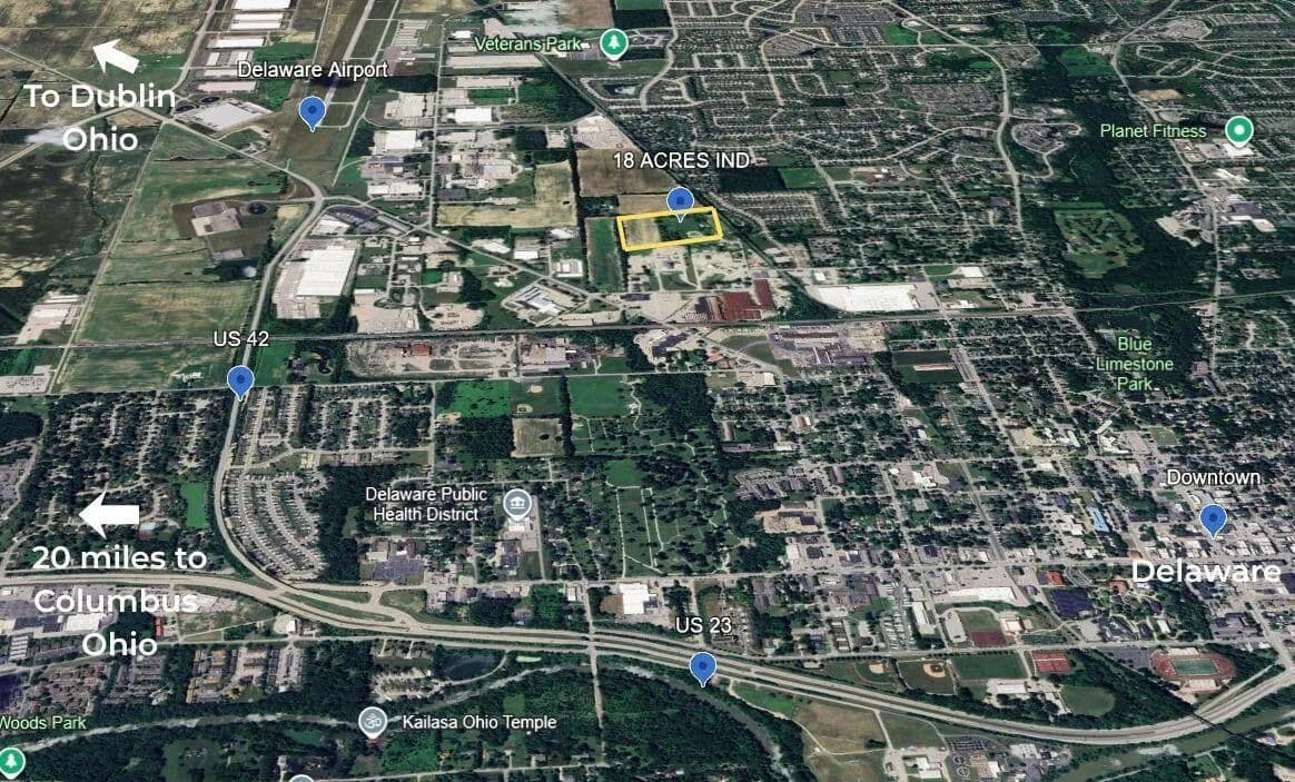 Development opportunity located within a Planned Industrial District of Delaware! 18 acres land across 7 parcels located near Buckeye Ready-Mix Concrete with convenient access to downtown Delaware and the airport. The property includes a dedicated roadway right-of-way for future public roads, making it well-suited for an industrial park or other industrial use. Electric and water are already on the property, with sewer access nearby (buyer to verify). This site offers excellent potential for logistics, distribution, manufacturing, or other industrial uses in a growing market. Buyer to conduct their own due diligence on zoning and utilities