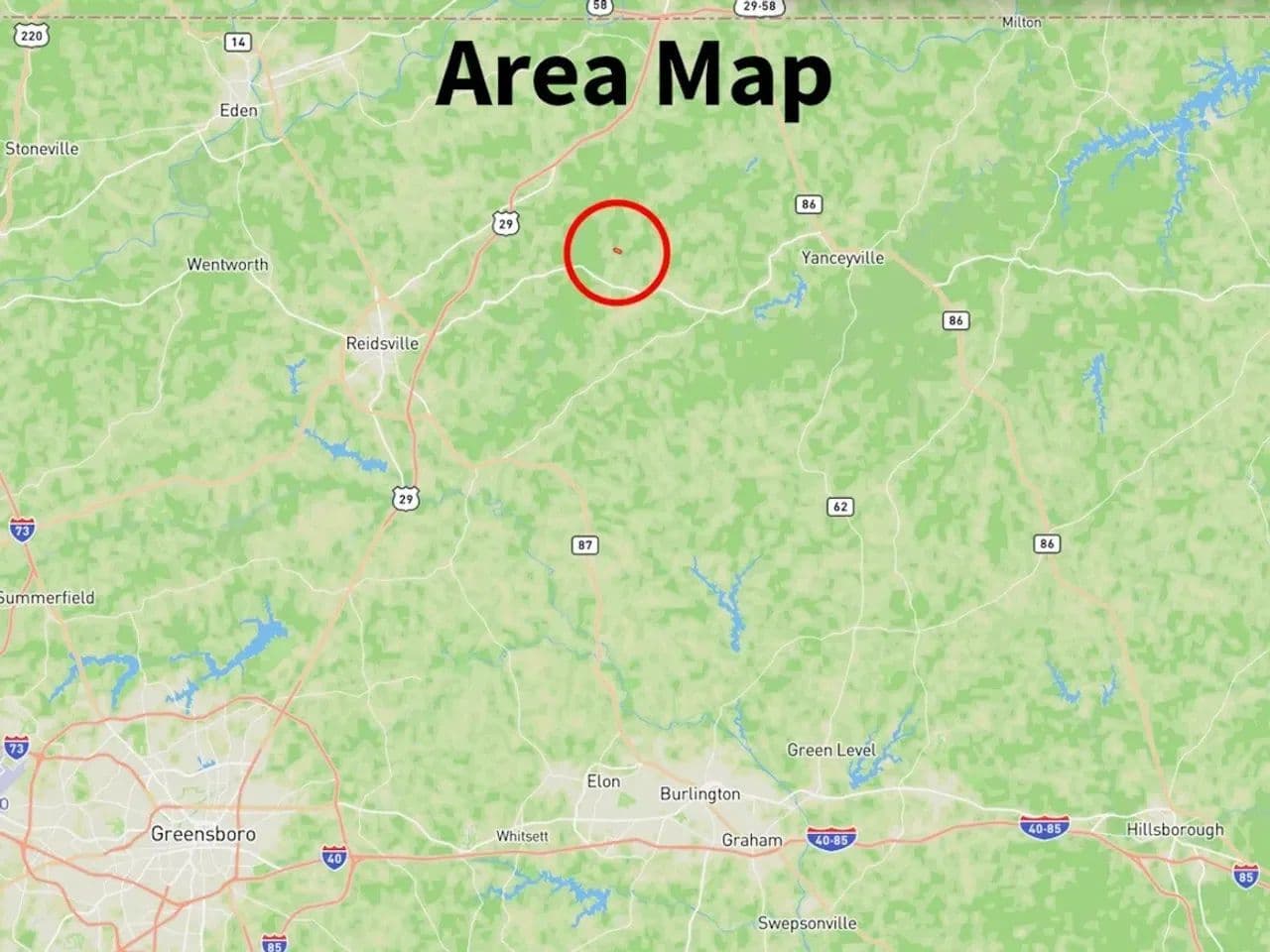 - The property is 17-miles south from Danville, NC, 13-miles west of historic Yanceyville, NC, 25-miles north of Burlington, NC, and 18-miles east of Reidsville, NC. All these cities & towns have shopping & dining opportunities as well as hardware and farm supply stores you may need.