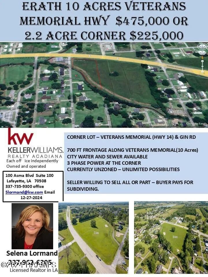 10+ Acre tract located in the heart of Erath is currently unzoned with commercial possibilities. This would make a great development with convenient access to city park. This property has approx. 770 ft of highway 14 frontage & corner of Gin Rd with dual road access. City of Erath water and sewer available. So many possibilities with this large tract of land across street from fire station. Traffic counts approximately 22,000 cars per day plus phase 3 power located at the corner. Seller may consider selling all or part -subdivision at expense of Buyer. Seller willing to sell 2.2 Acre corner for $225,000 but must approve intended use if not purchasing entire 10 acre tract.