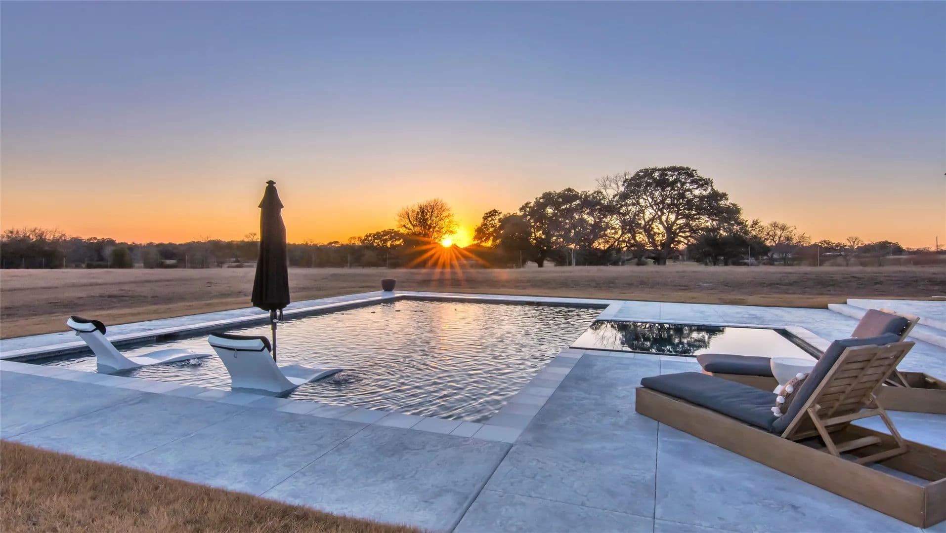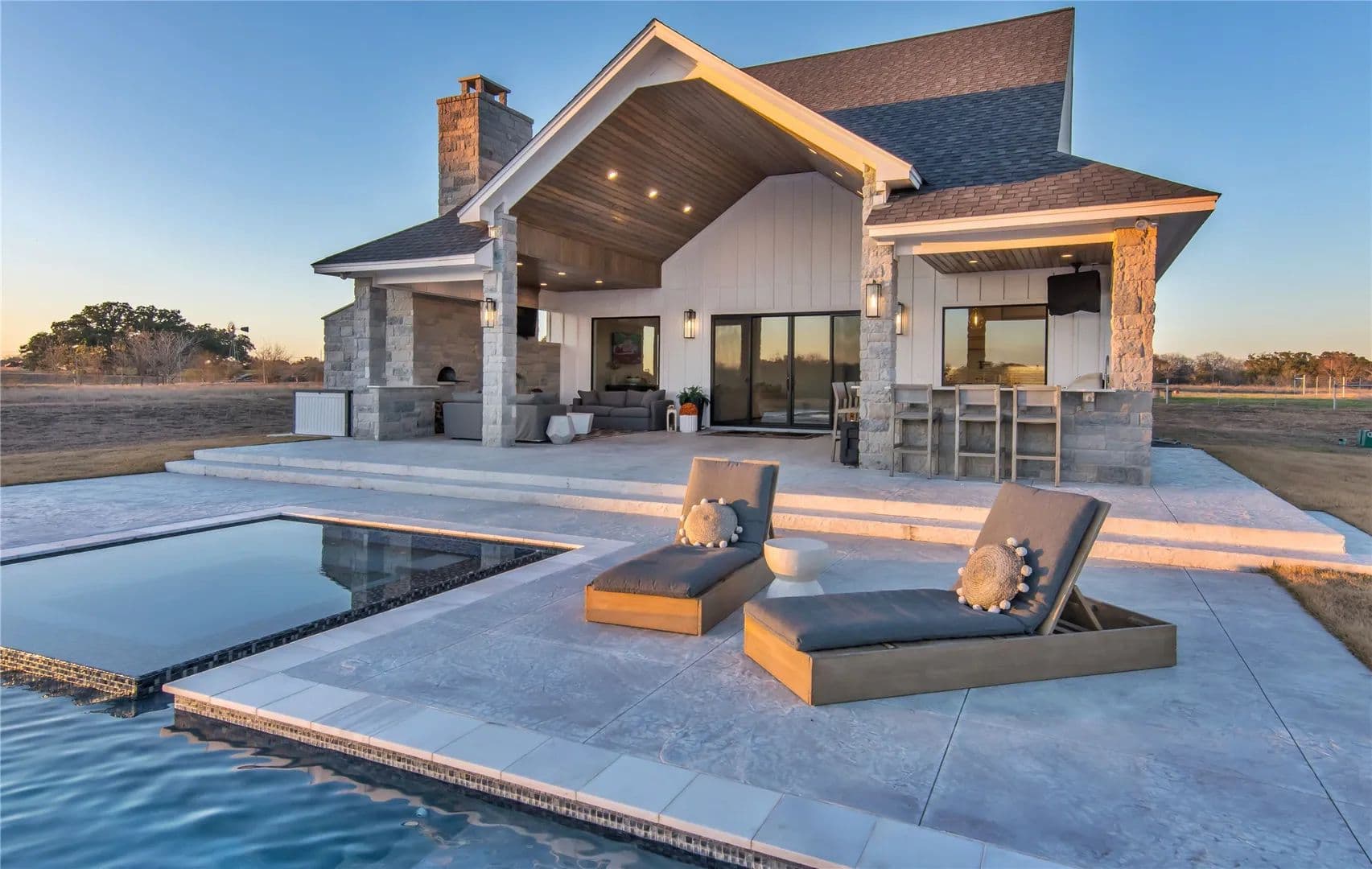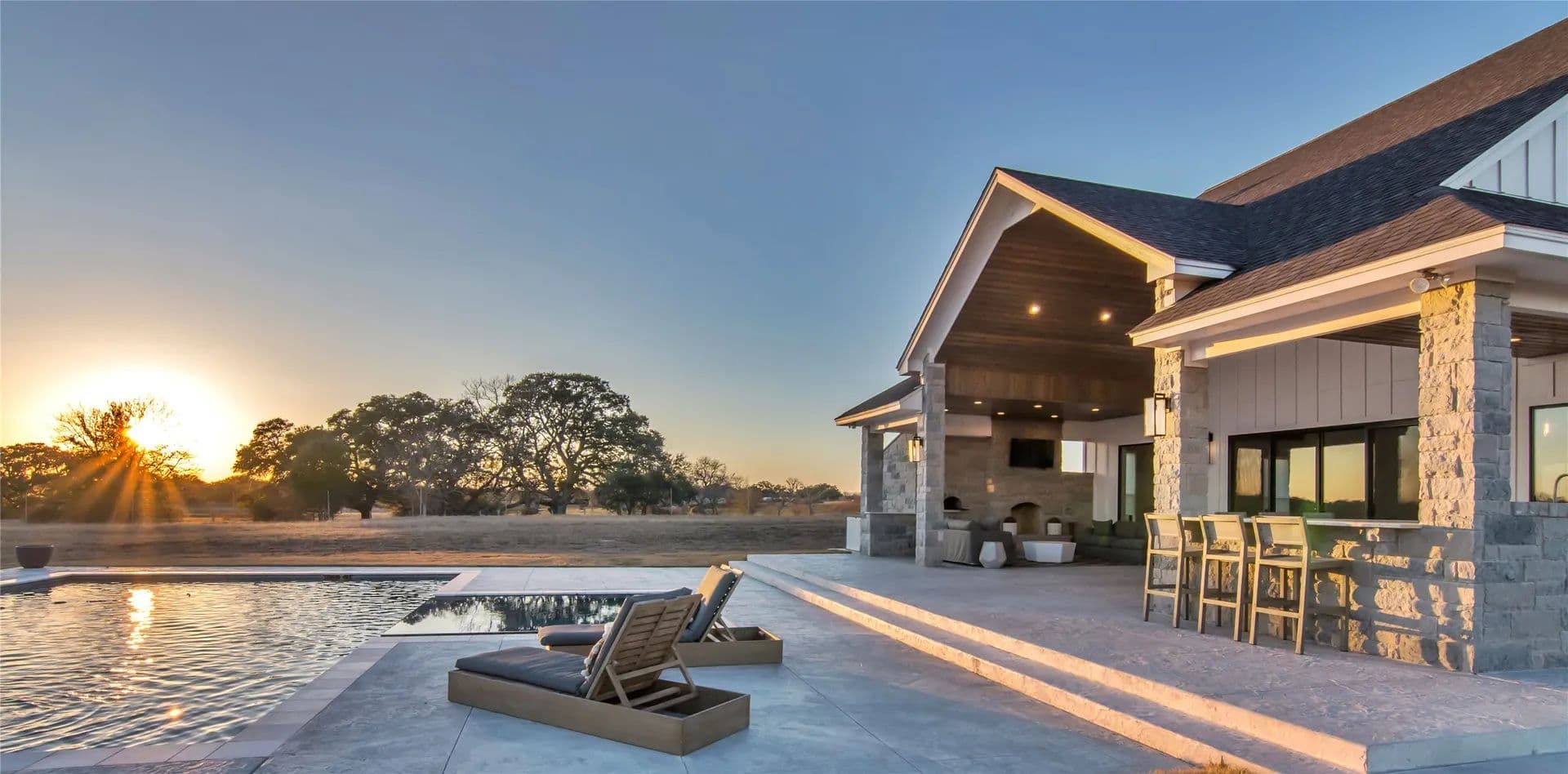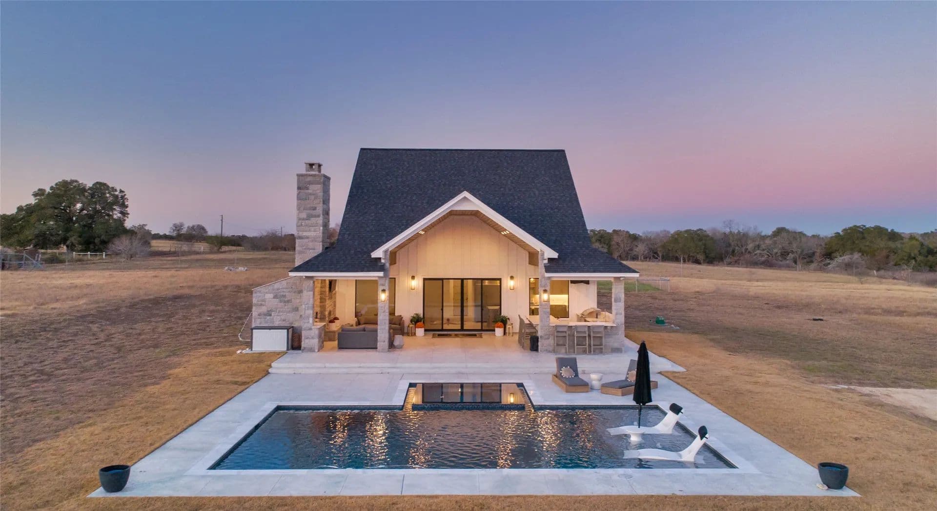 This property offers a 2-bedroom, 1-bath home built in 2022, located in the small community of Yoakum, centrally situated between Houston, Austin, San Antonio, and Corpus Christi. Set on 10 acres with a gated entrance and high fencing, it features a large covered patio with an outdoor kitchen, a Louisiana pellet grill, a True fridge/cooler, an outdoor sink, and an ice maker. The home boasts a Zline gas range, an oversized stainless steel fridge, tile flooring, a large kitchen island, and an open-concept layout. Additional amenities include 4-H pens for small animals, an outdoor fireplace with a pizza oven, a chlorine pool with a hot tub and tanning shelf, a water softener, pot filler, large windows offering views of the property and pool, a tiled indoor shower, and an outdoor shower. The exterior combines stone and Hardiplank, with cedar beadboard on the patio ceiling. This property is an ideal weekend getaway, perfect for entertaining with its spacious indoor and outdoor features.