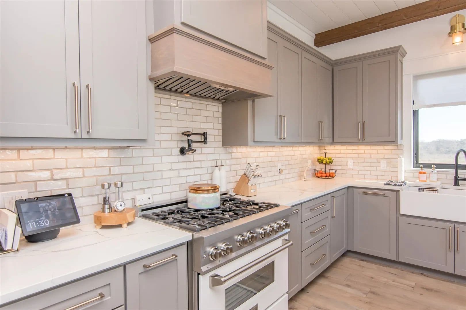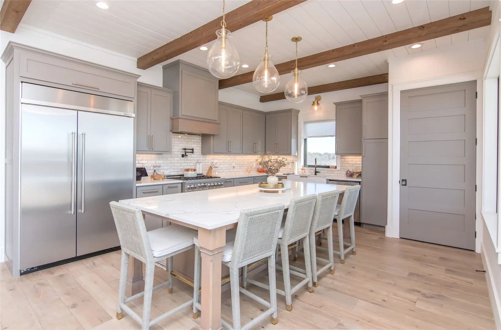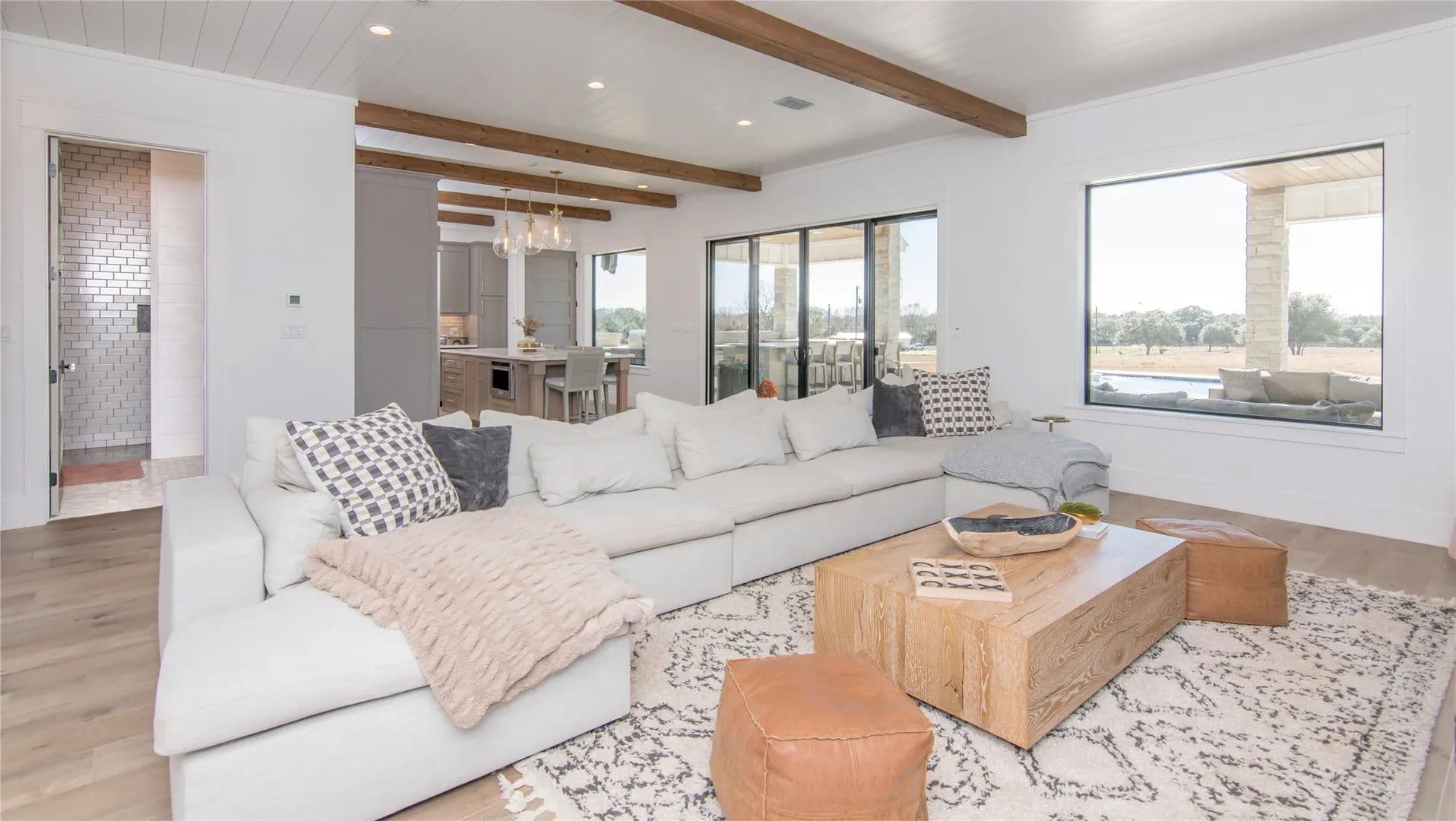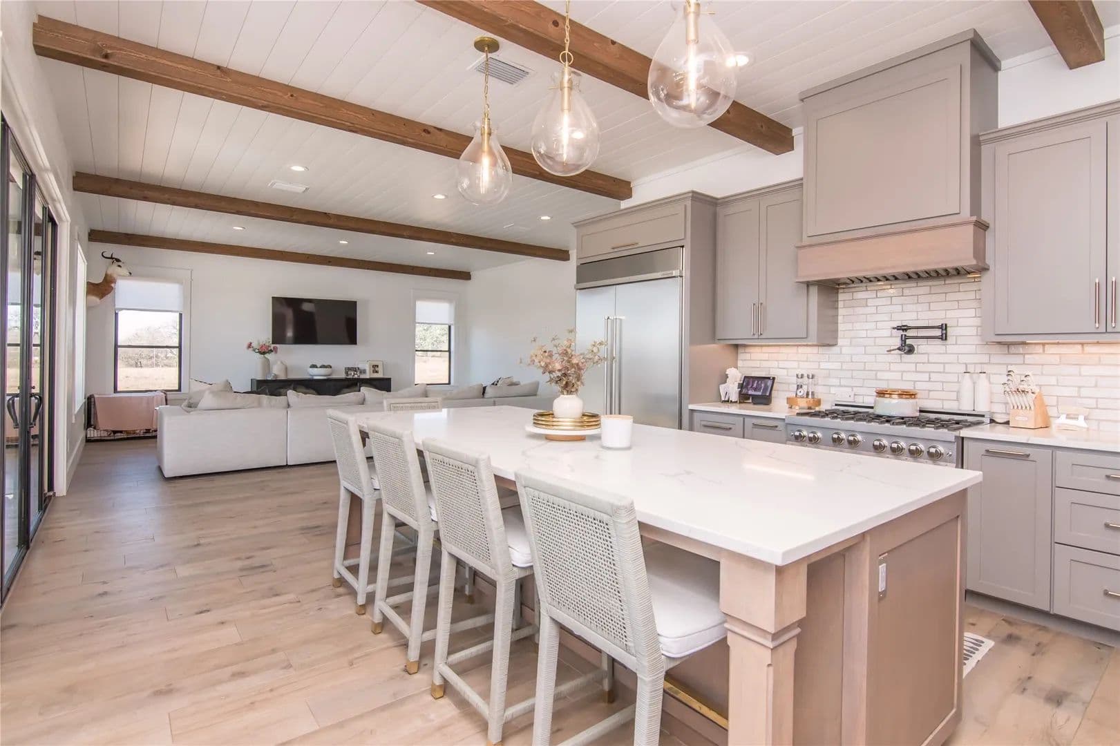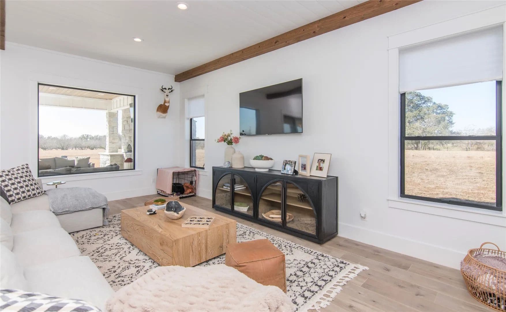 This property offers a 2-bedroom, 1-bath home built in 2022, located in the small community of Yoakum, centrally situated between Houston, Austin, San Antonio, and Corpus Christi. Set on 10 acres with a gated entrance and high fencing, it features a large covered patio with an outdoor kitchen, a Louisiana pellet grill, a True fridge/cooler, an outdoor sink, and an ice maker. The home boasts a Zline gas range, an oversized stainless steel fridge, tile flooring, a large kitchen island, and an open-concept layout. Additional amenities include 4-H pens for small animals, an outdoor fireplace with a pizza oven, a chlorine pool with a hot tub and tanning shelf, a water softener, pot filler, large windows offering views of the property and pool, a tiled indoor shower, and an outdoor shower. The exterior combines stone and Hardiplank, with cedar beadboard on the patio ceiling. This property is an ideal weekend getaway, perfect for entertaining with its spacious indoor and outdoor features.