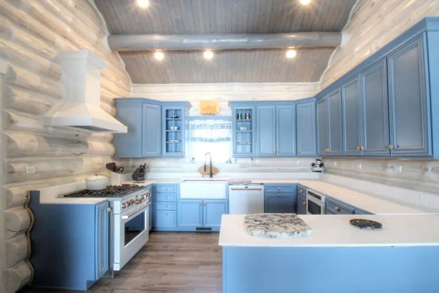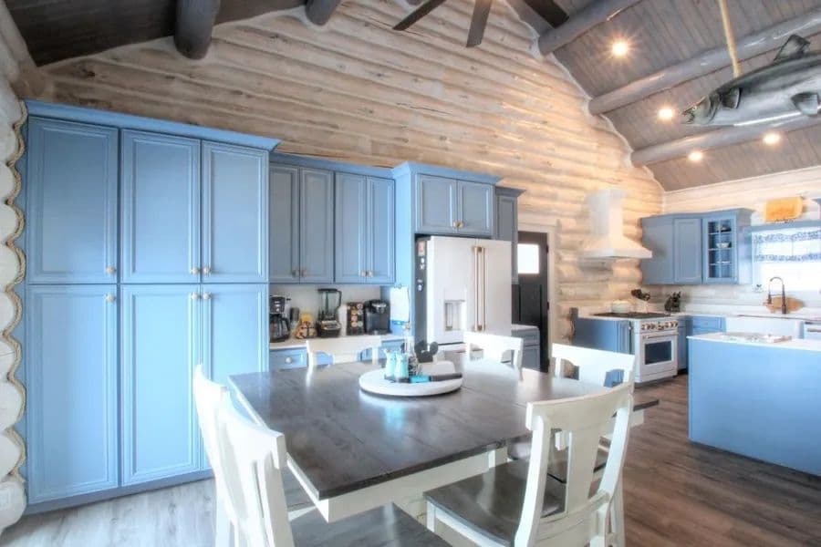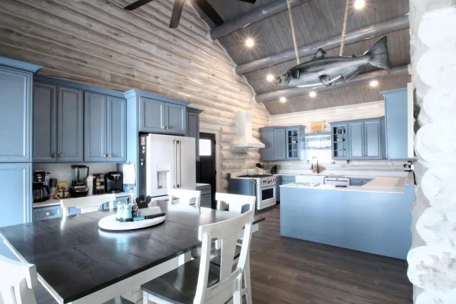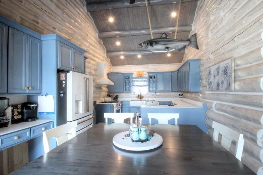 Custom ''Butt and Pass'' Construction Log Home Lake house using Michigan Red Pine logs built by renowned Mennonite Builders, ''Natural Log Homes Company'' from Tustin, MI and local Amish. This custom home was made to ooze the serenity of the water in the comfort of this themed Lakehouse. From the hand-carved 6-foot salmon island light in the kitchen to the Chris Craft boat bar in the great room, to the nautical hallway lights, this house has subtle touches throughout to bring the serenity of the water into this great home. Mohawk 20mm vinyl floor throughout the home offers comfort, durability, and is waterproof. The Great Room has a Custom Stone Fireplace with an enclosed wood-burning stove, along with spectacular views of Lake Huron.