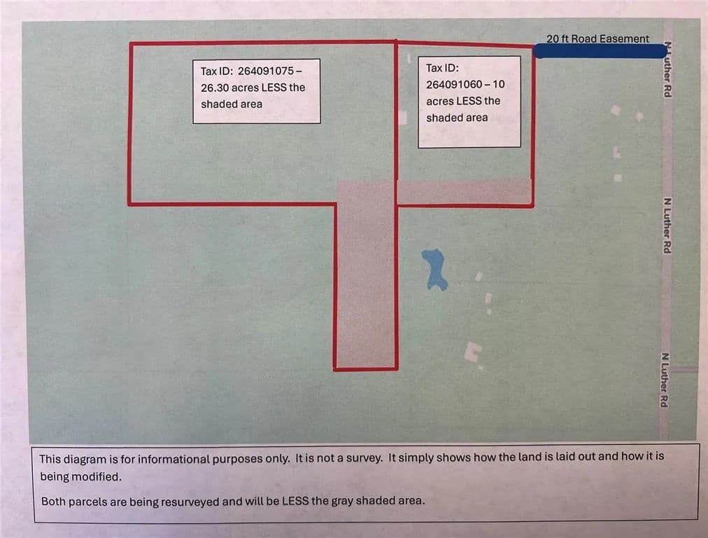 Approx 30 acres for sale in Luther, Oklahoma. Come build your family home or add a manufactured home on this scenic property. Beautifully wooded with trees, shrubs, & wildlife. No HOA. It is 2 parcels. The front parcel has a 40x70 workshop on concrete with electric. A well & septic tank is also on the property for future use (being sold in AS-IS condition). The back acreage is wooded with trails that was used for hunting. There is a 20ft road easement off of Luther Rd (which is paved), between Coffee Creek Rd and Sorghum Mill Rd. All the accessories on the land will be removed. DO NOT ENTER WITHOUT A SCHEDULED APPOINTMENT.