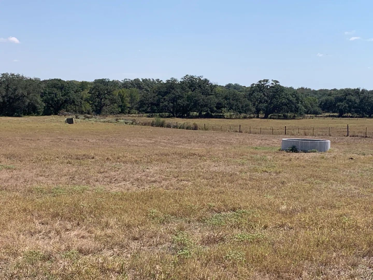 Two electric submersible water wells and two large concrete water troughs for cattle and wildlife.