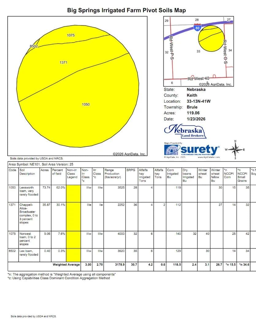 Looking for a pivot irrigated farm to add to your portfolio? Take a look at this opportunity in southwestern Keith County, NE. This farm lays nearly level and has very good access with a county gravel road along the eastern boundary and it is only a half mile from a County black top road.