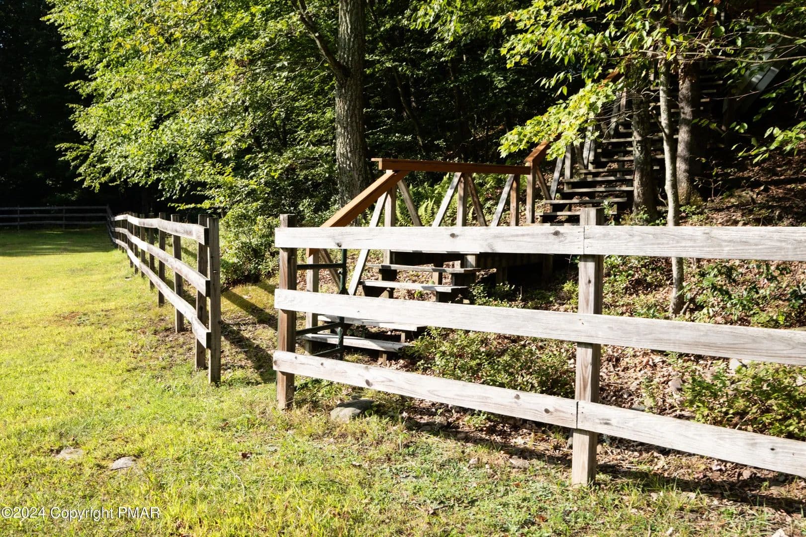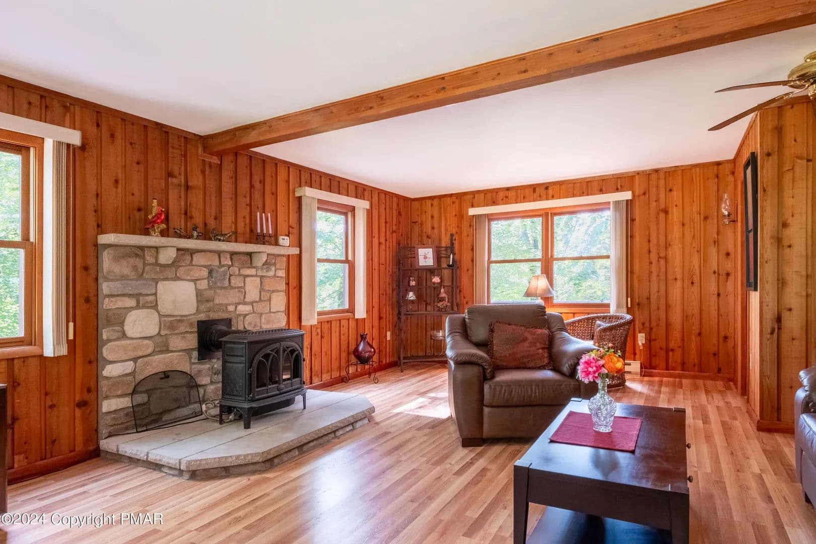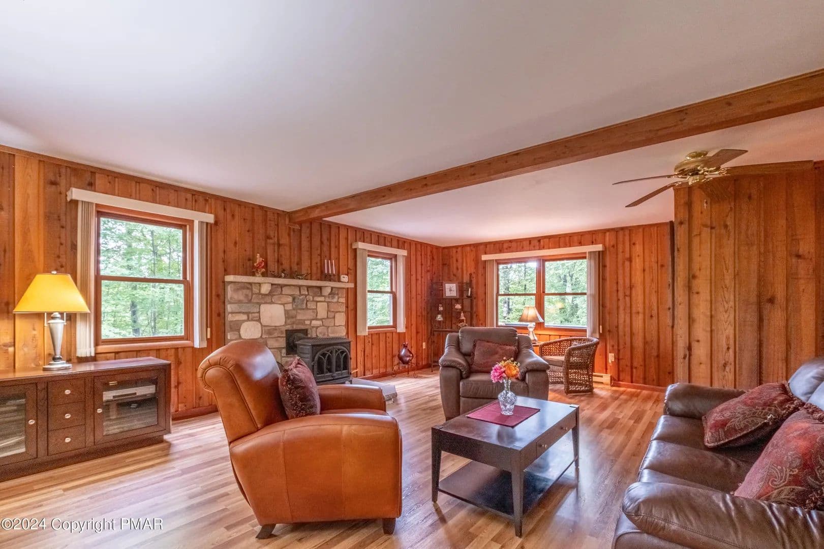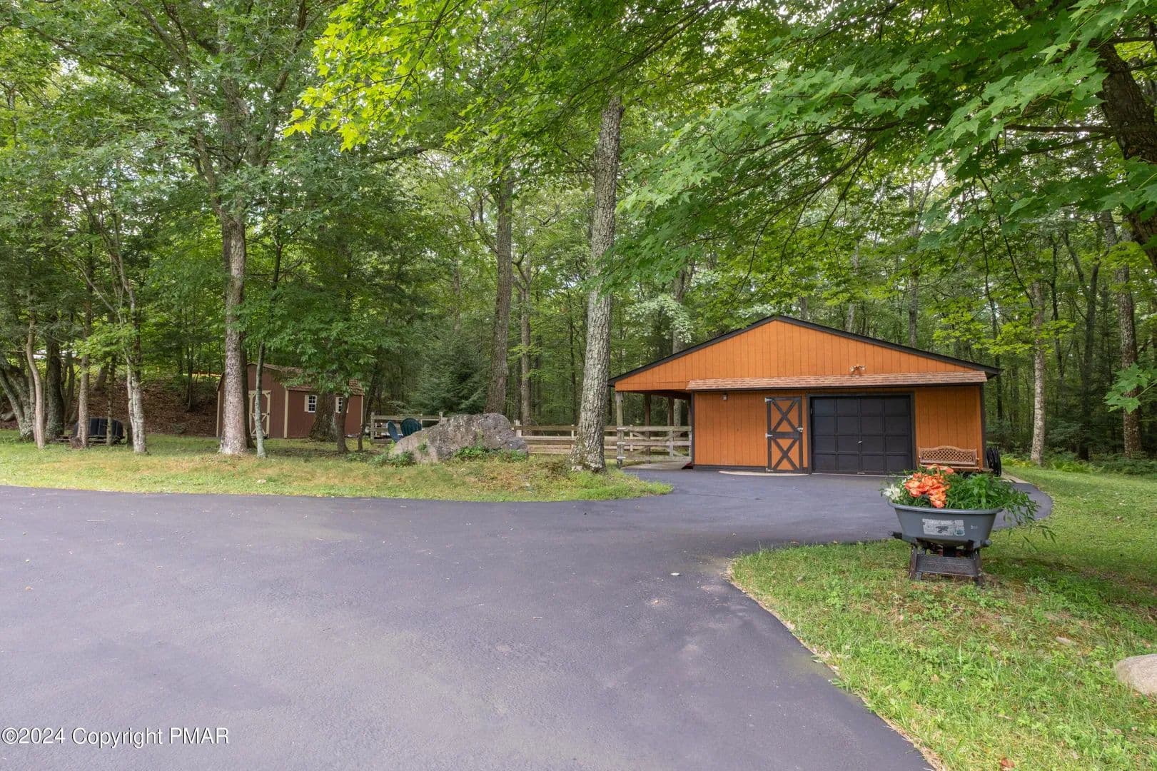 Escape to this 10.33 acres Serene Pocono Mountain Estate, perfect for Horse Enthusiasts and nature lovers! This stunning property boasts a horse stable, riding pastures, hiking trails, all nestled next to STATE GAME LANDS-*FEATURES*- Horse stable with 2 stalls and tack room- 2 acre Riding pastures and trails for endless horseback riding- Trout Stream and hiking trails for exploration and relaxation- Private and secluded setting with breathtaking mountain views-Spacious 2-bedroom, 1,1/2-bathroom home with hardwood floors, stone propane fireplace in Living room and wood burning Fireplace in Master bedroom for cozy winter nights. Kitchen features large granite counter top with connecting island. Property is approved for CLEAN&GREEN Benefits, Close proximity to Camelback ski resort & Outlet