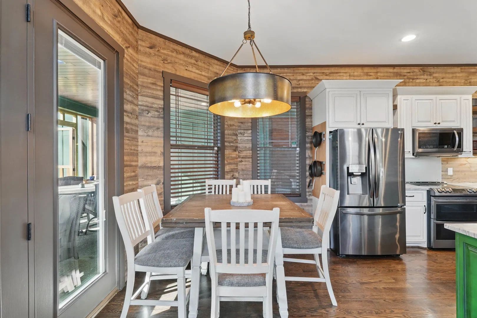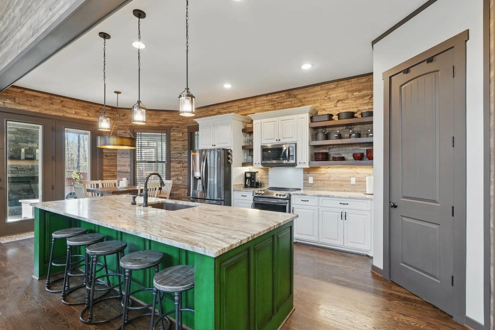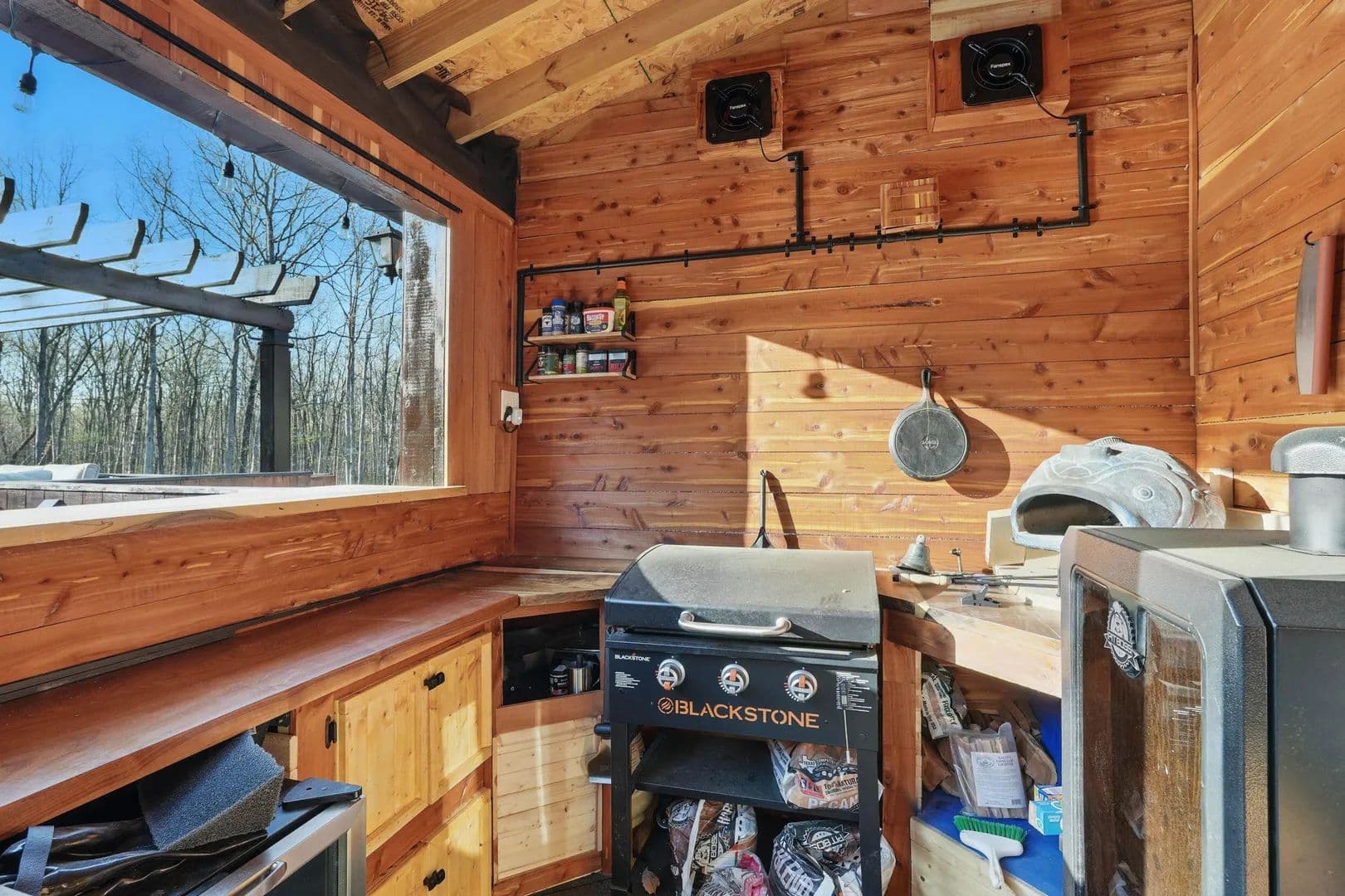 The pool and cabana include an outdoor kitchen with a pizza oven, Blackstone griddle, smoker, sink, and fridge—perfect for entertaining on a grand scale. The interior features synergy wood, rough-hewn solid pine, and hardwoods on the main floor, with hen-pecked cypress upstairs. Solid core doors and 10x10 cedar posts are throughout, with ten-foot ceilings on the main level and nine-foot ceilings above. Every nook and cranny has been meticulously planned.