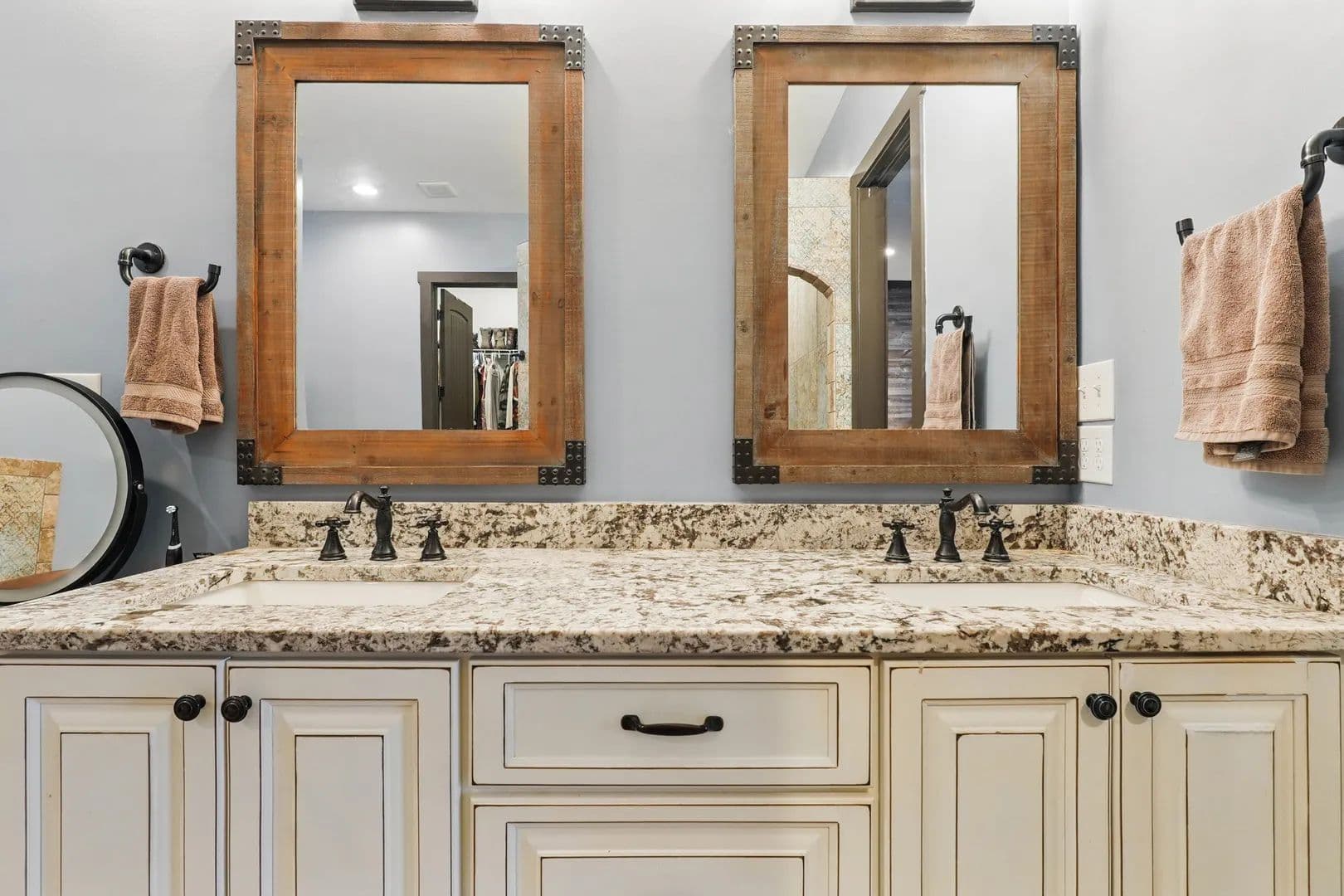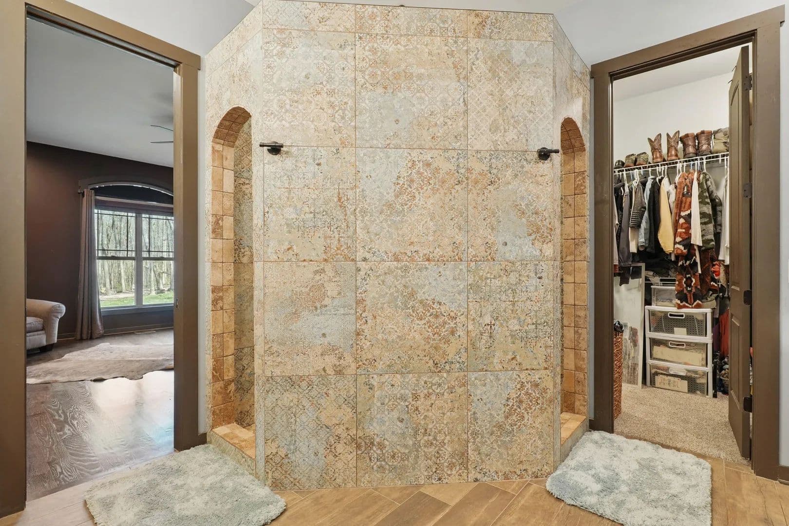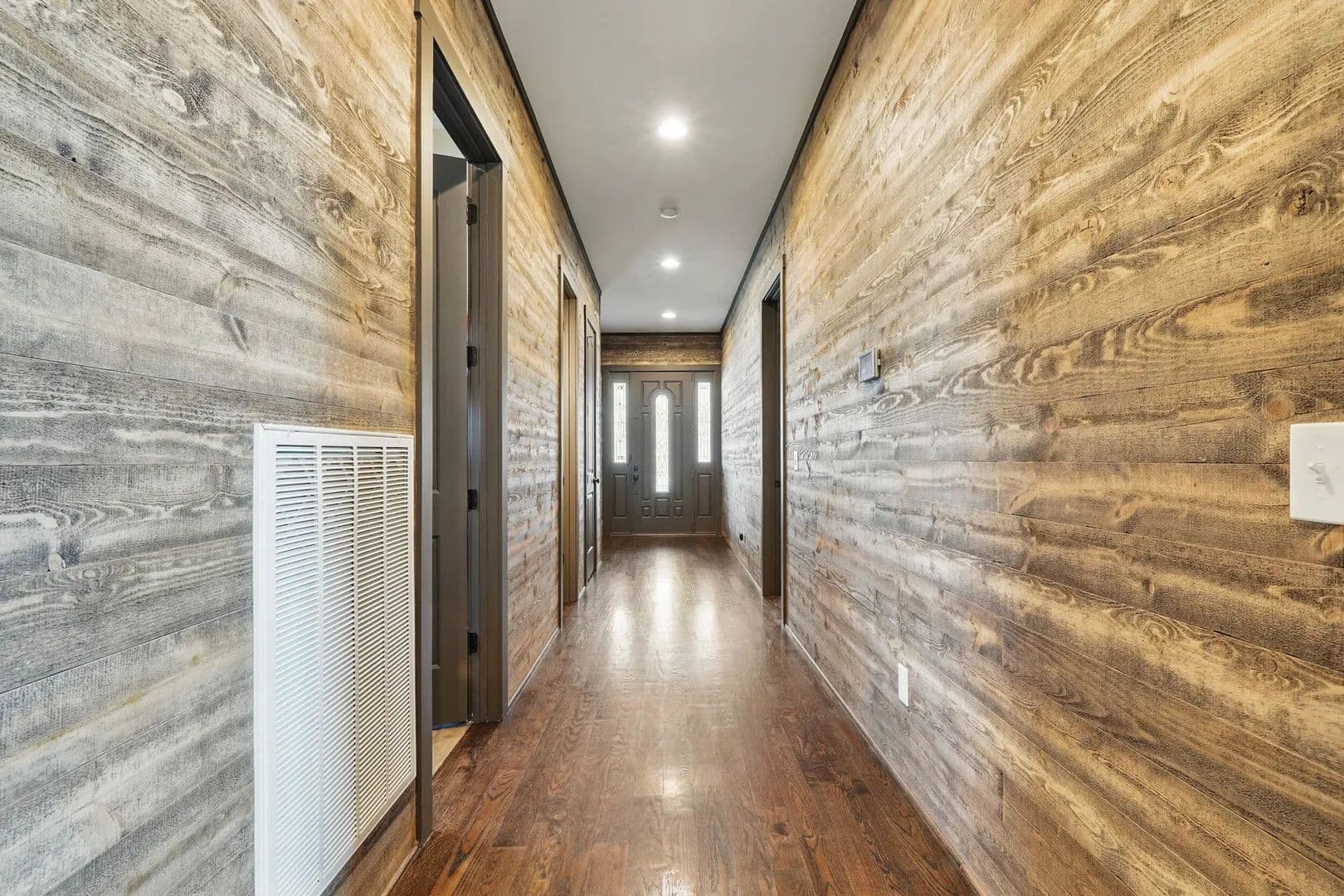 The pool and cabana include an outdoor kitchen with a pizza oven, Blackstone griddle, smoker, sink, and fridge—perfect for entertaining on a grand scale. The interior features synergy wood, rough-hewn solid pine, and hardwoods on the main floor, with hen-pecked cypress upstairs. Solid core doors and 10x10 cedar posts are throughout, with ten-foot ceilings on the main level and nine-foot ceilings above. Every nook and cranny has been meticulously planned.