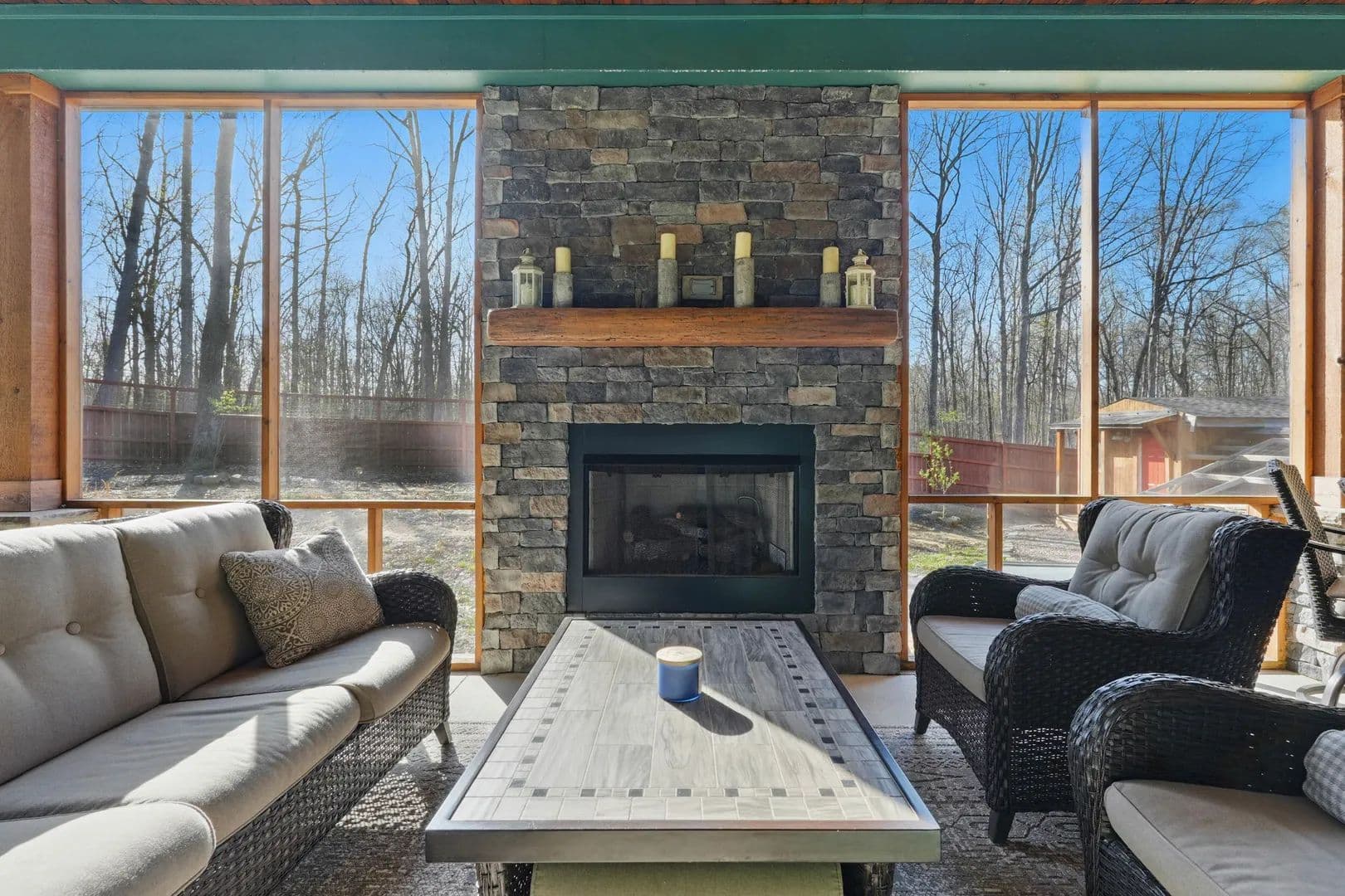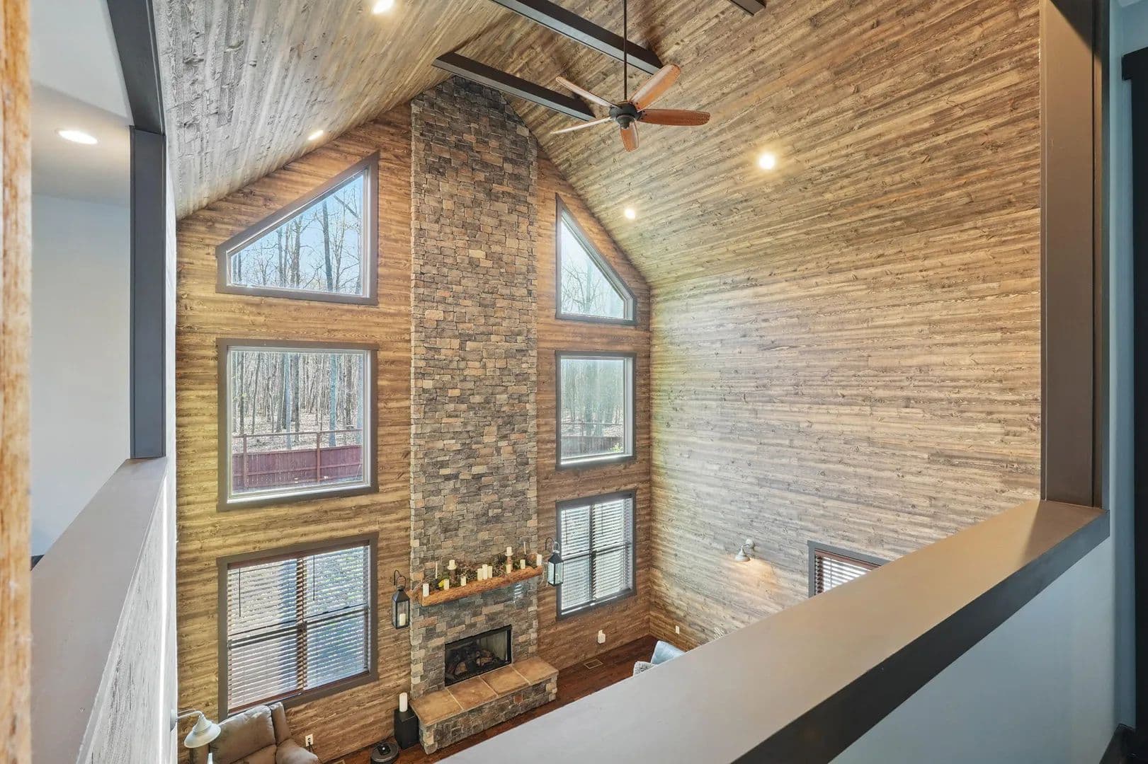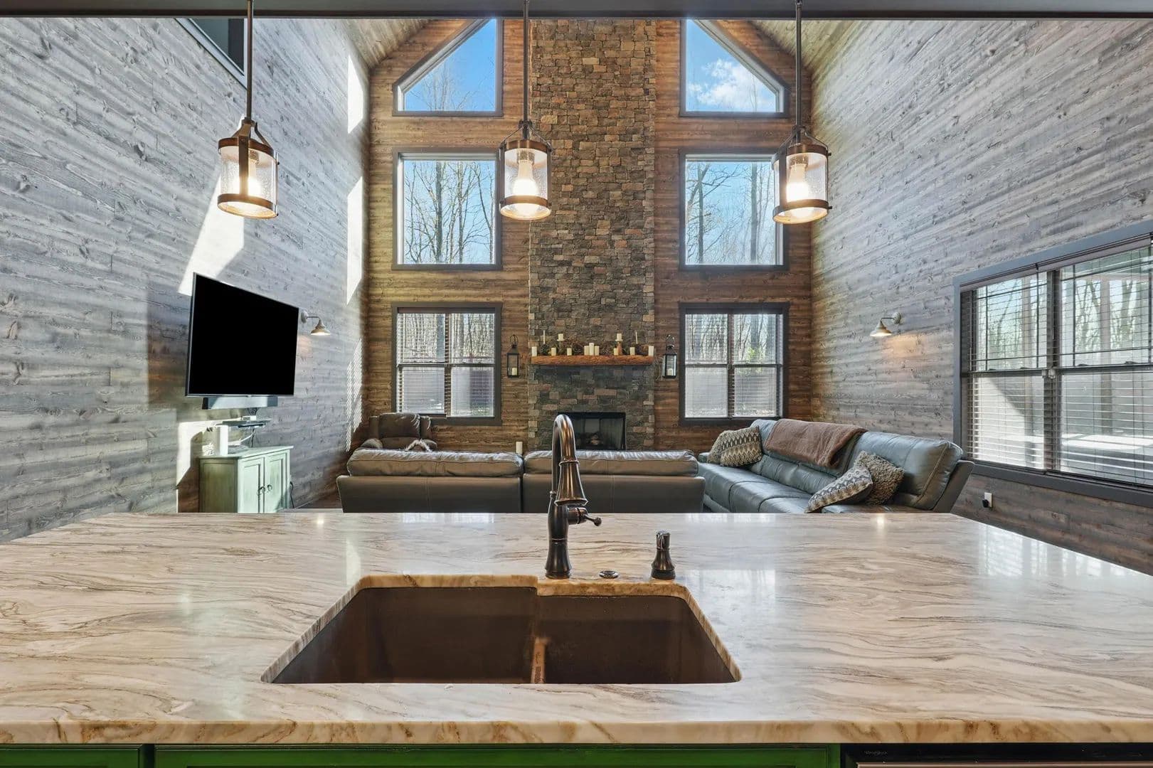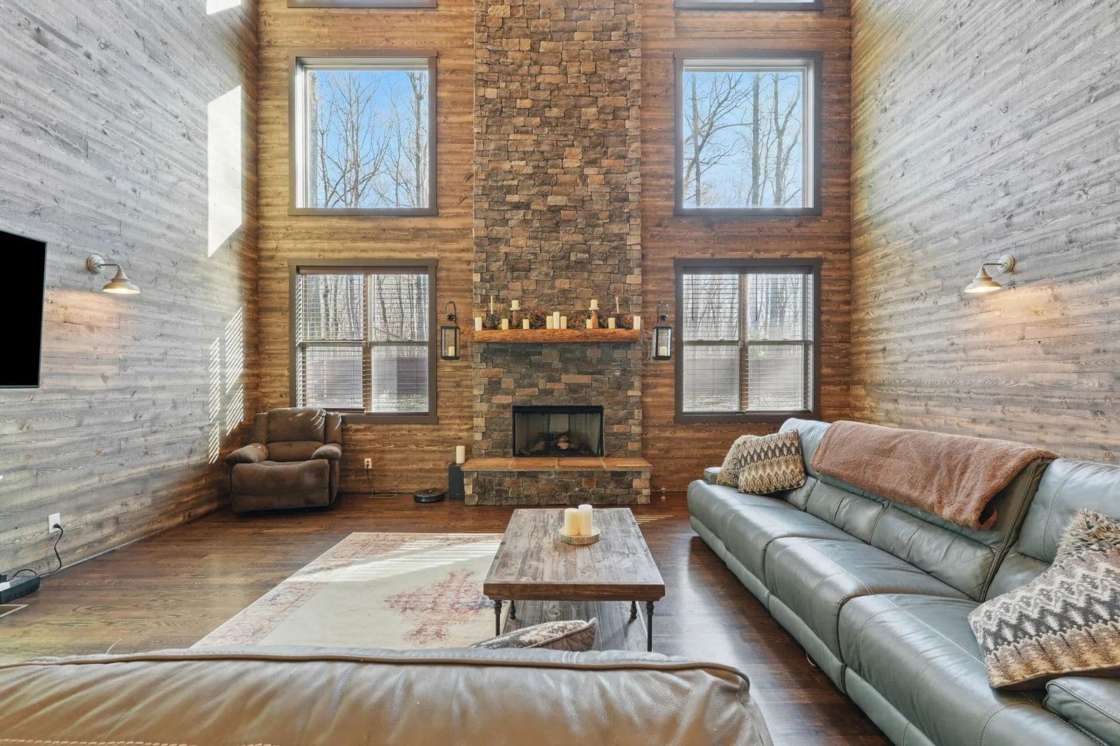 Step inside, and you'll be amazed by the great room, boasting a 38.5-foot vaulted ceiling with exposed beams and a stunning stacked stone fireplace that reaches all the way up. Flanked by a wall of windows, it feels like you're immersed in the forest behind this beautiful home. The open kitchen and eating area feature exquisite countertops, and the screened porch comes with a fireplace and hot tub.