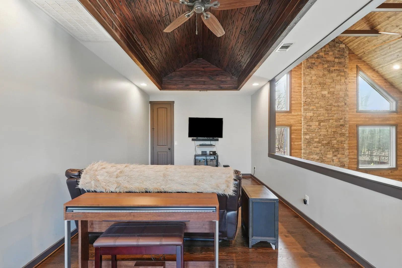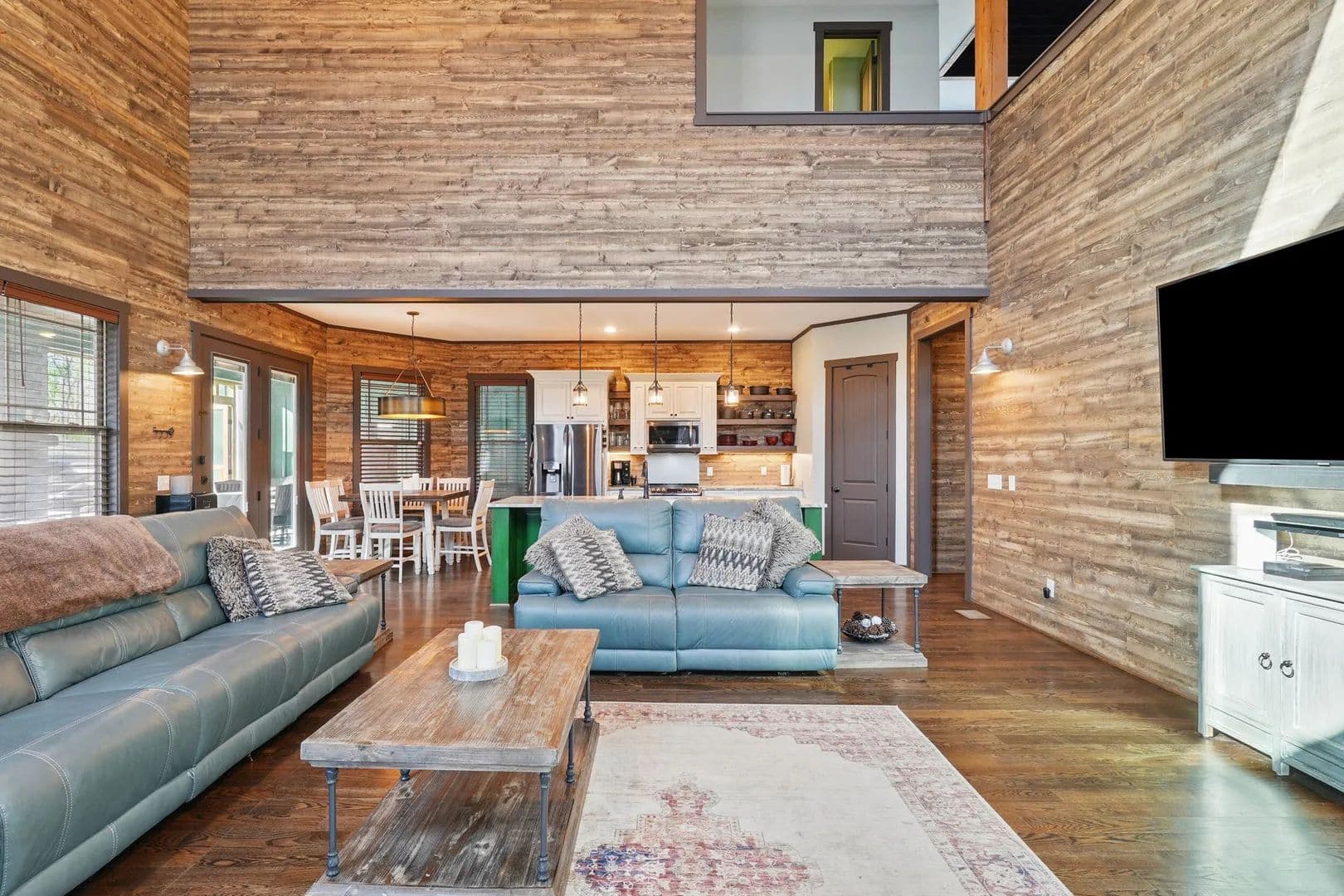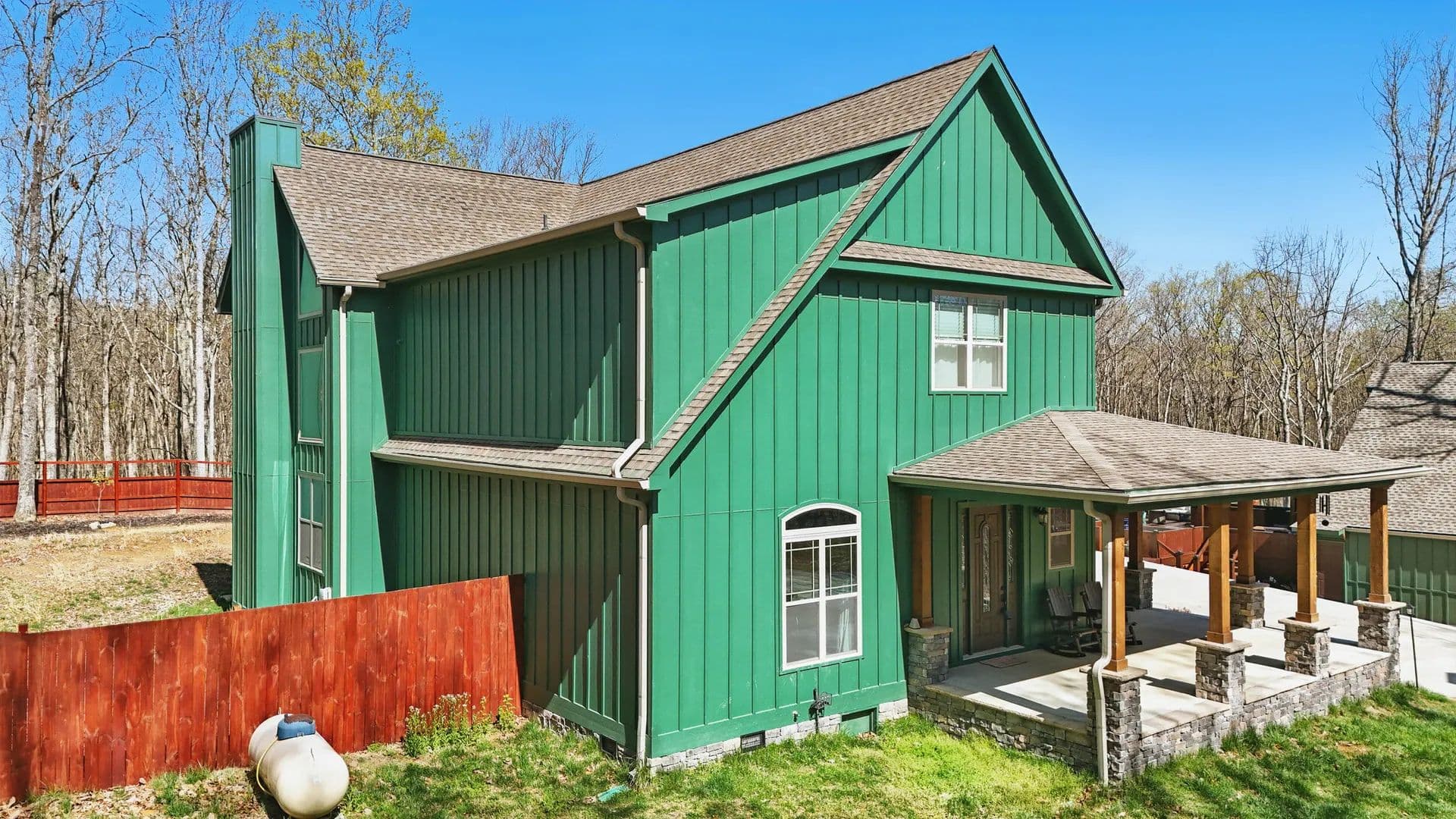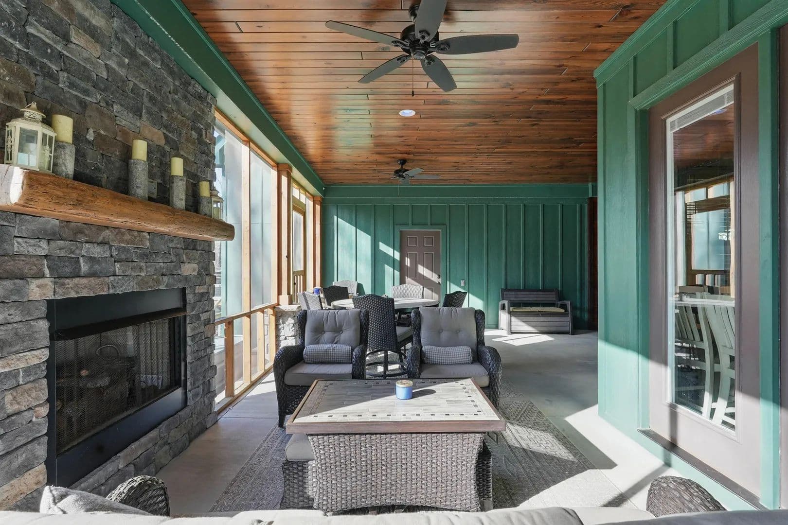 Step inside, and you'll be amazed by the great room, boasting a 38.5-foot vaulted ceiling with exposed beams and a stunning stacked stone fireplace that reaches all the way up. Flanked by a wall of windows, it feels like you're immersed in the forest behind this beautiful home. The open kitchen and eating area feature exquisite countertops, and the screened porch comes with a fireplace and hot tub.