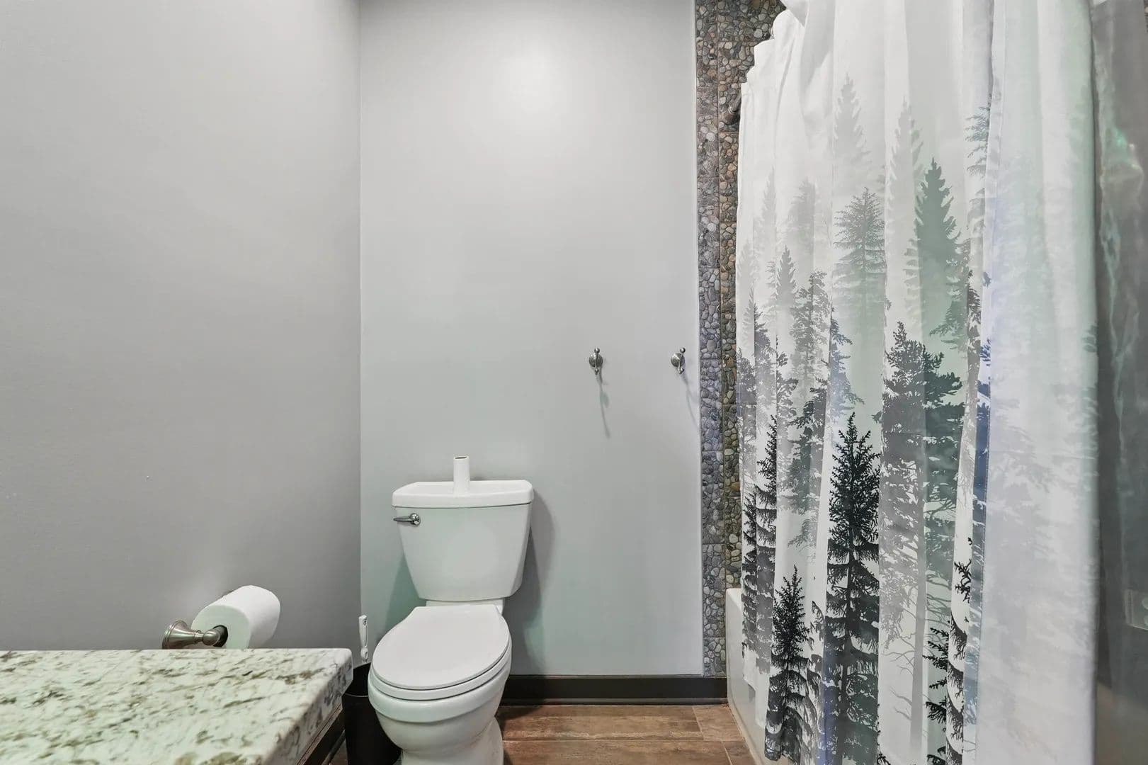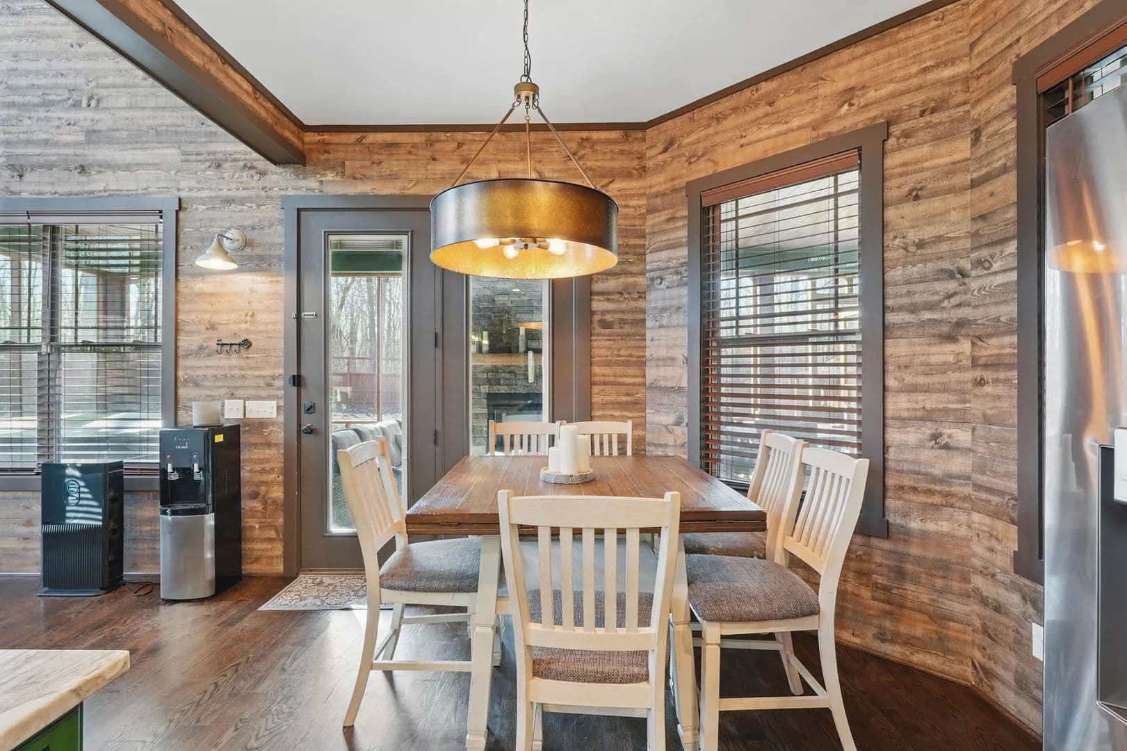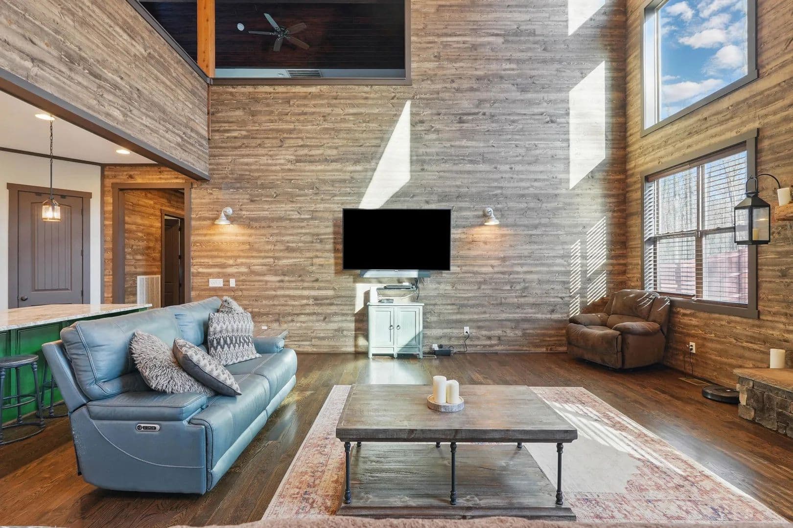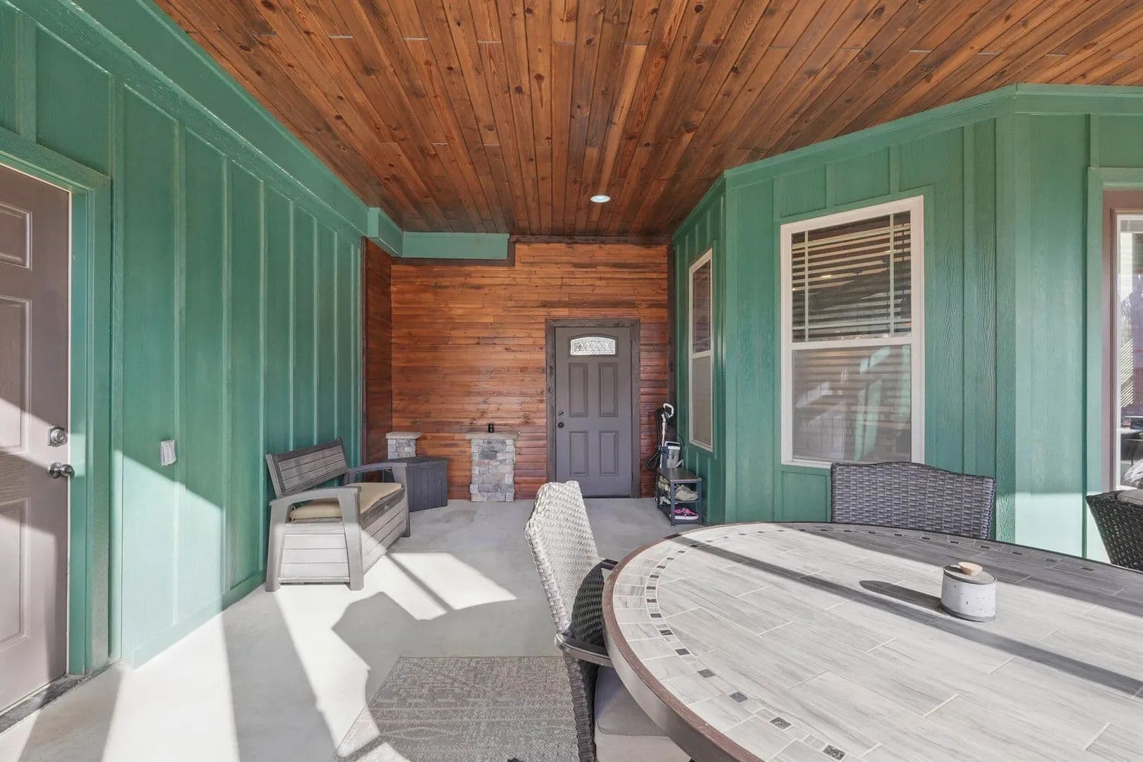 Step inside, and you'll be amazed by the great room, boasting a 38.5-foot vaulted ceiling with exposed beams and a stunning stacked stone fireplace that reaches all the way up. Flanked by a wall of windows, it feels like you're immersed in the forest behind this beautiful home. The open kitchen and eating area feature exquisite countertops, and the screened porch comes with a fireplace and hot tub.