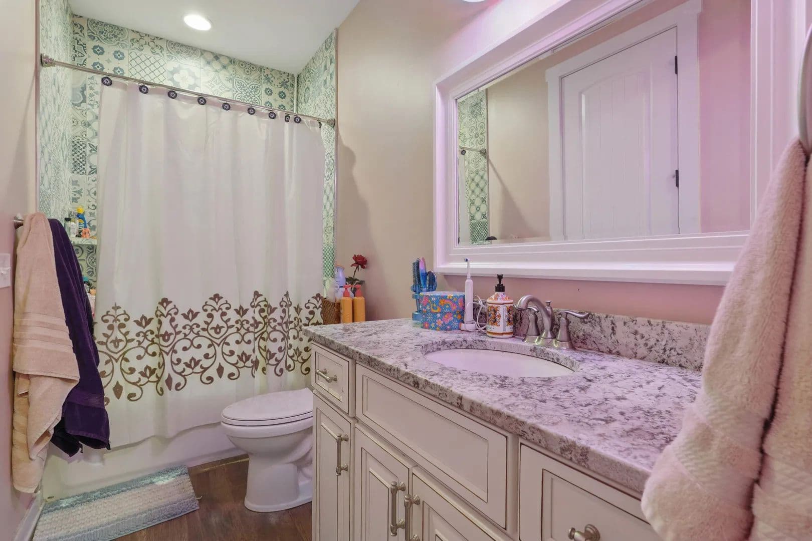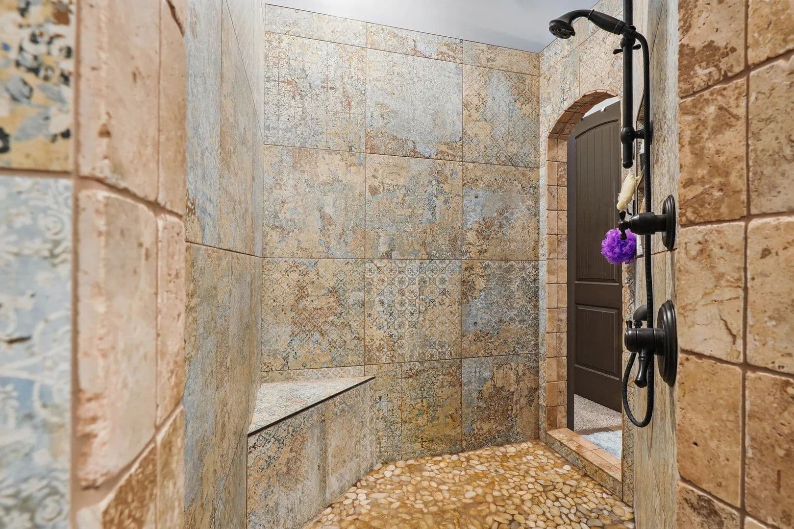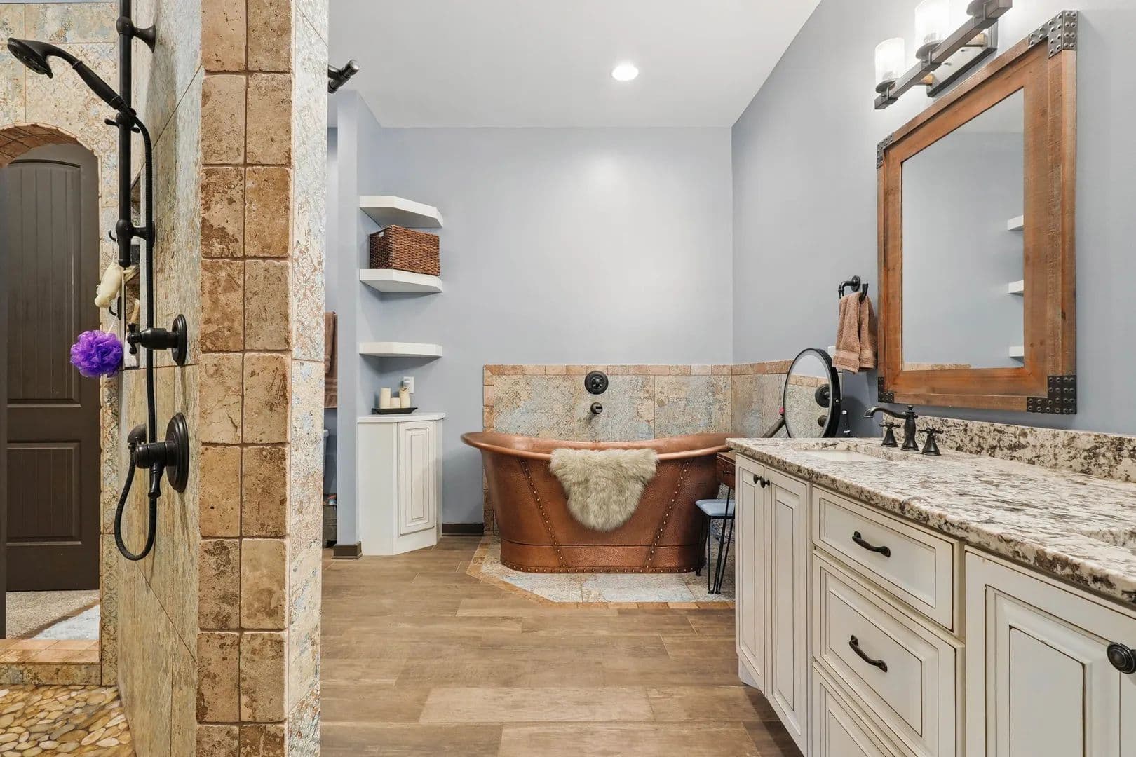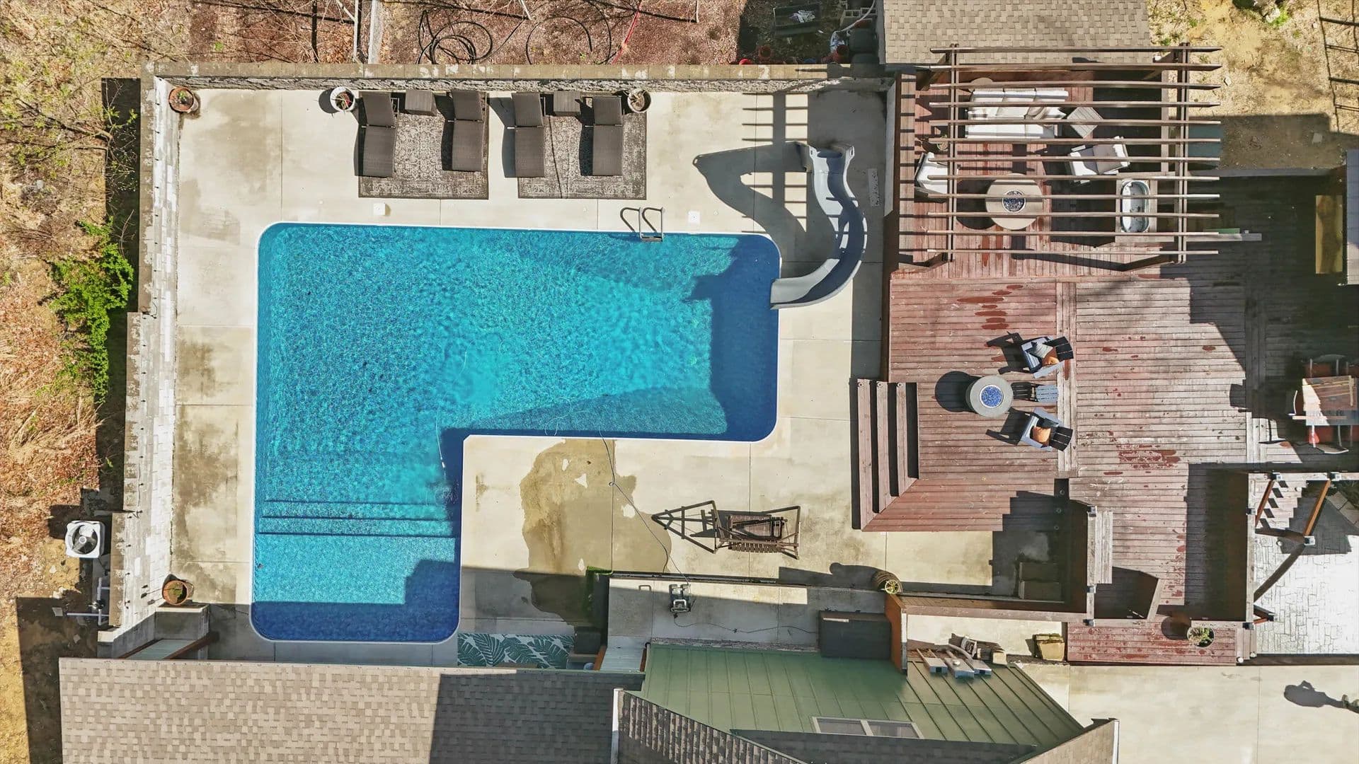 The main level primary suite is spacious and features a large walk-in closet, separate vanities, a grotto-tiled shower with river rock flooring, and a copper basin soaking tub, providing a spa-like experience every day. Upstairs, you'll find two bedrooms, two baths, a loft TV area, and an office area, along with pull-down floored storage above. Enjoy the covered wrap-around porch in the front and the screened porch with a fireplace and 5' x 6 hot tub, large enough to hold 4 - 5 adults. Boasting 1,330 square ft of decking, four feet up to nine feet deep pool, heated, with a swim up ledge four by twelve feet, terra grade liner four years old, four deck jets to arch water into the pool, pool lighting and cover will be good for years of relaxing, kids playing, and excellent exercise.
