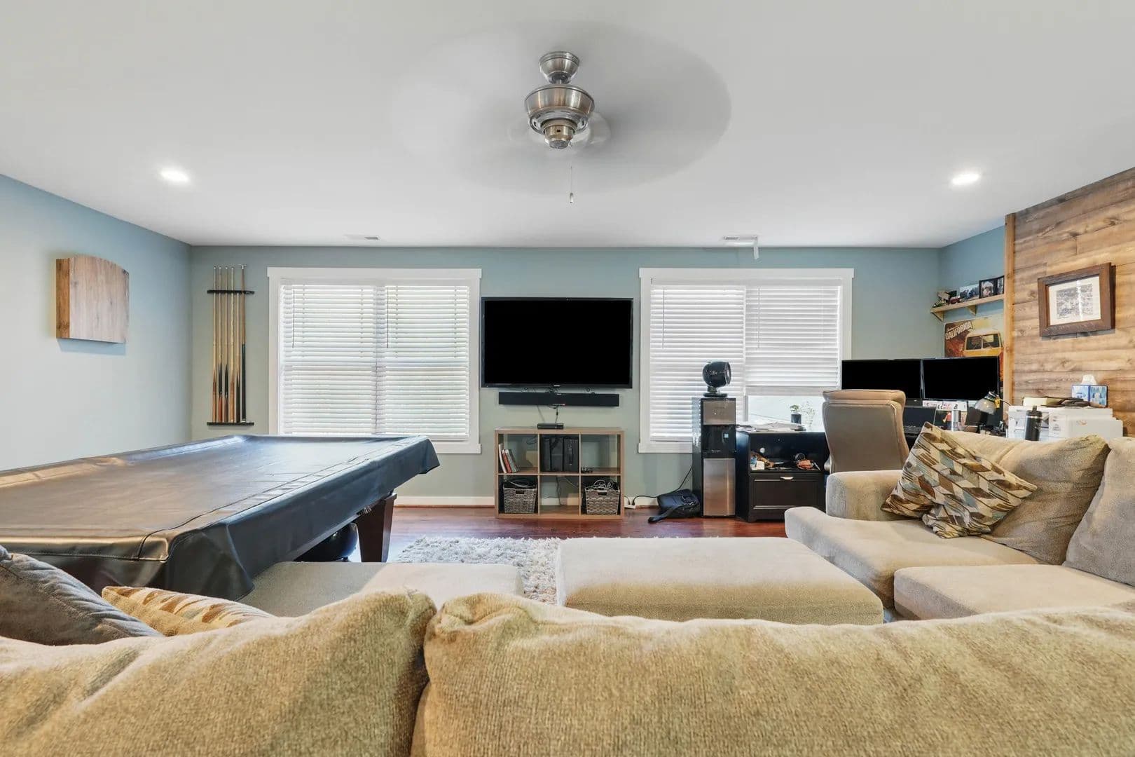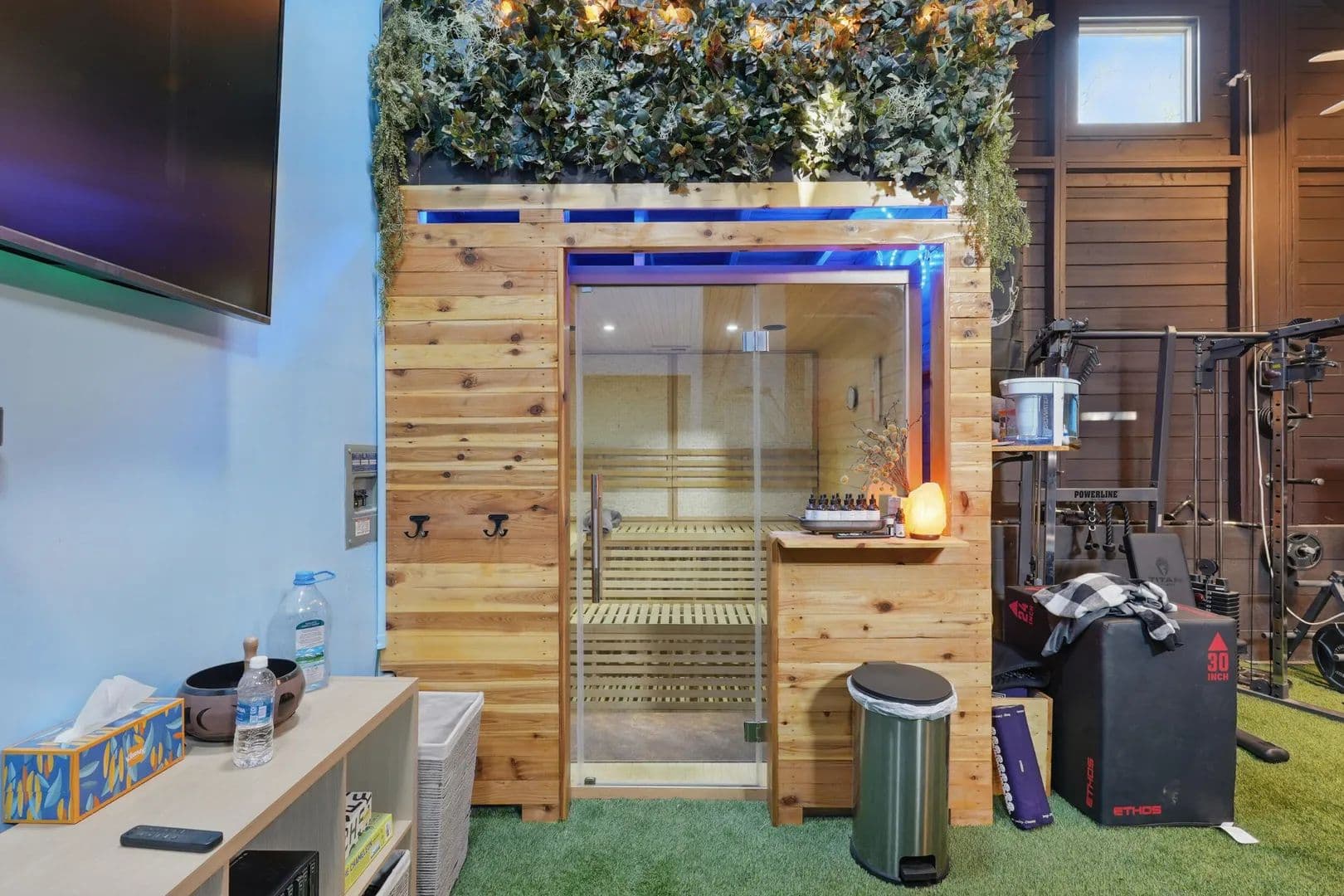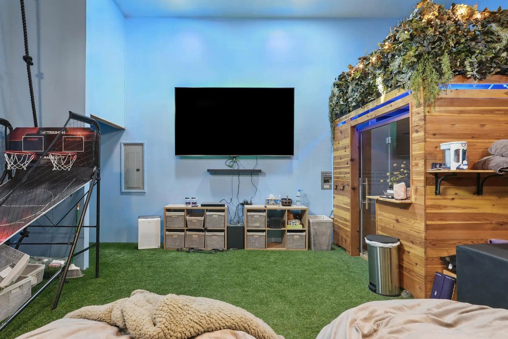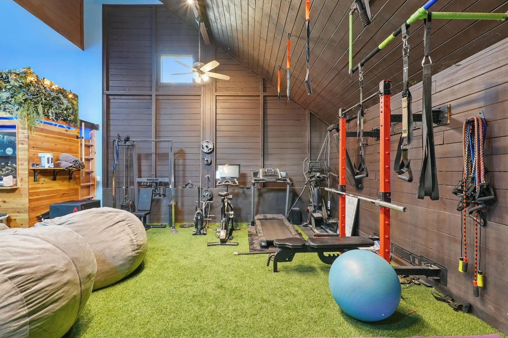 Don't forget to check out the gym with a built-in 2'x6' sauna, as well as an impressive media or game room with NFL-grade turf. There's also a ladder to the loft with storage and a hydraulic lift. Above the garage, there's a 960 sq. ft. studio living space featuring a full kitchen and full bath, perfect for a pool table and game room, or a spacious Accessory Dwelling Unit.