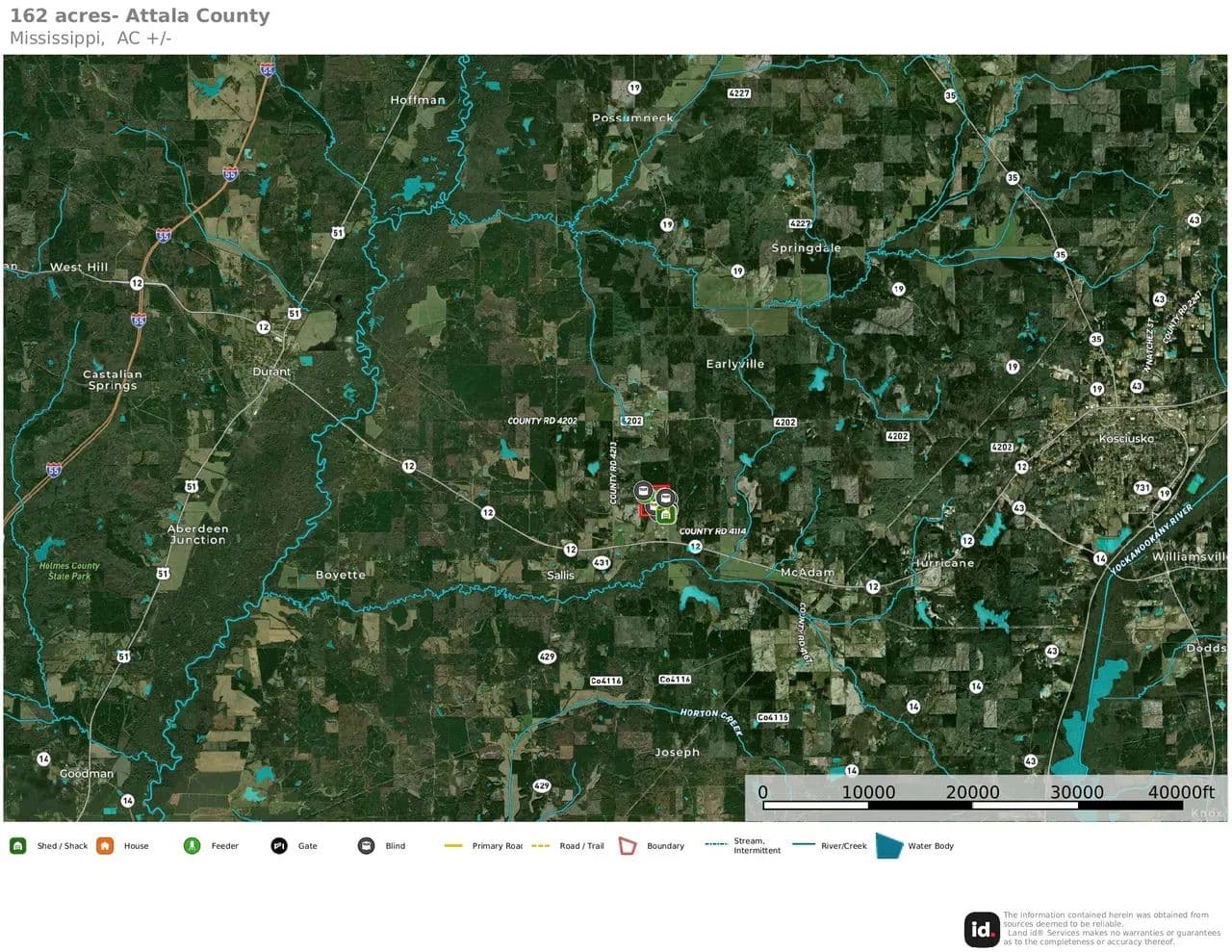 This 162± acre Attala County property truly has it all - hunting, income potential, access, and a place to stay. Located just 1/2 mile from MS Highway 12, 8 miles from Durant and Kosciusko, and 9 miles from Interstate 55, this property is easy to get to while still offering privacy and seclusion.