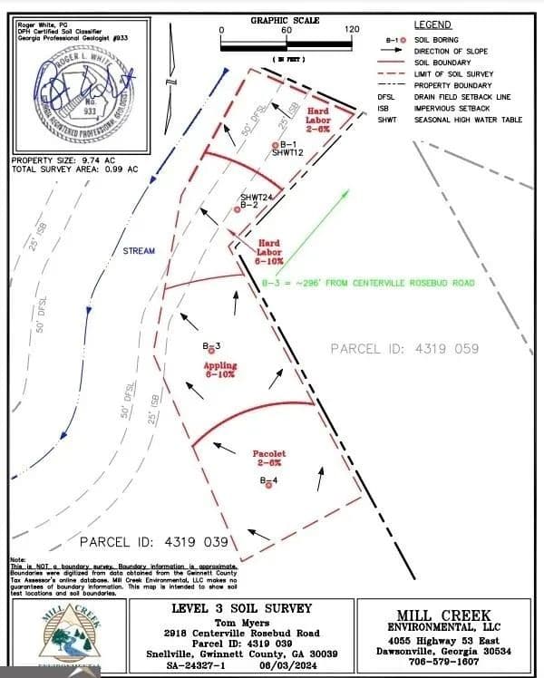 Fabulous vacant lot adjacent to Lenora Park. This wooded lot is just shy of 10 acres, and would make a wonderful a wonderful home site. Imagine building a few homes on this site, or maybe create a family compound? The possibilities are up to you! Lenora Park has fun ball fields, walking trails, playgrounds, and much more. Imagine walking from your property onto the beautiful park next door. Property is beside 2938 and 2914 Centerville Rosebud Rd. The last picture shows the results of 1 acre, of the 9.74 available, being soil tested (Perk Test).