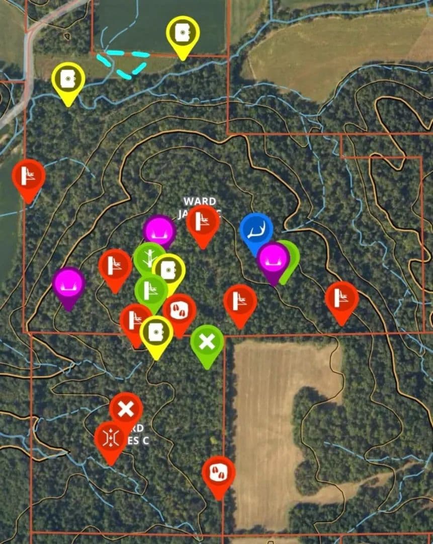 The property offers exceptional whitetail deer habitat and has been professionally designed and improved by renowned whitetail habitat specialist Jim Ward. Extensive habitat work has been completed, including a well-established internal road system, strategically placed food plot areas, and substantial hinge cutting, creating incredible thick cover and security habitat.