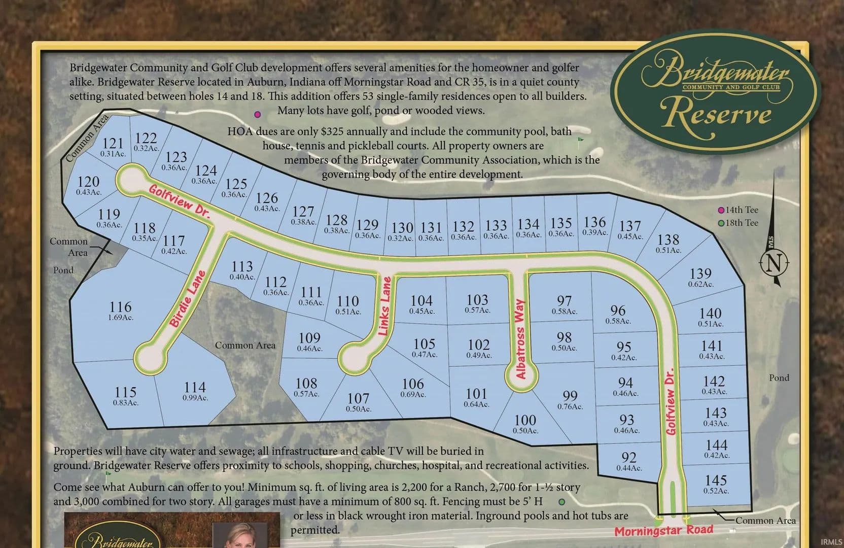 Pond lot located within Bridgewater Reserve on Hole #15 of Bridgewater Golf Course. Nice lot for a daylight nor walkout basement. One story home minimum sq ft 2,200. Two Story min. 3,000 combined plus an 800 sq ft garage. Low HOA dues with access to a community pool, tennis/pickleball courts.