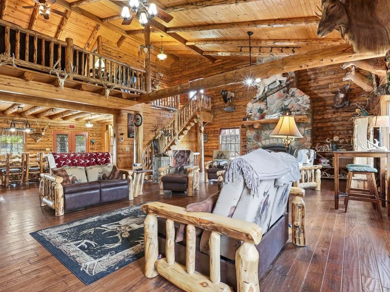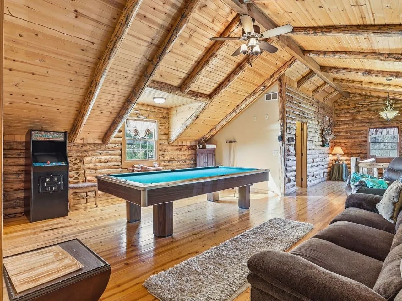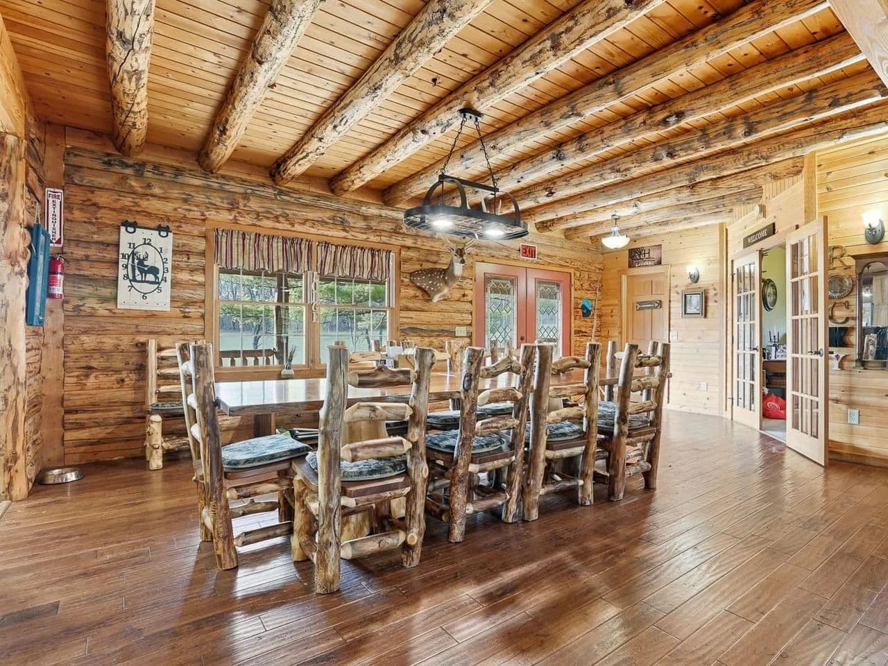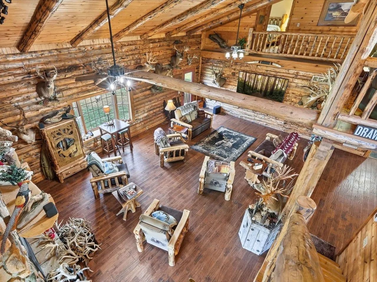 The main lodge is a fully furnished 4,636+ square foot log cabin designed to accommodate large groups comfortably. It offers six bedrooms, four bathrooms, an office area, a large mudroom, and a spacious living room featuring a stone gas fireplace and hardwood floors. The kitchen is open to the dining area and includes stainless steel appliances, hickory cabinetry, a breakfast island, and tile flooring. A loft-level game room includes a pool table and a full-size arcade game. The full basement provides additional bedrooms, a large storage area, a laundry space, and a full bathroom. The lodge is serviced by natural gas heat, central air conditioning, a private well, and a septic system, with multiple covered porches and decks that extend the living space outdoors.