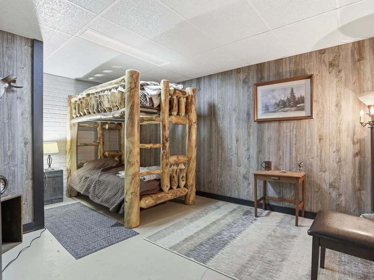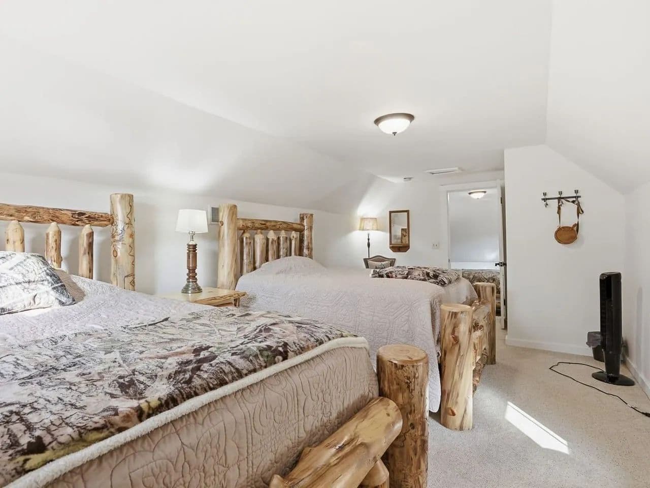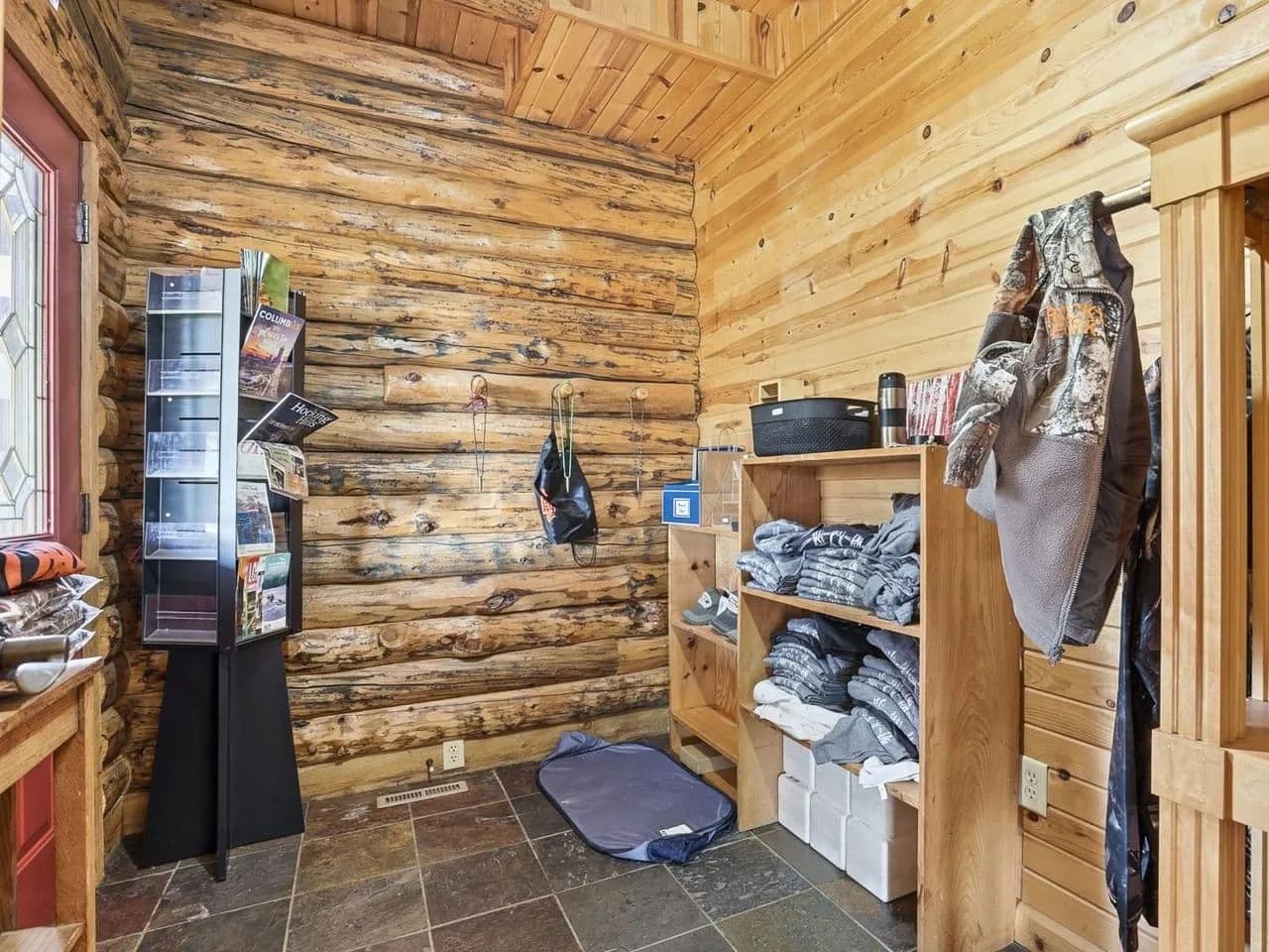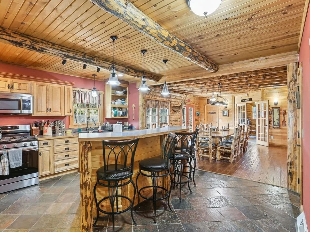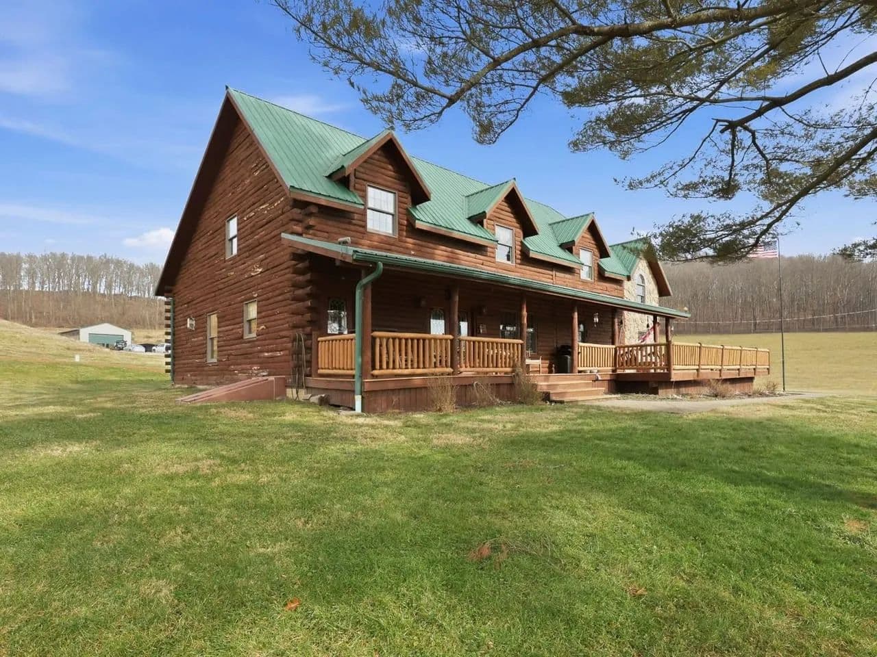 The main lodge is a fully furnished 4,636+ square foot log cabin designed to accommodate large groups comfortably. It offers six bedrooms, four bathrooms, an office area, a large mudroom, and a spacious living room featuring a stone gas fireplace and hardwood floors. The kitchen is open to the dining area and includes stainless steel appliances, hickory cabinetry, a breakfast island, and tile flooring. A loft-level game room includes a pool table and a full-size arcade game. The full basement provides additional bedrooms, a large storage area, a laundry space, and a full bathroom. The lodge is serviced by natural gas heat, central air conditioning, a private well, and a septic system, with multiple covered porches and decks that extend the living space outdoors.