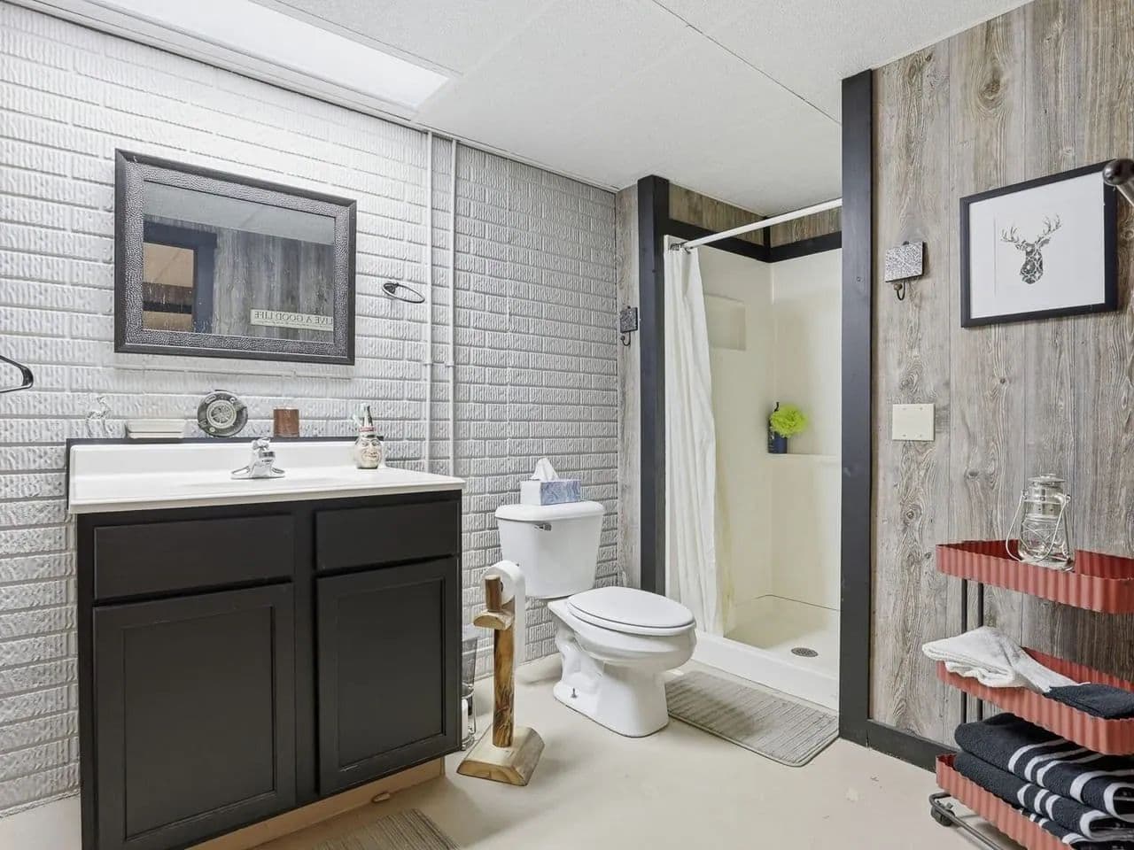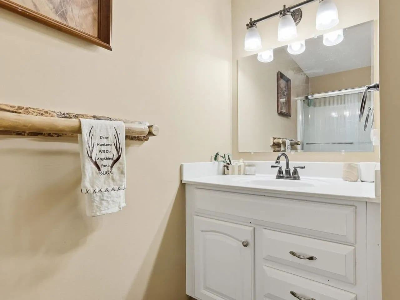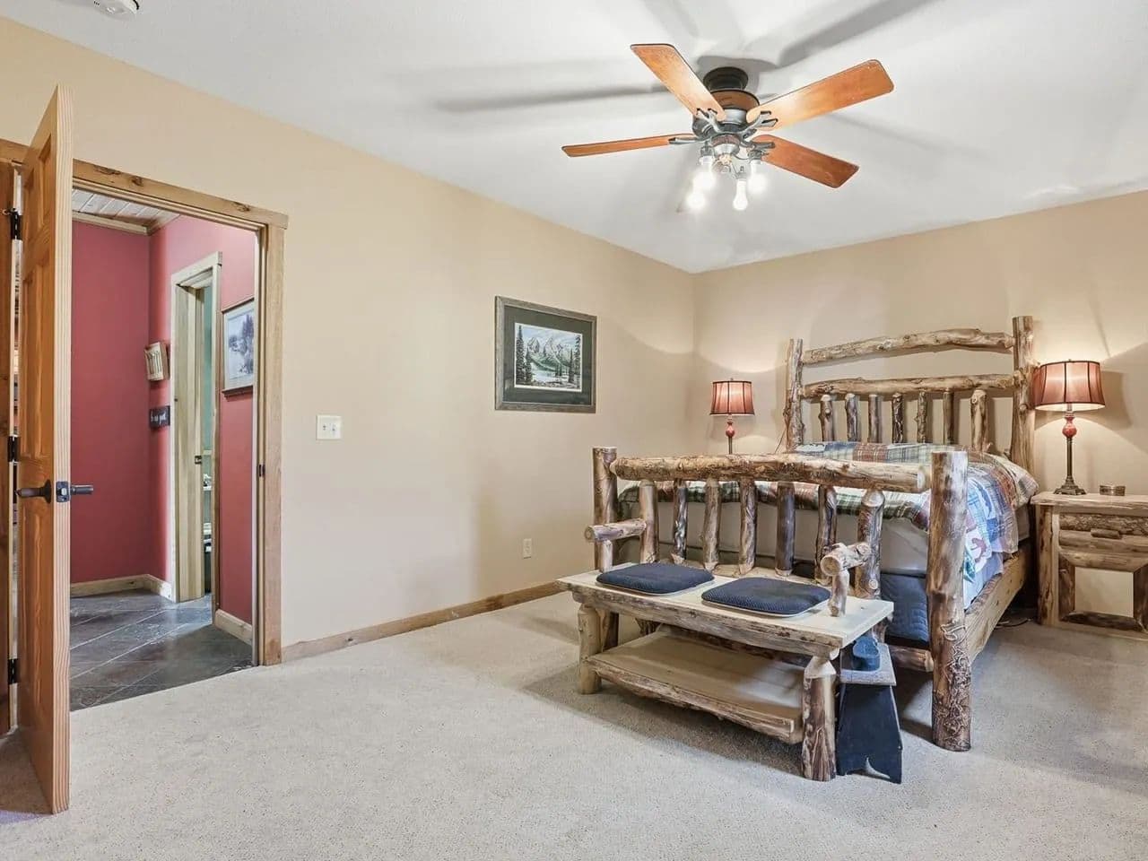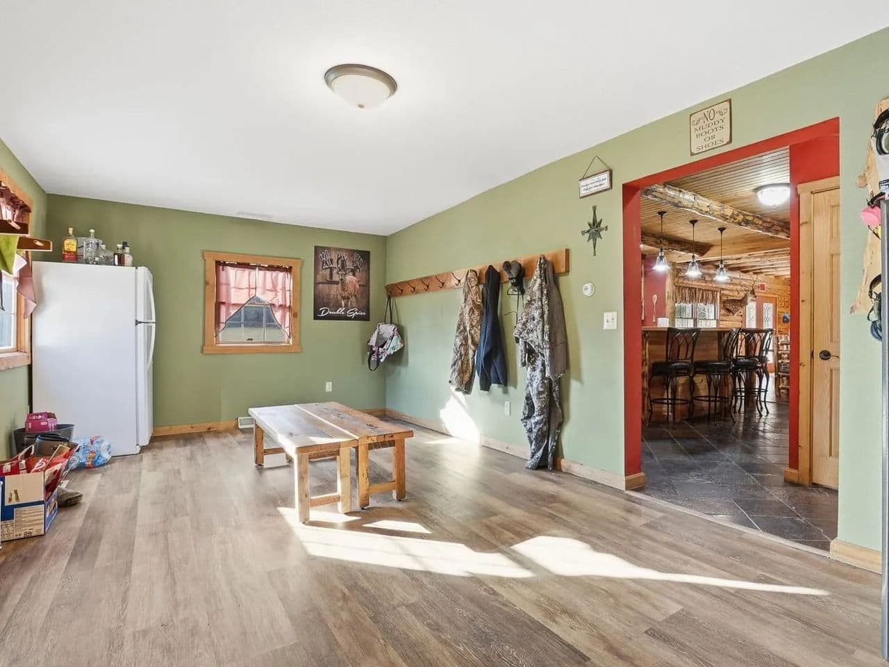 The main lodge is a fully furnished 4,636+ square foot log cabin designed to accommodate large groups comfortably. It offers six bedrooms, four bathrooms, an office area, a large mudroom, and a spacious living room featuring a stone gas fireplace and hardwood floors. The kitchen is open to the dining area and includes stainless steel appliances, hickory cabinetry, a breakfast island, and tile flooring. A loft-level game room includes a pool table and a full-size arcade game. The full basement provides additional bedrooms, a large storage area, a laundry space, and a full bathroom. The lodge is serviced by natural gas heat, central air conditioning, a private well, and a septic system, with multiple covered porches and decks that extend the living space outdoors.