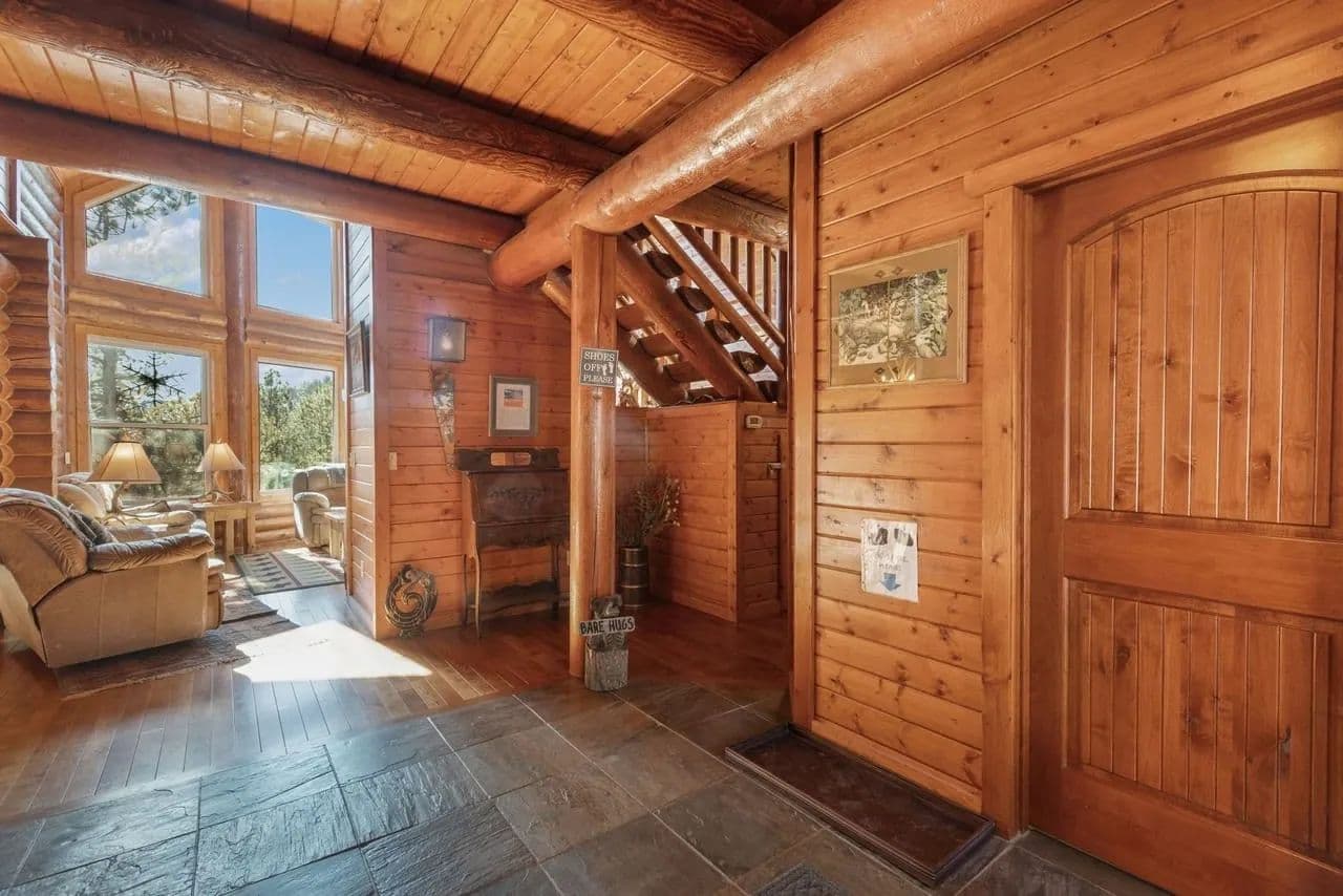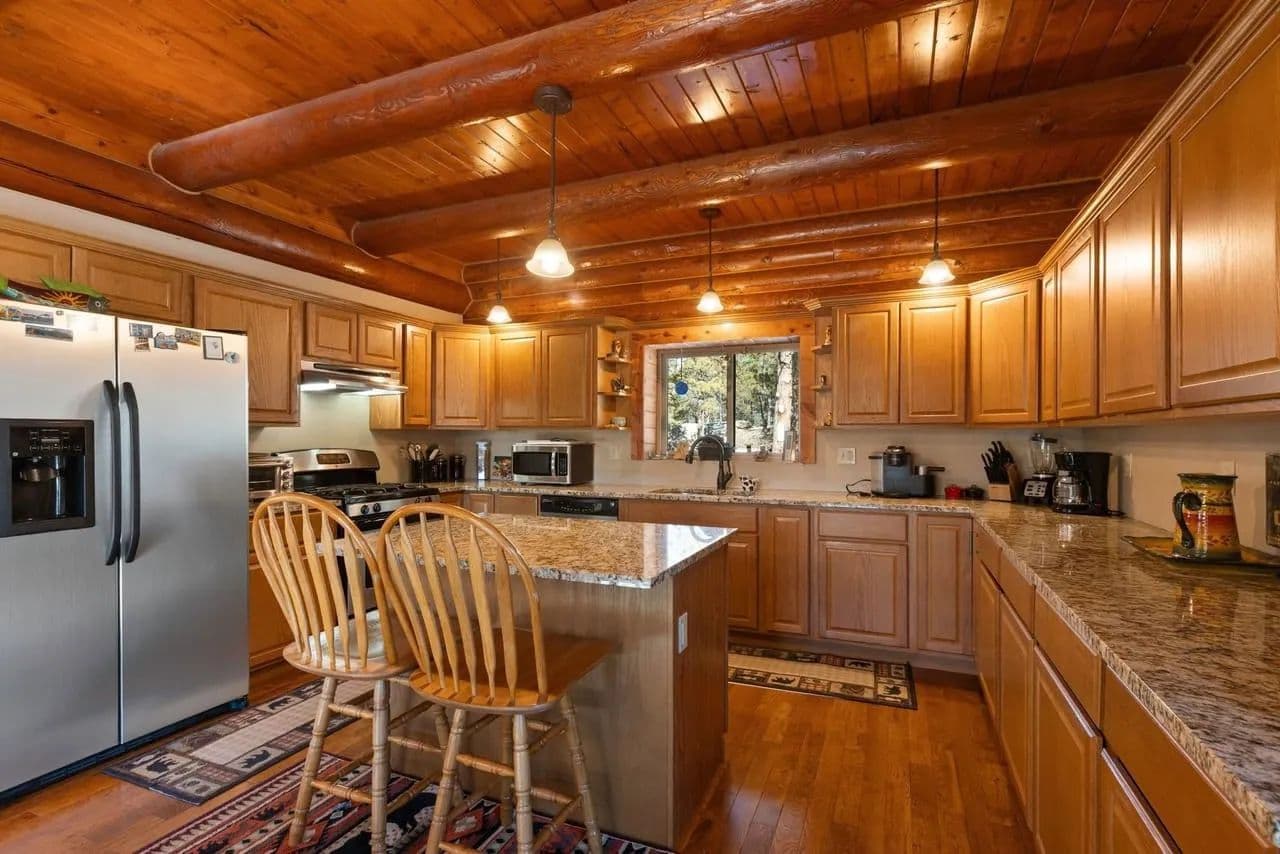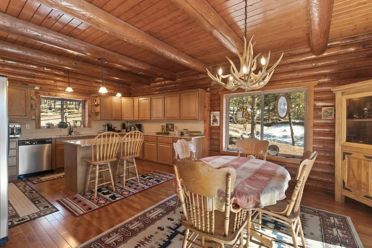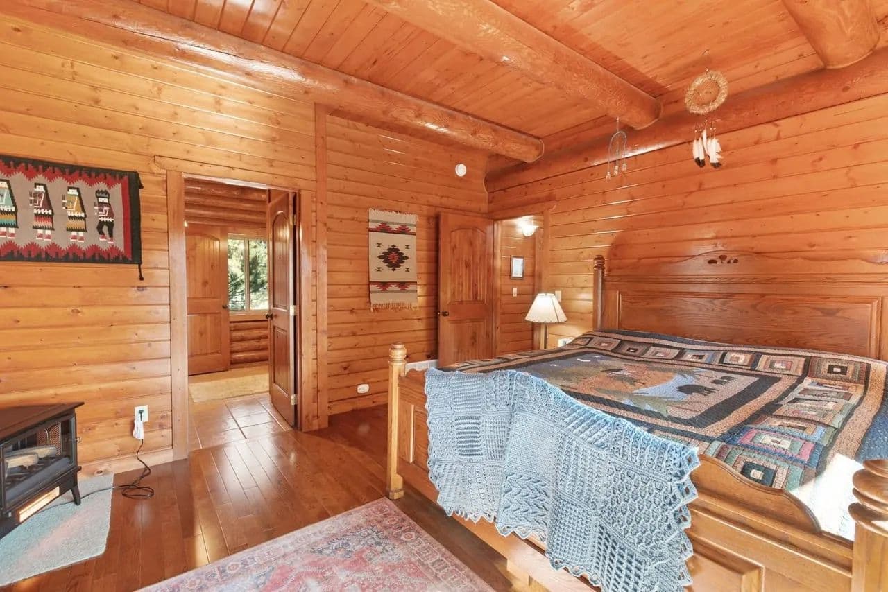 Beautiful turnkey log home on 5 plus acres. Hidden and nestled in the towering Ponderosa pines, quaking aspen and huge moss rock boulders throughout. Three bedroom, 2.5 baths. 2,476 square feet. High quality construction, vaulted ceilings, fireplace, hardwood floors and prow front. Well priced at $825,000.