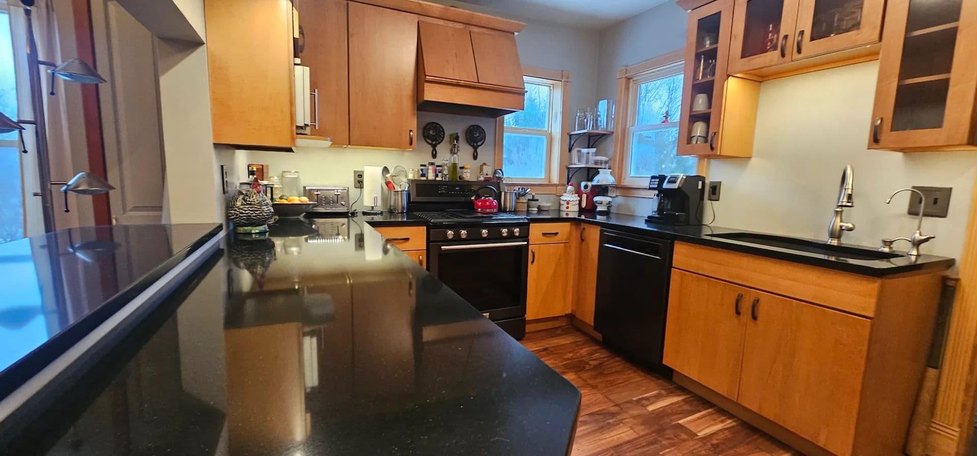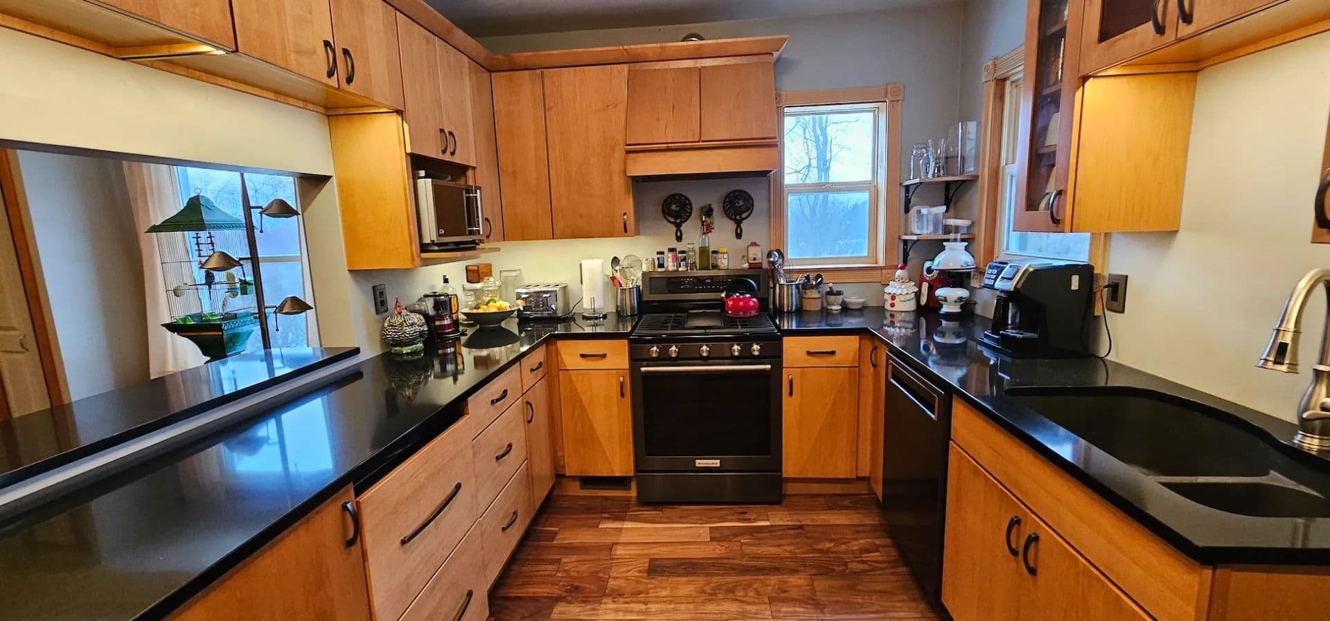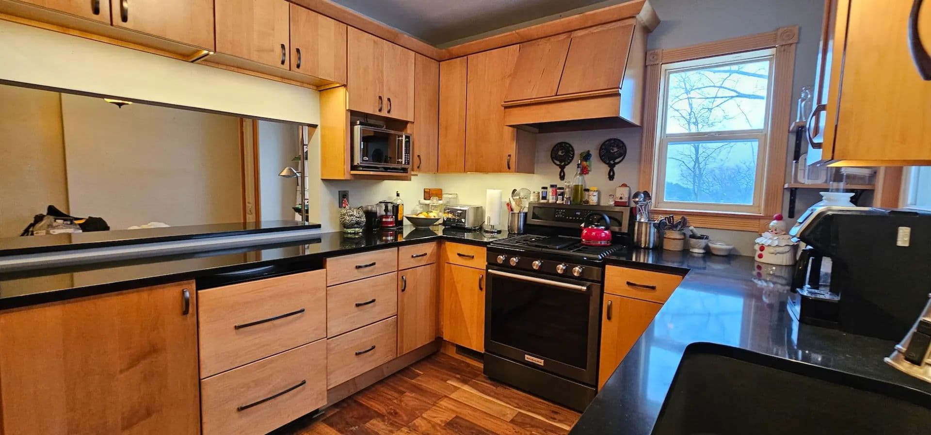 The modernized kitchen is standout featuring natural stone countertops, custom maple cabinets with soft-close drawers, a built-in refrigerator, built-in dishwasher, deep farmhouse-style well sink, and a dedicated cabinet mixer stand. Newer appliances and updated windows, siding, and mechanicals ensure efficiency and peace of mind. A designated laundry room adds convenience, and the washer and dryer convey with the sale. Central heat and air conditioning provide year-round comfort.