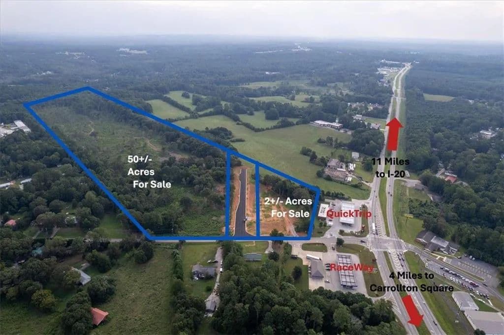 50 +/- Acres with Road Frontage of Unimproved Land. Only 11 miles from I-20 and 4 miles from Downtown Carrollton. Zoned Light Industrial in the City of Carrollton. Easy access to 61 with traffic light. All utilities are on the property with 12" water main and sewer. Additional 2 +/- Acres with Road Frontage available under separate listing.