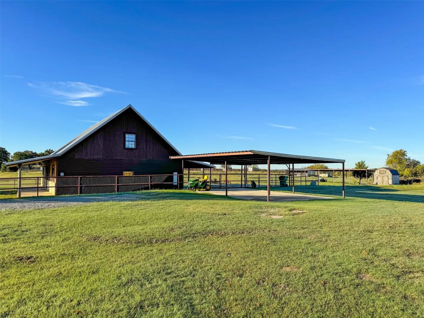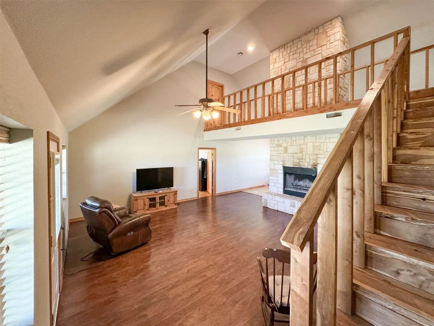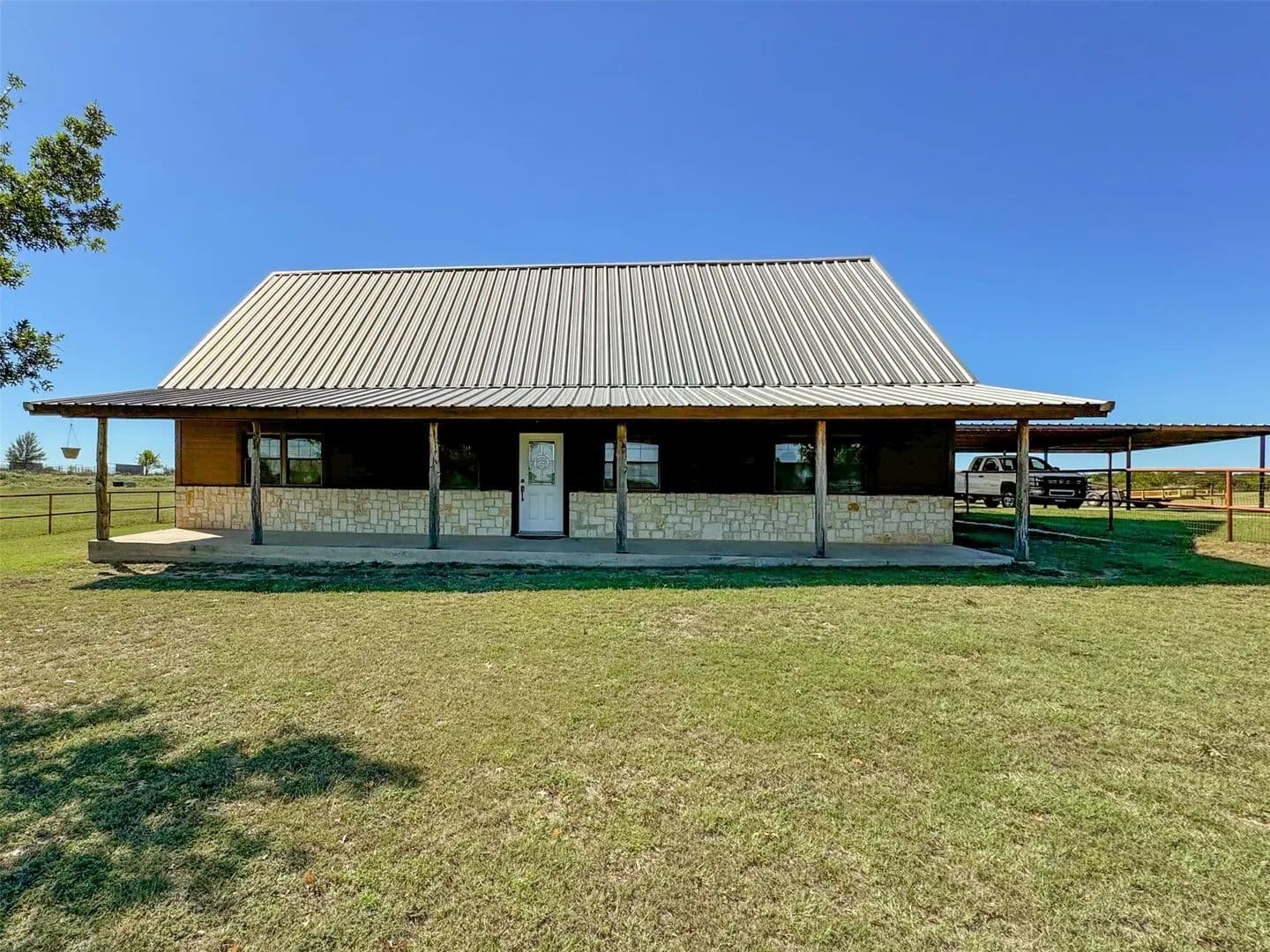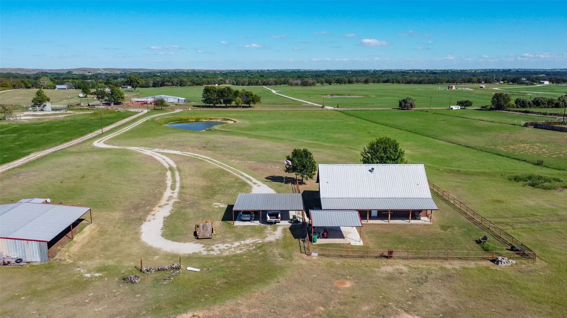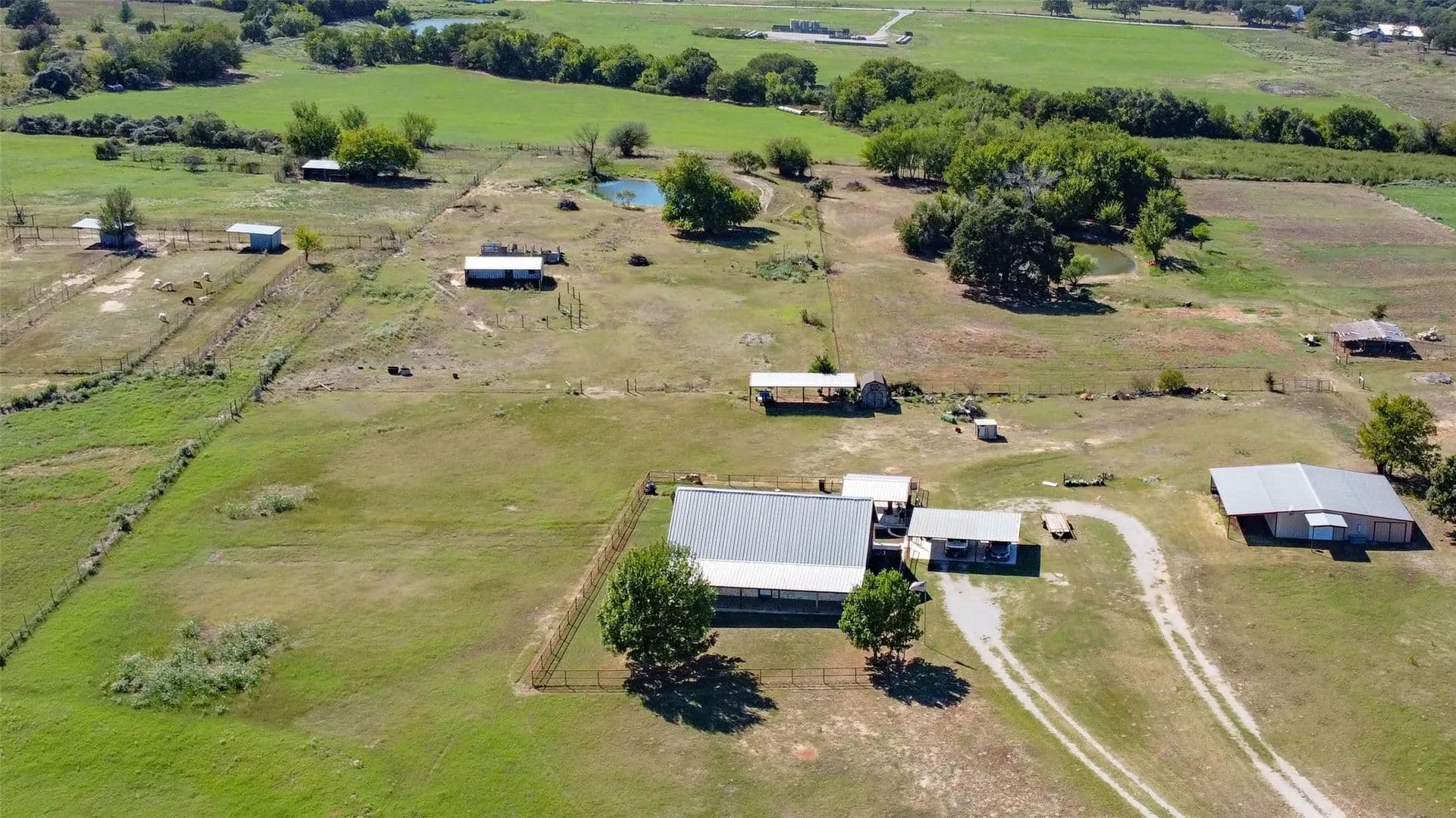 This Beautiful 10.743-acre AG-exempt property offers peaceful living for those seeking space and privacy. The home features an open floorplan with 4 bedrooms, 3.5 baths and vaulted ceilings. A spacious family room boasts a stunning 2-story stone fireplace. The master suite and an additional bedroom are located downstairs, while two bedrooms upstairs each have en-suite bathrooms and walk-in closets. Recent updates include fresh paint, granite countertops in the kitchen, quartz in the master bathroom and new plumbing fixtures. Built with ICF block, the home is both energy-efficient and quiet. Sit back and enjoy the outdoors or entertain with large covered porches at the front and back. The property also features a 40' x 45' metal barn complete with an office and loafing shed plus additional out buildings and 2 ponds that have never gone dry. The land is fully fenced, providing ample space for kids, pets, or livestock to roam freely. Main barn (40 X 30) has concrete floor with electricity, no water and a 20 X 12 office. South side has a loafing shed (40 X 15) no concrete, could easily accommodate 3 stalls. The north side (40 X 15) storage area with double doors and concrete floor. There is a breaker box to add more electricity to the sides if needed. The smaller barn in the back of the property is set up for 2 stalls with feed-tack room with concrete floor, no electricity or water.
